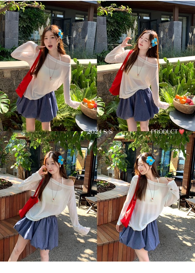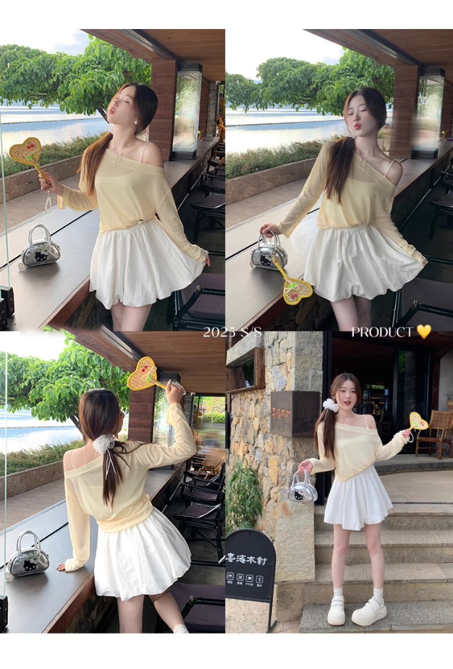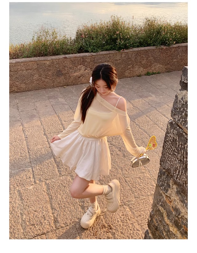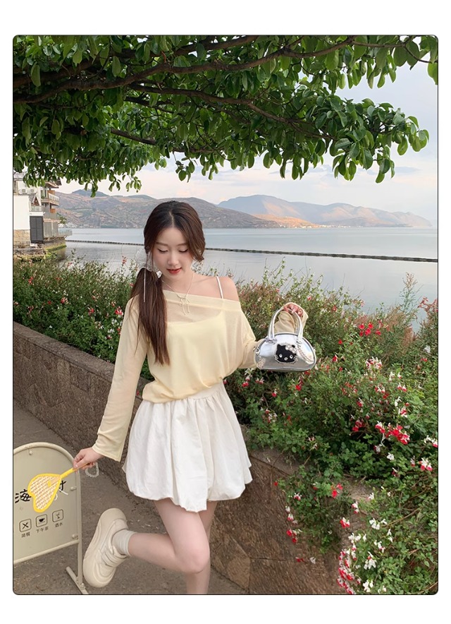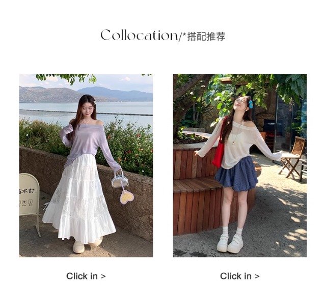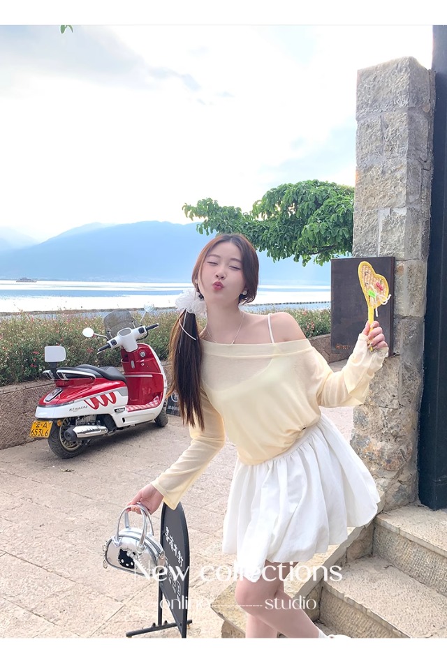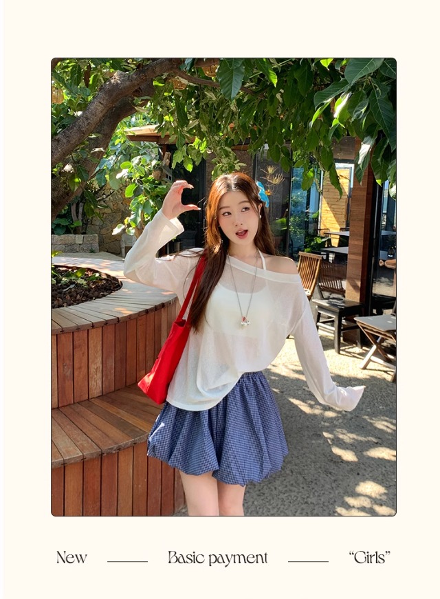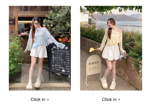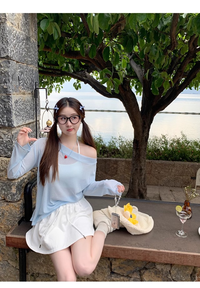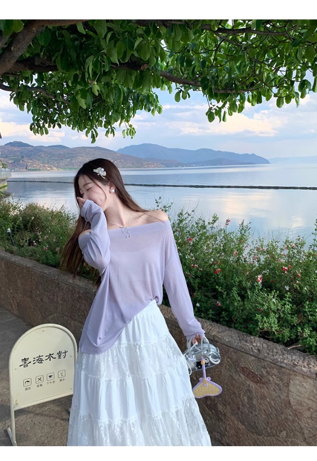 一字肩防晒罩衫女2026年夏季新款斜肩宽松显瘦慵懒风长袖t恤上衣