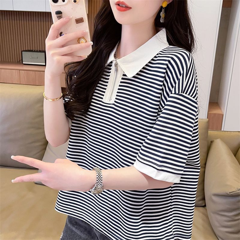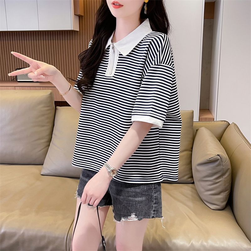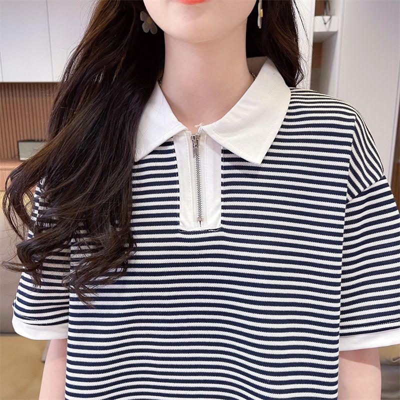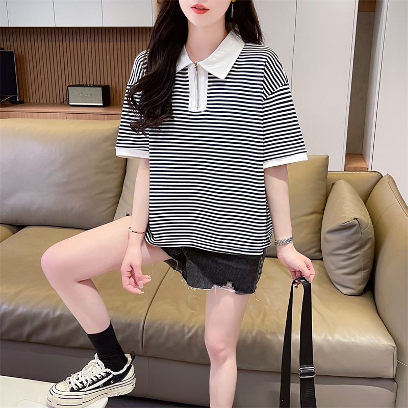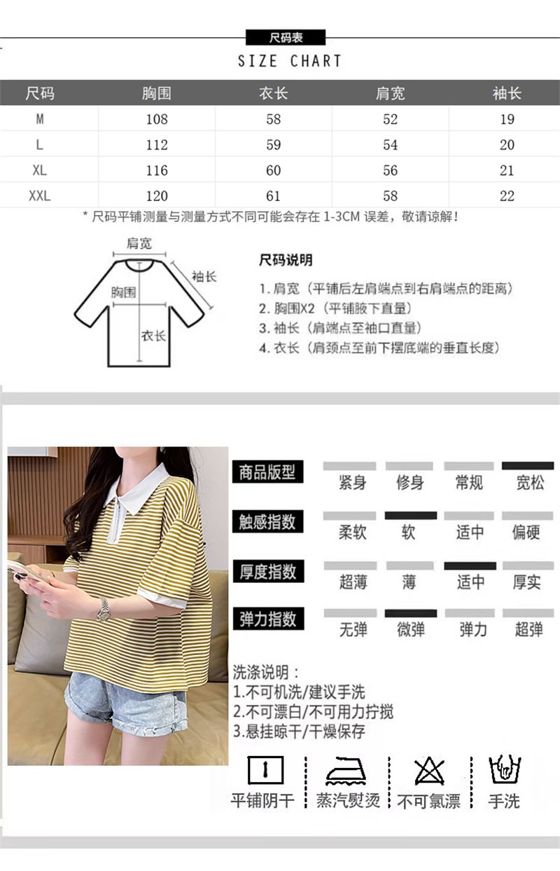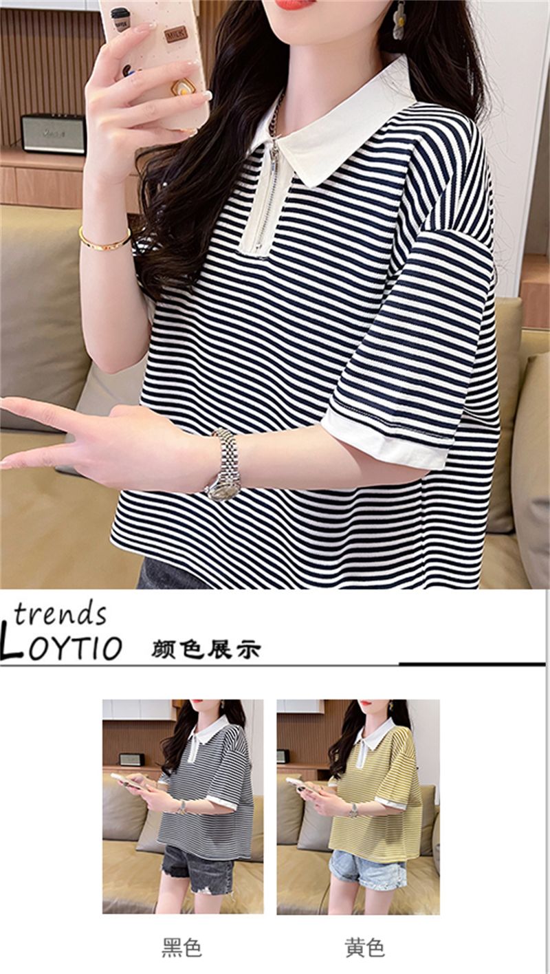 实拍2026夏季新款朱地条纹百搭条纹宽松上衣时尚短袖T恤女