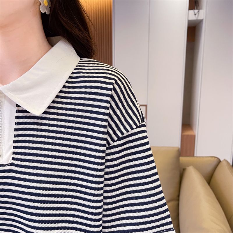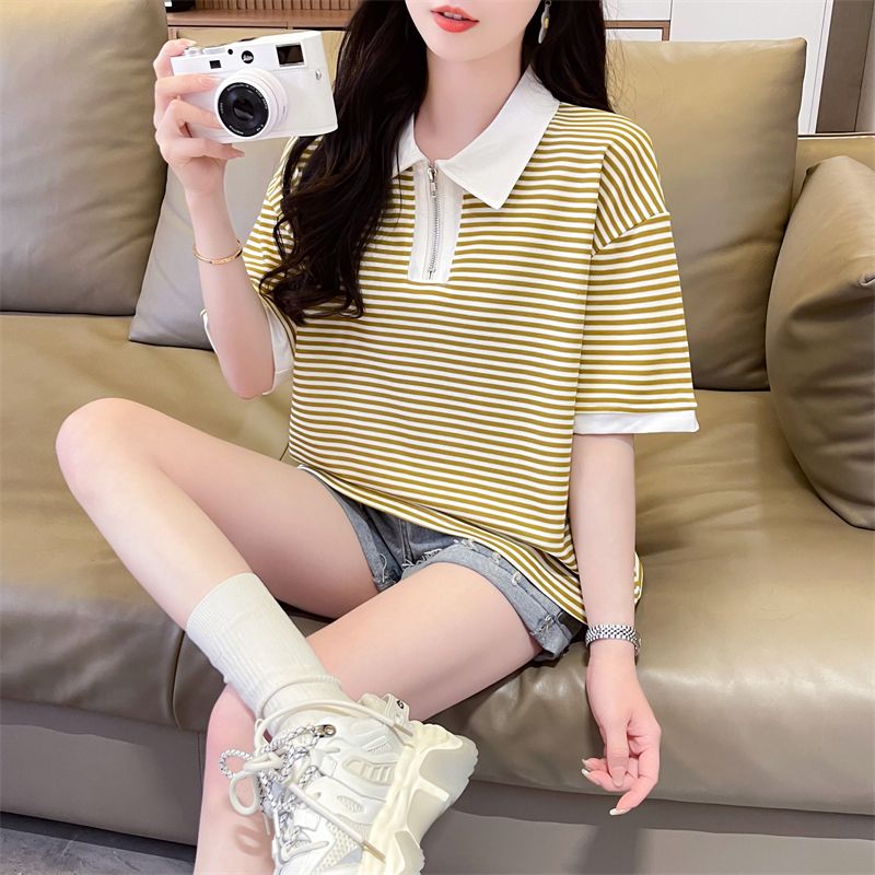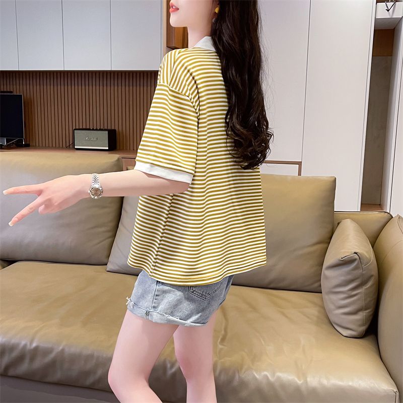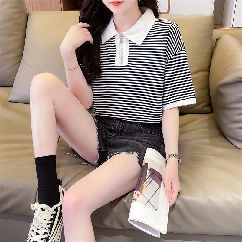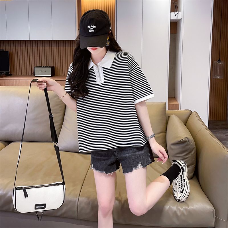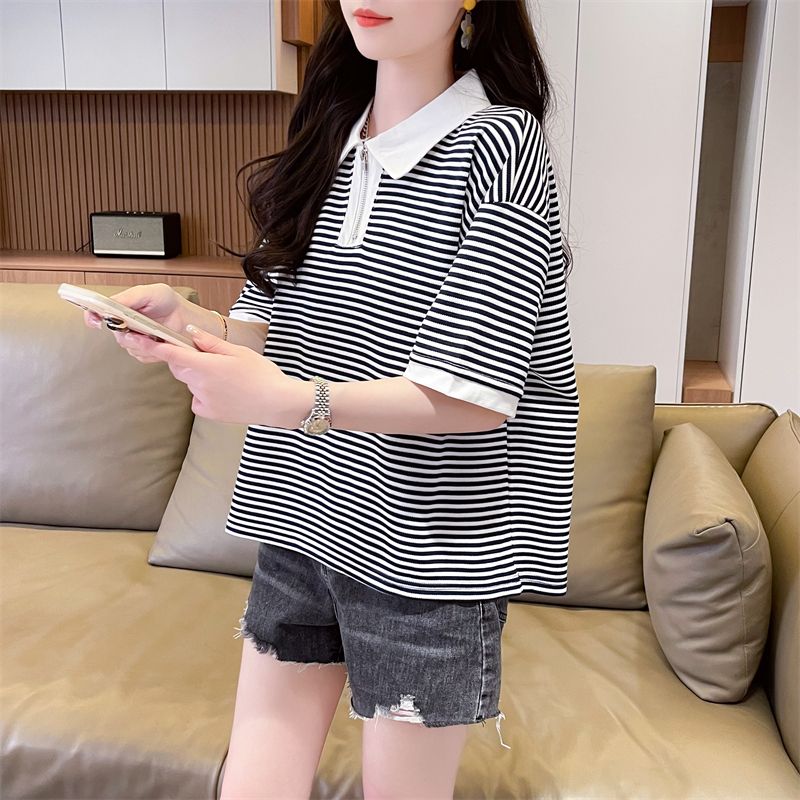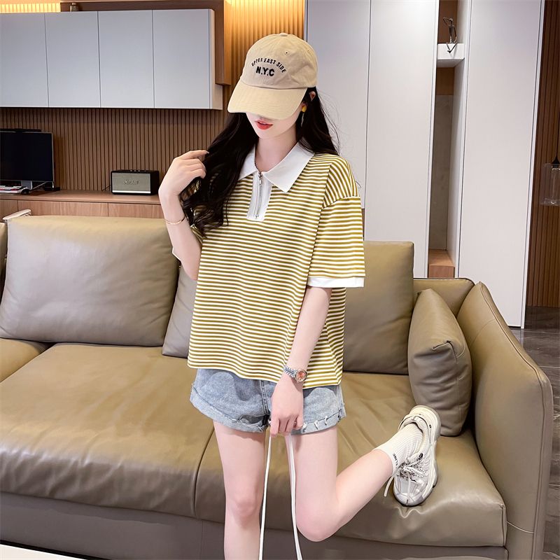 实拍2026夏季新款朱地条纹百搭条纹宽松上衣时尚短袖T恤女