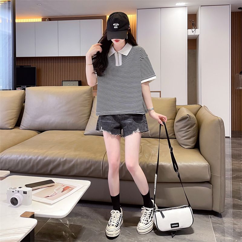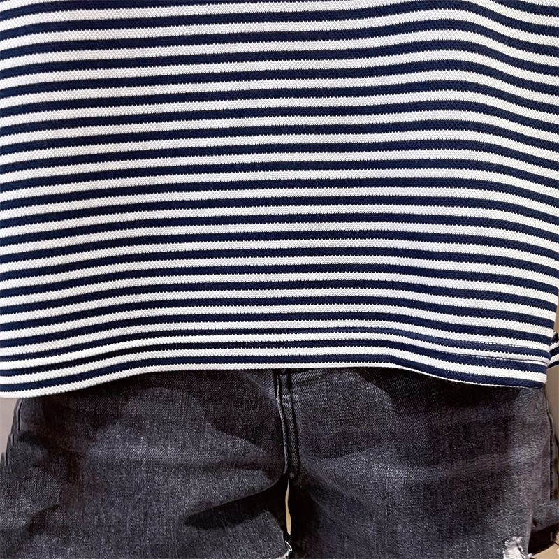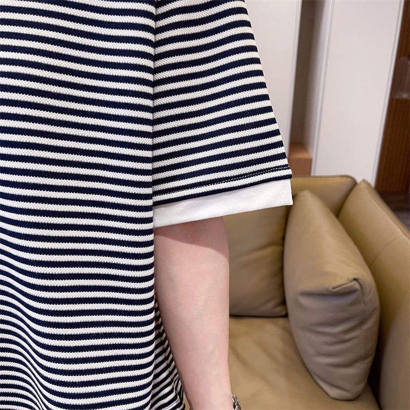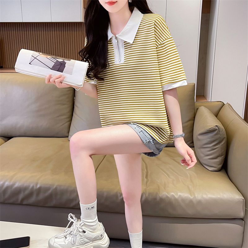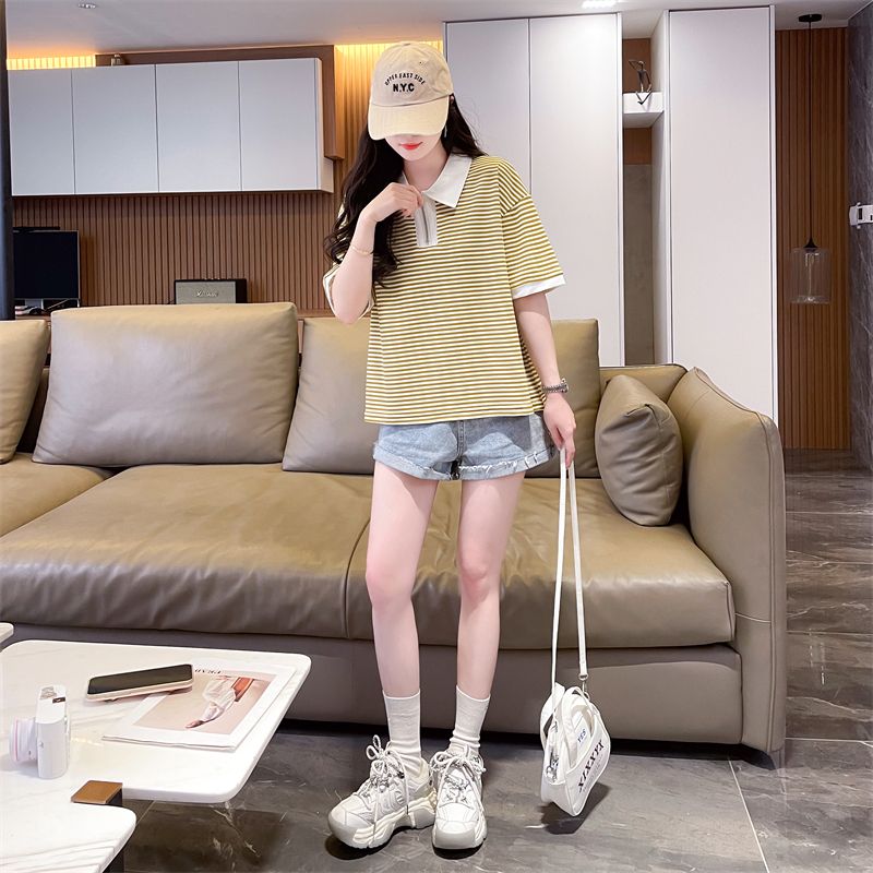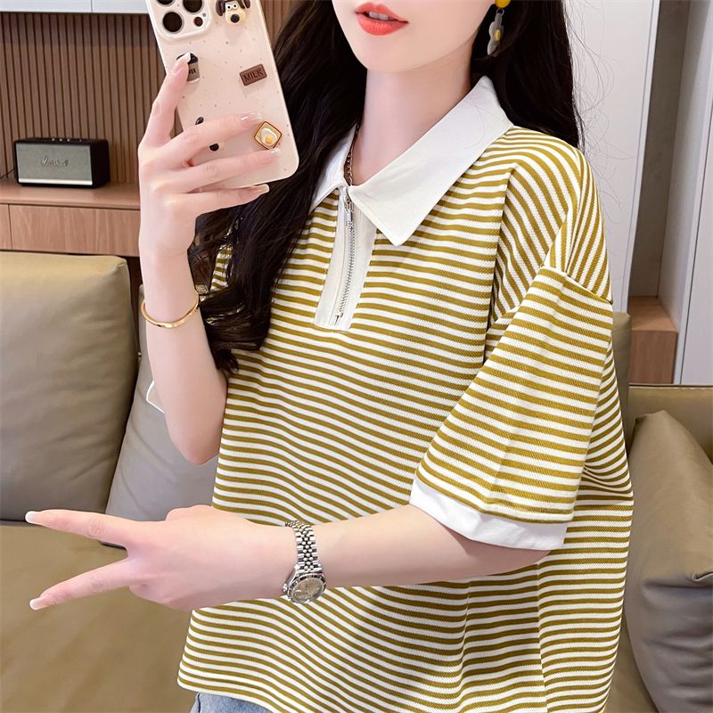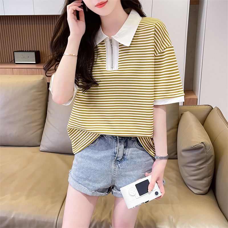 实拍2026夏季新款朱地条纹百搭条纹宽松上衣时尚短袖T恤女
