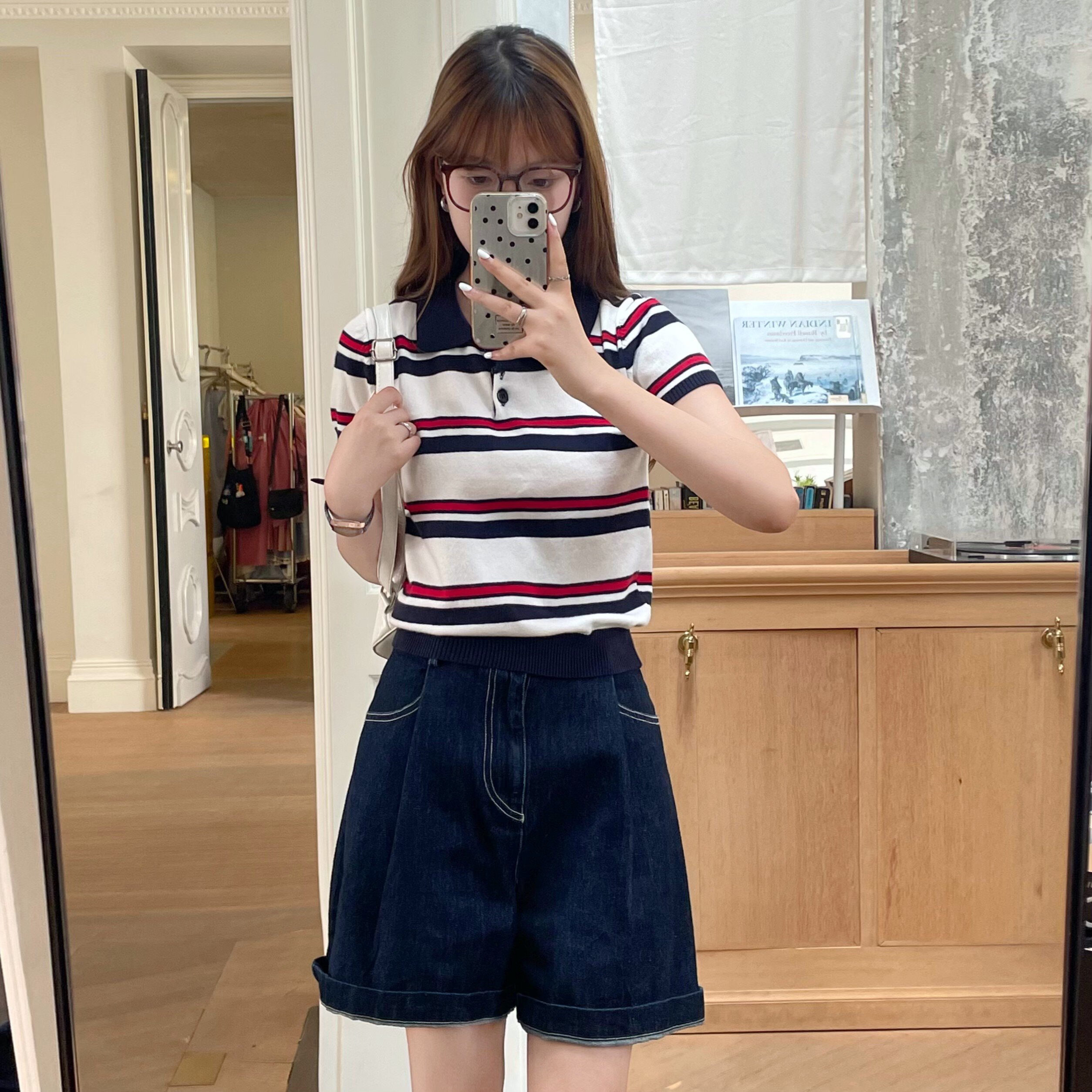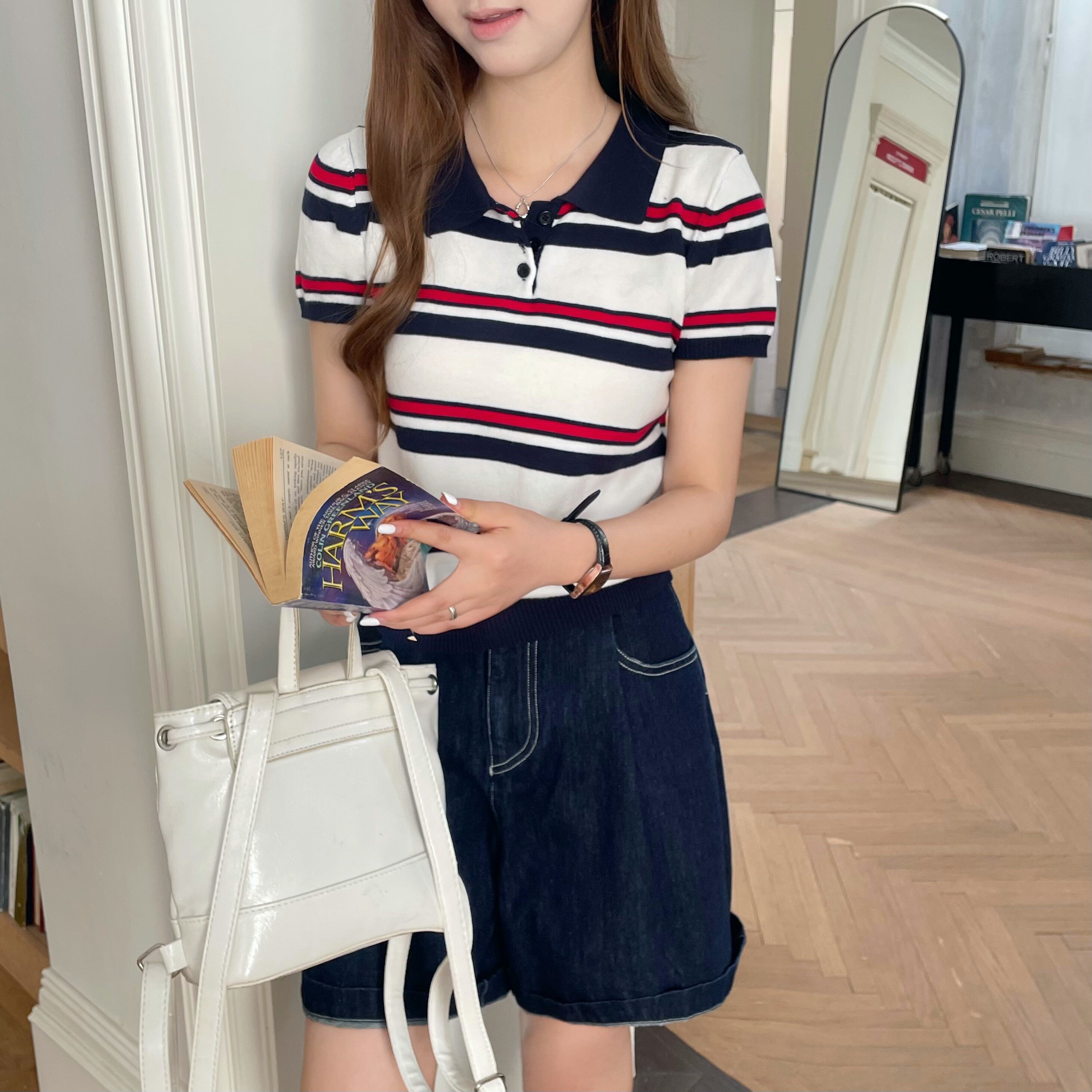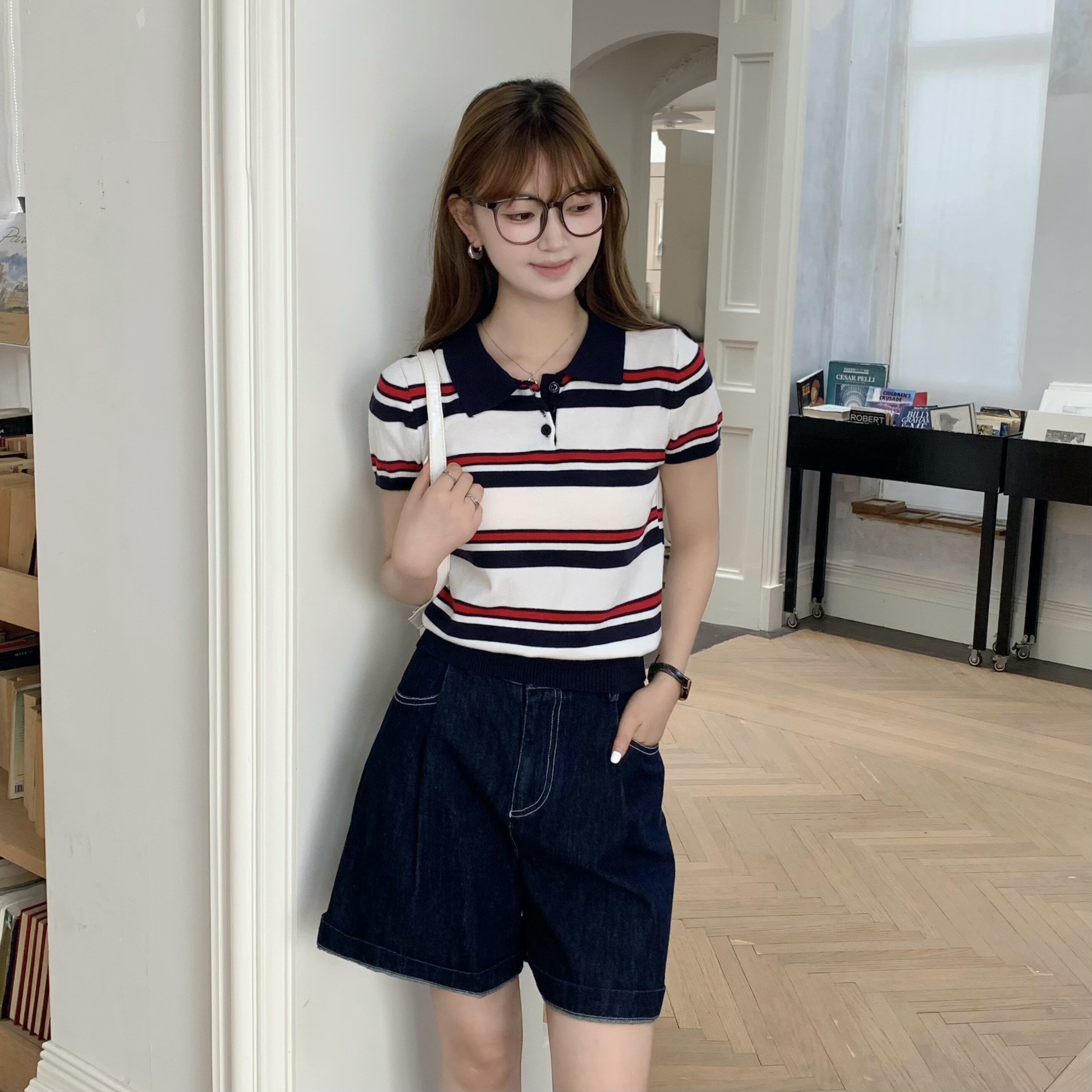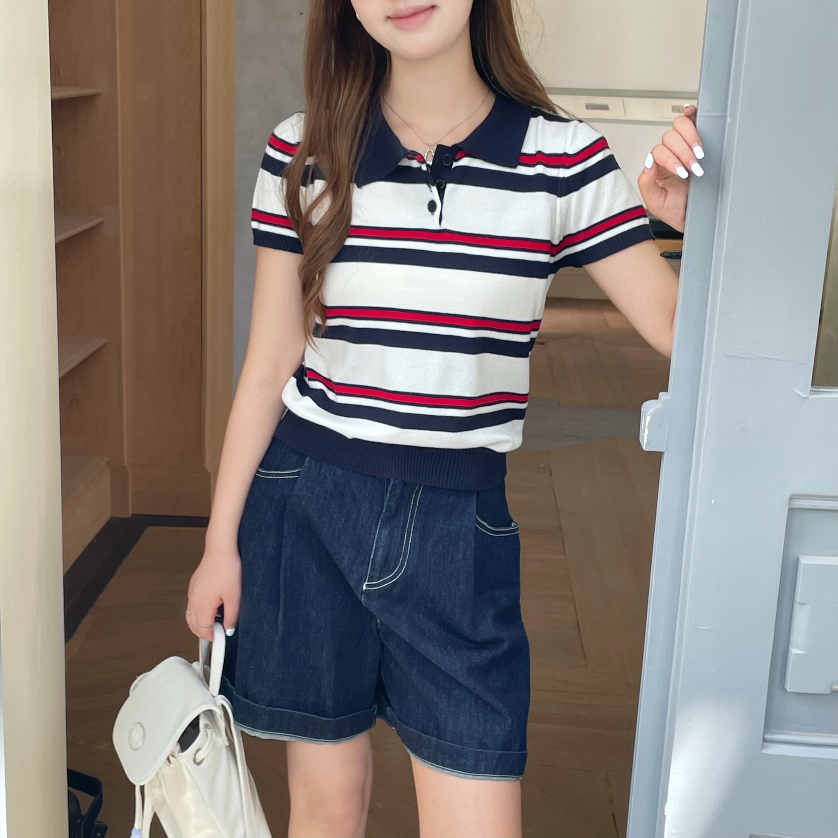 牙套大汪miu系polo针织条纹polo衫短袖t恤女正肩翻领短款上衣