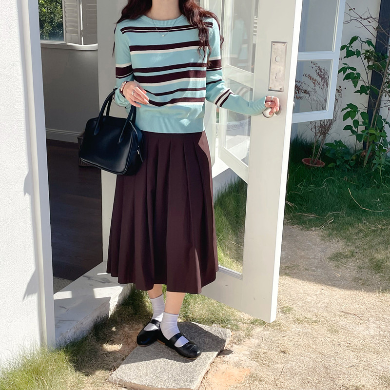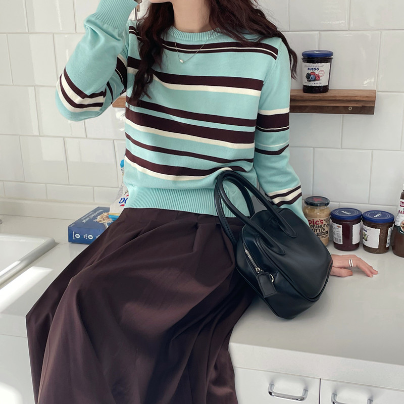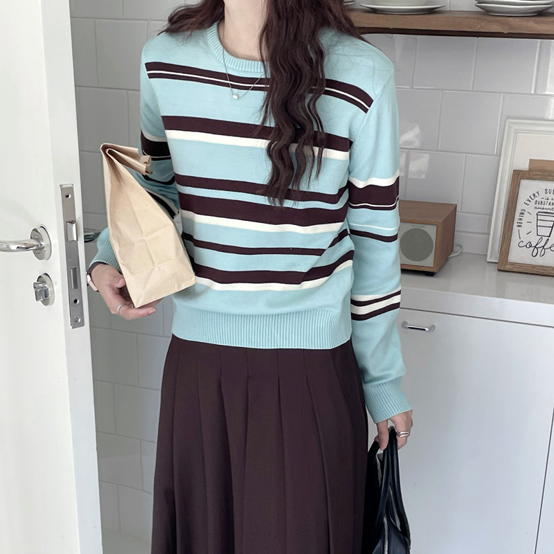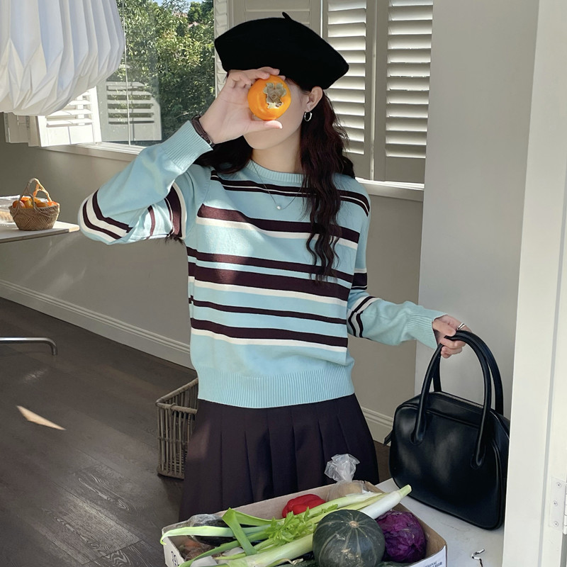 银河汽水 蓝色条纹毛衣女款春秋新款2026小个子短款显瘦针织上衣