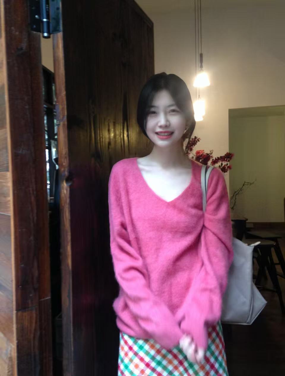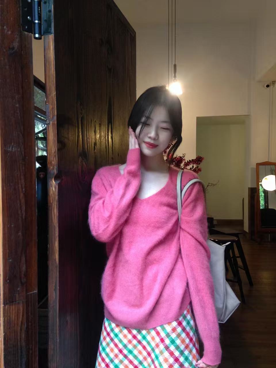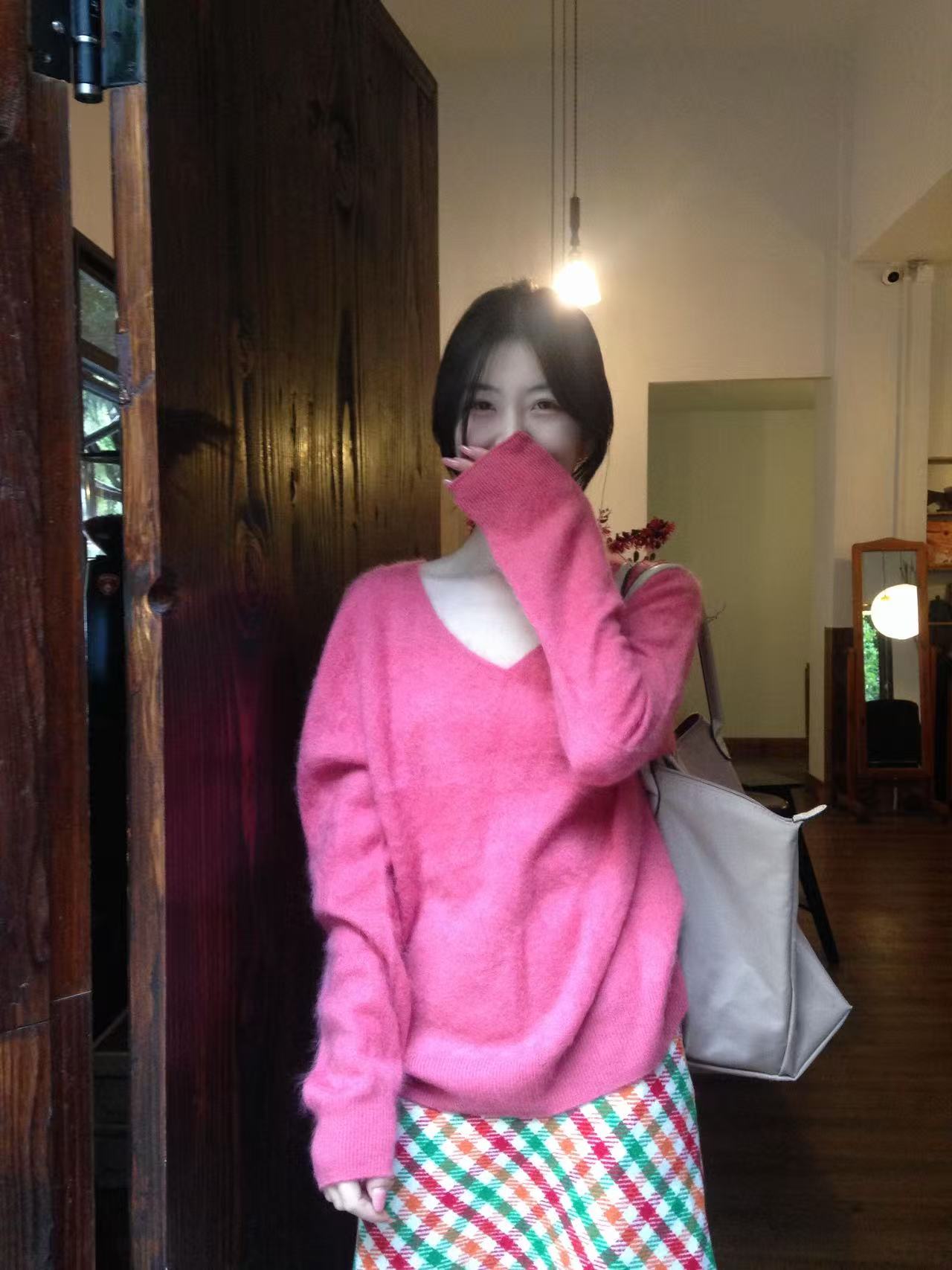 百搭宽松毛茸茸V领羊毛毛衣女秋冬多巴胺无缝一体羊绒套头