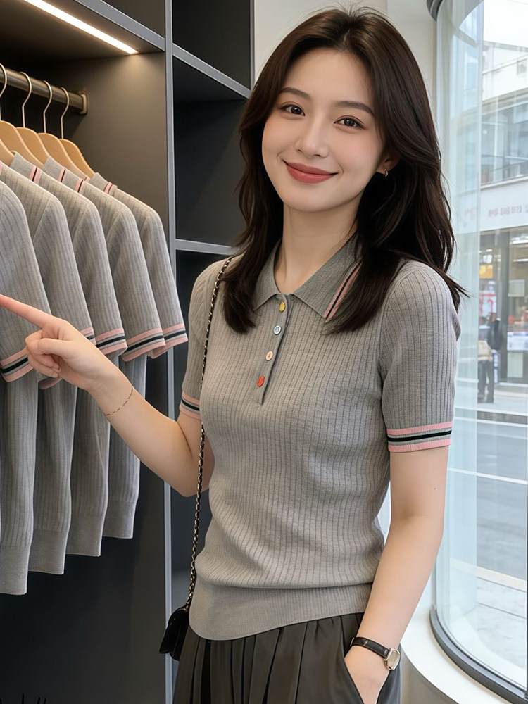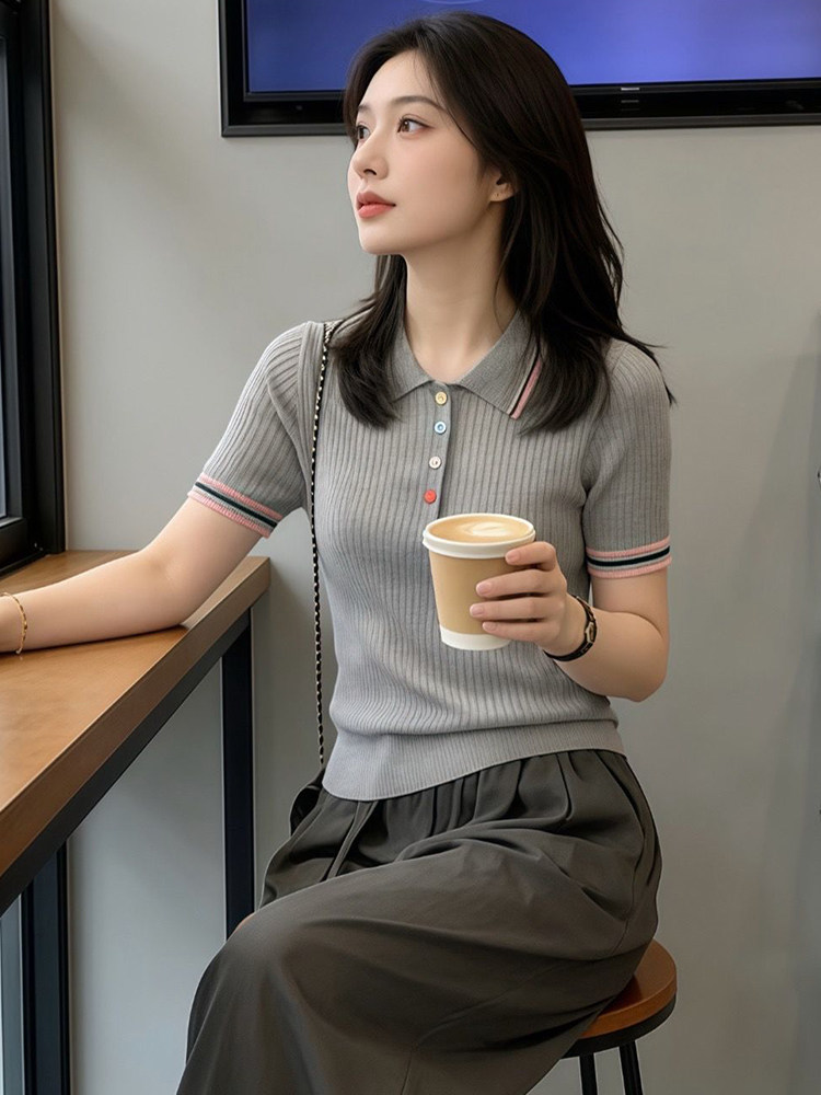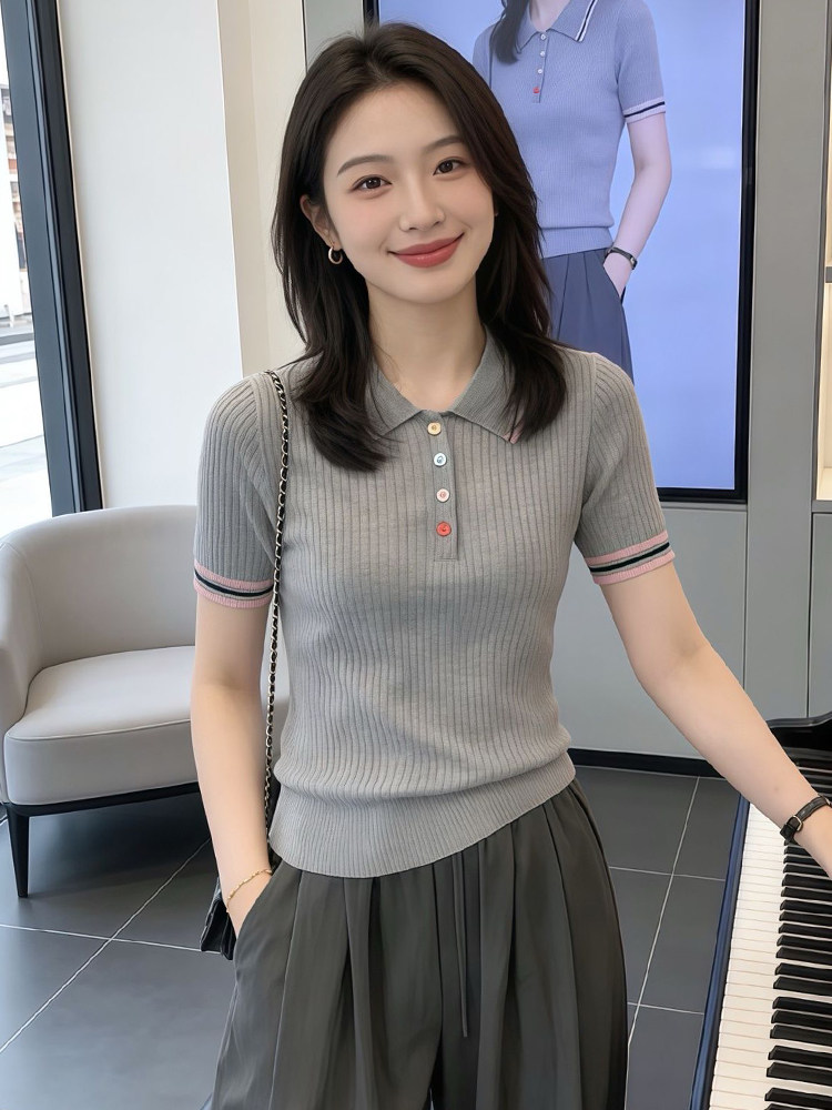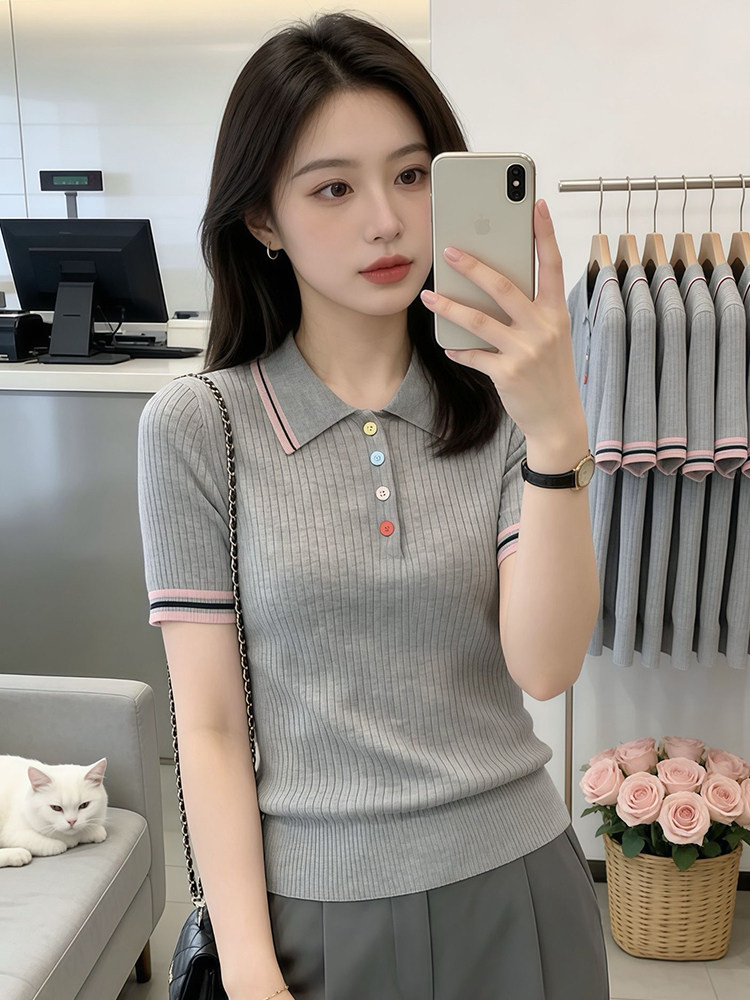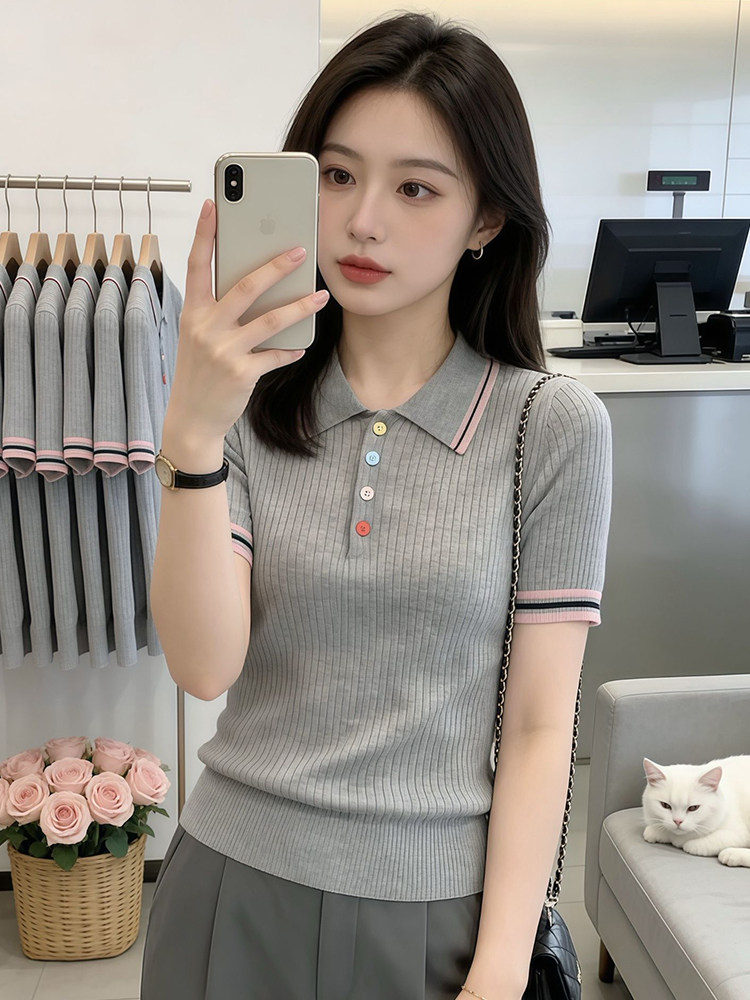 韩系撞色冰丝彩扣Polo领短袖针织衫2026夏季新款时尚百搭短袖上衣