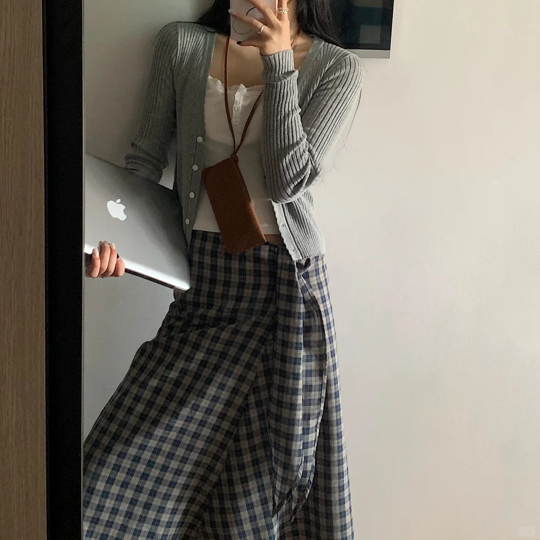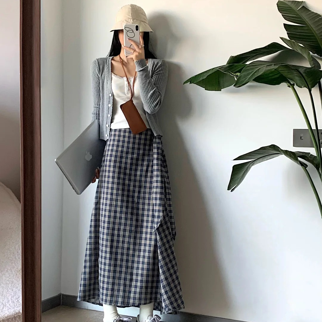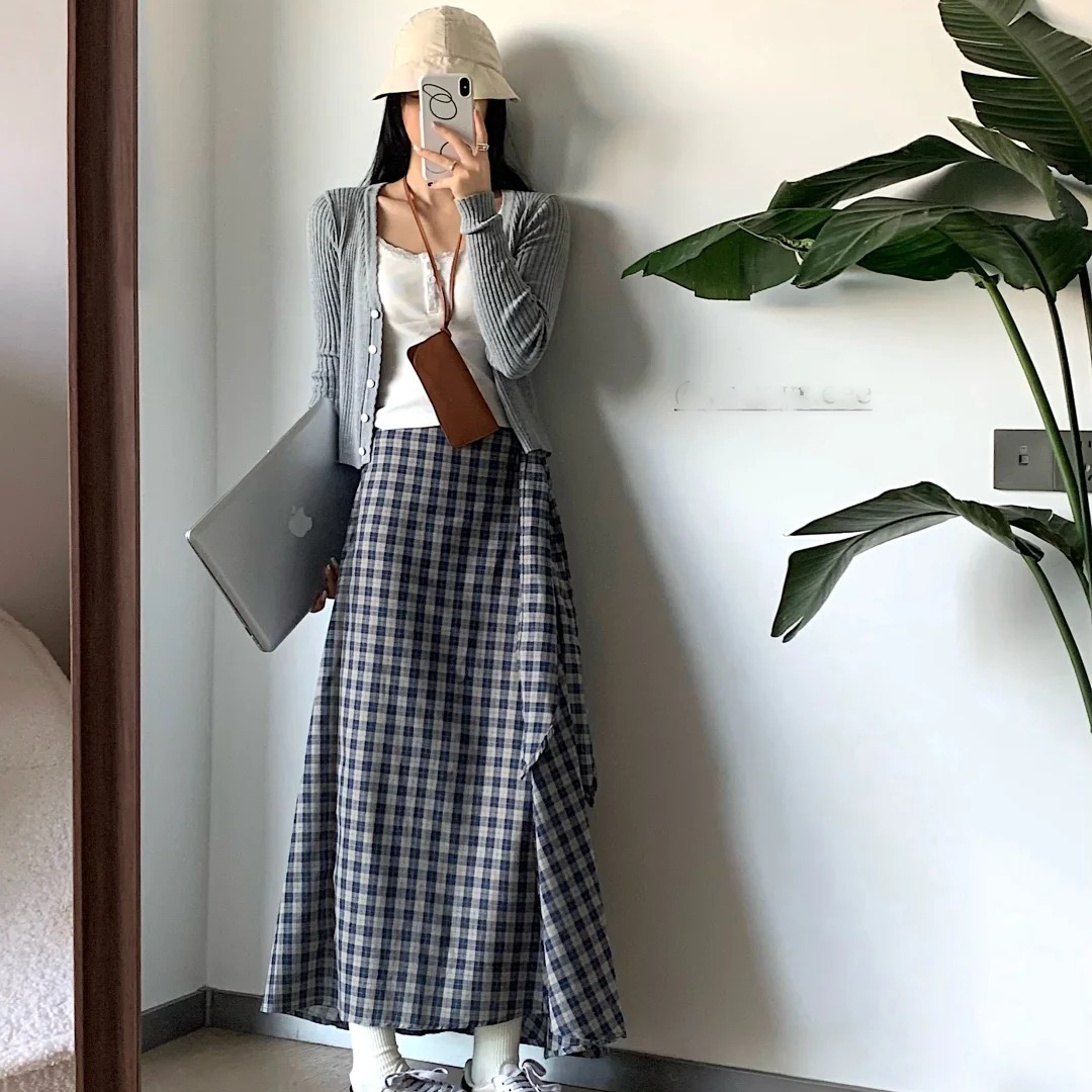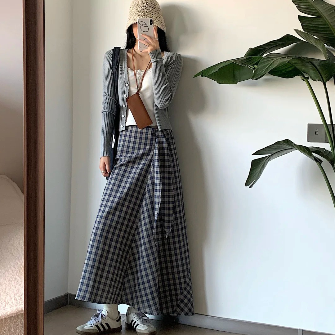 休闲高腰格子半身裙女2026新款设计感小众不规则气质拼接长款裙子