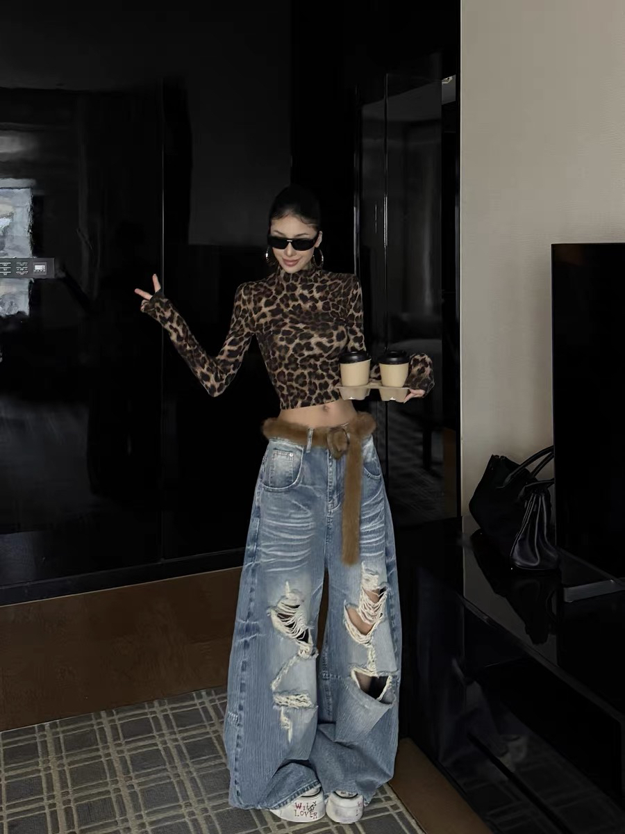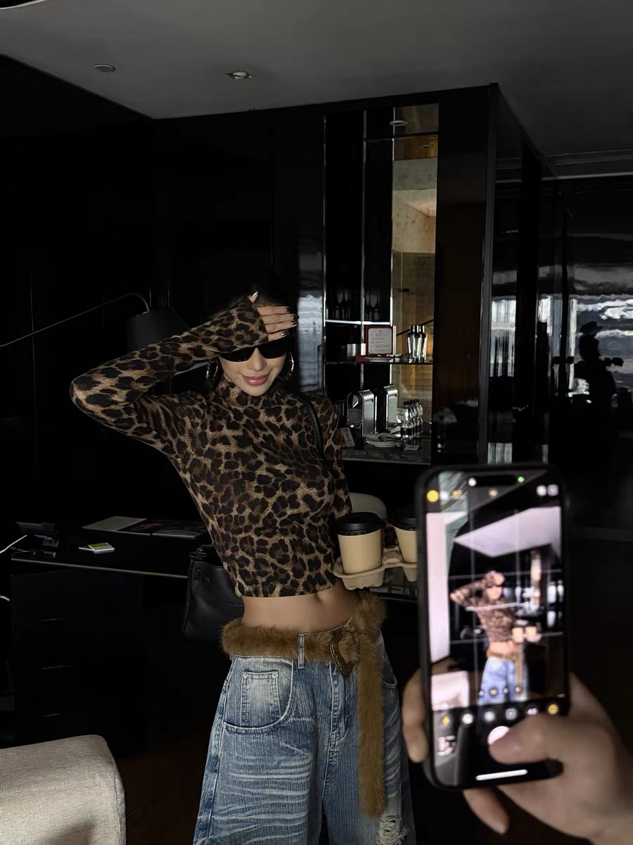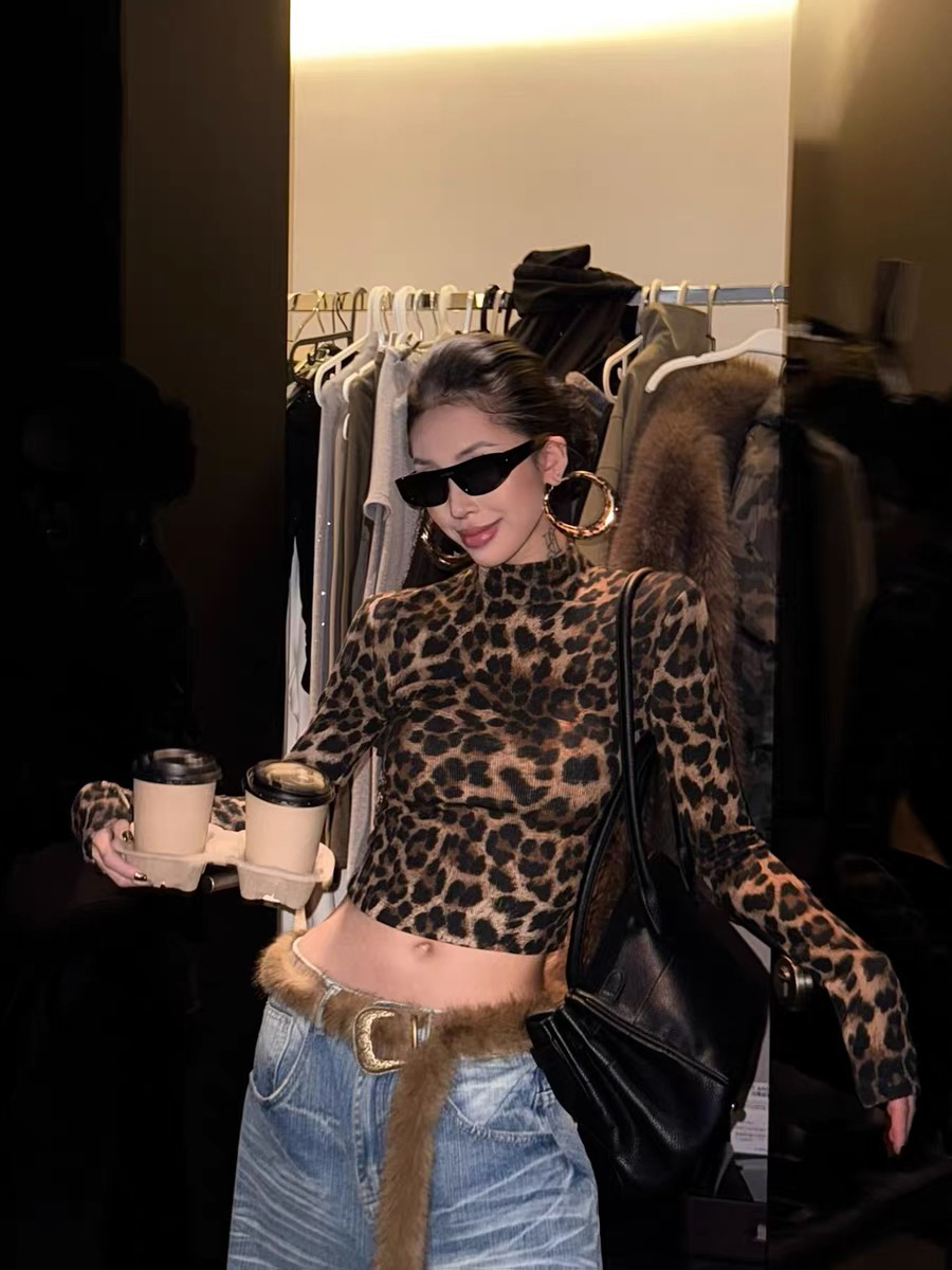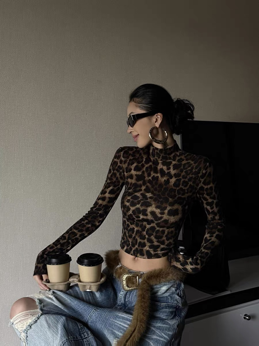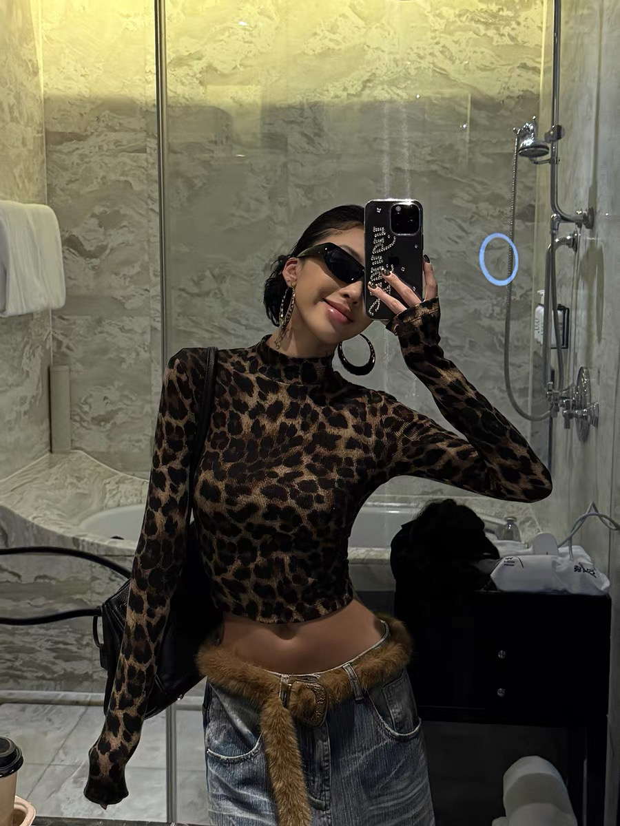 复古豹纹印花立领紧身长袖t恤女新款性感辣妹修身上衣
