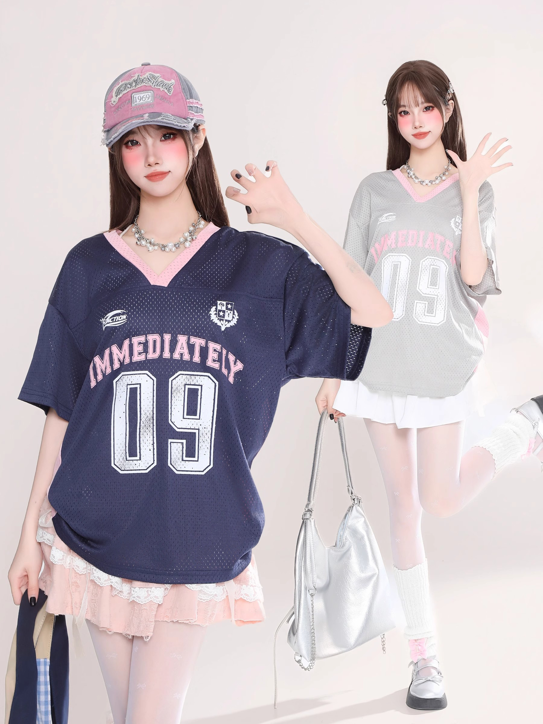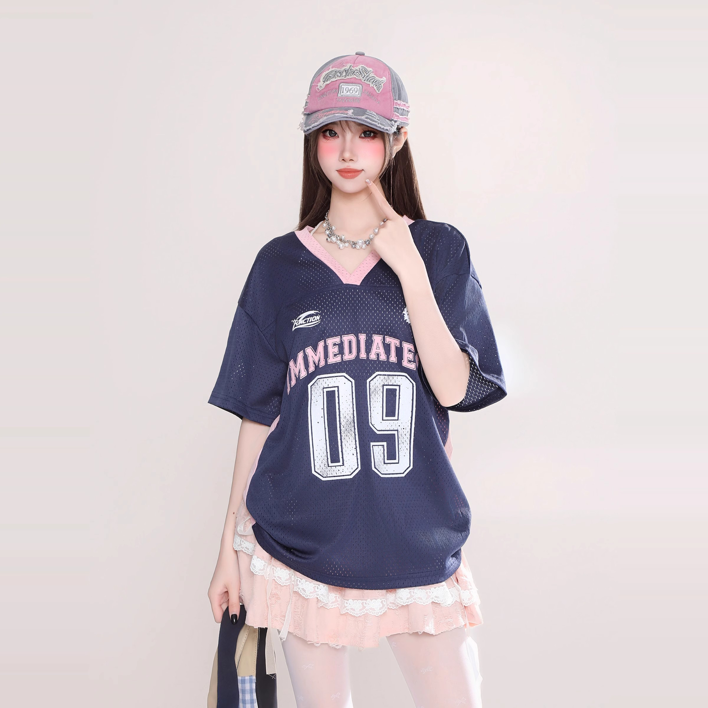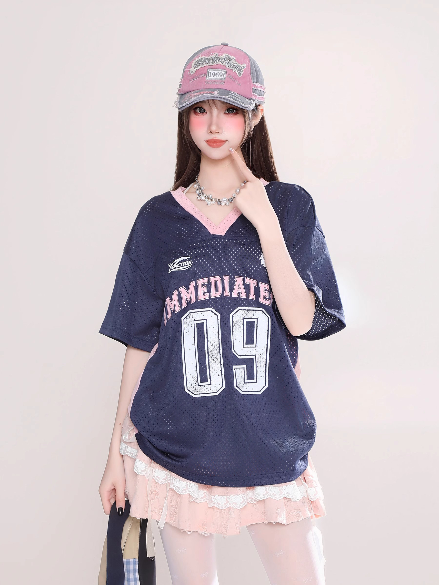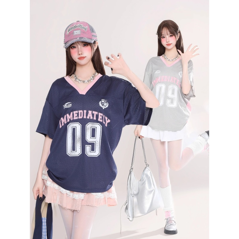 字母印花球衣风镂空透气V领短袖T恤女宽松显瘦上衣