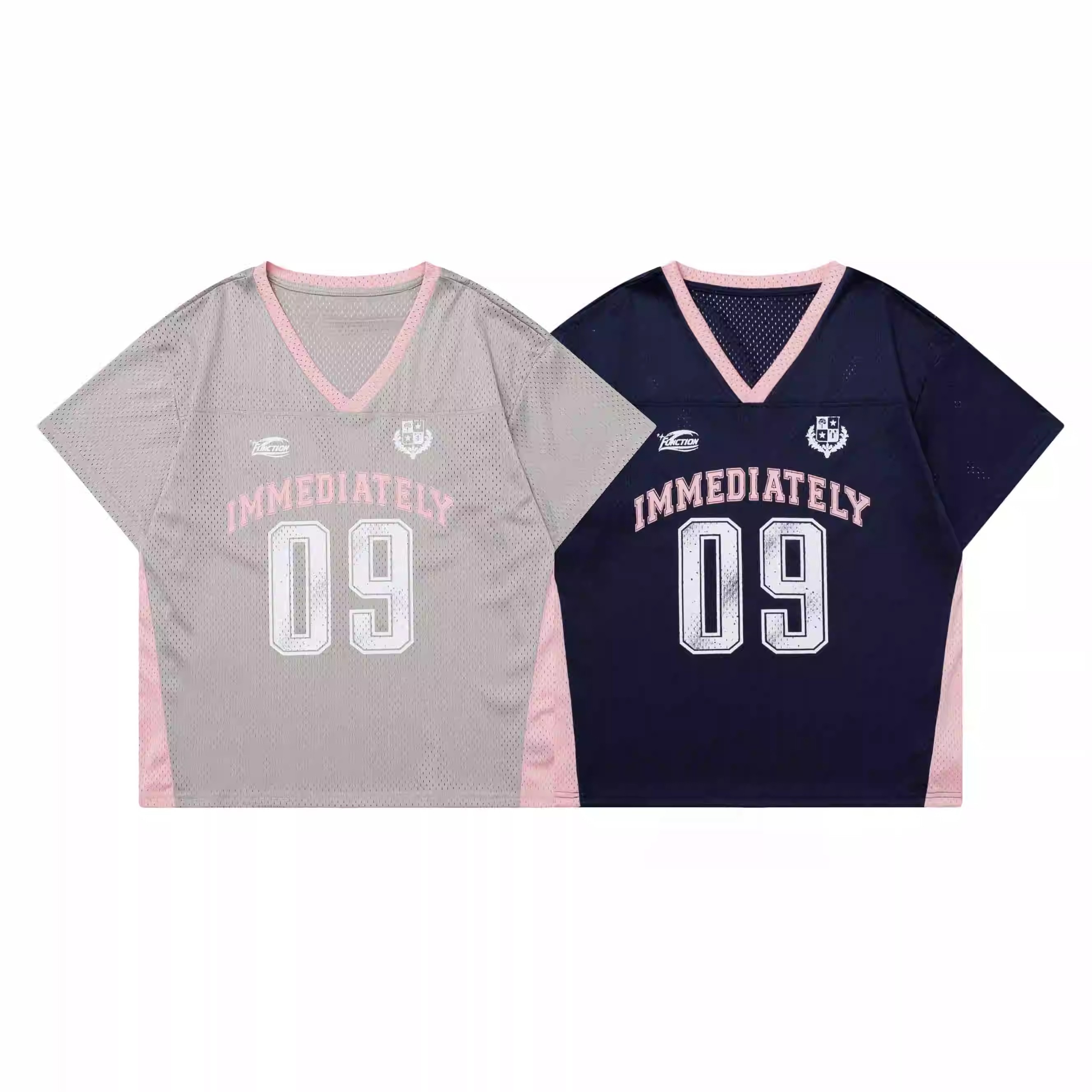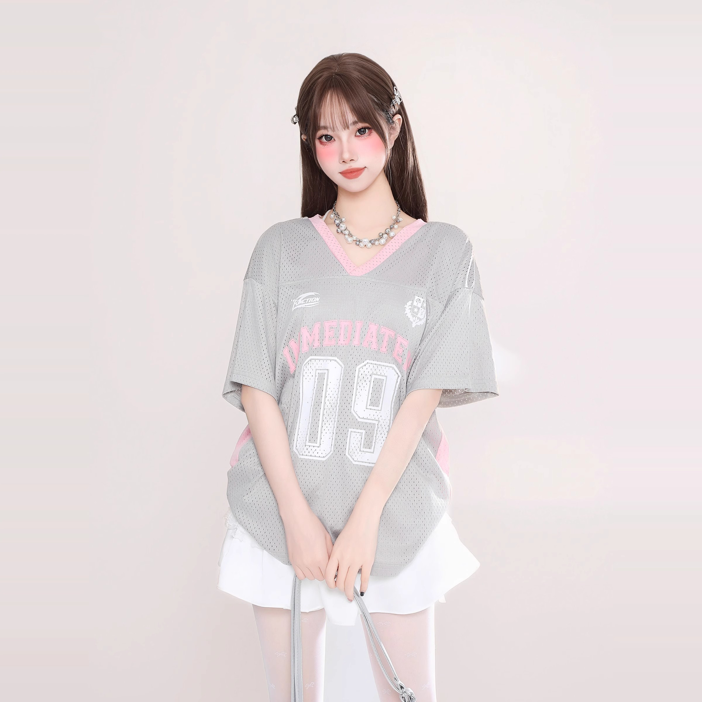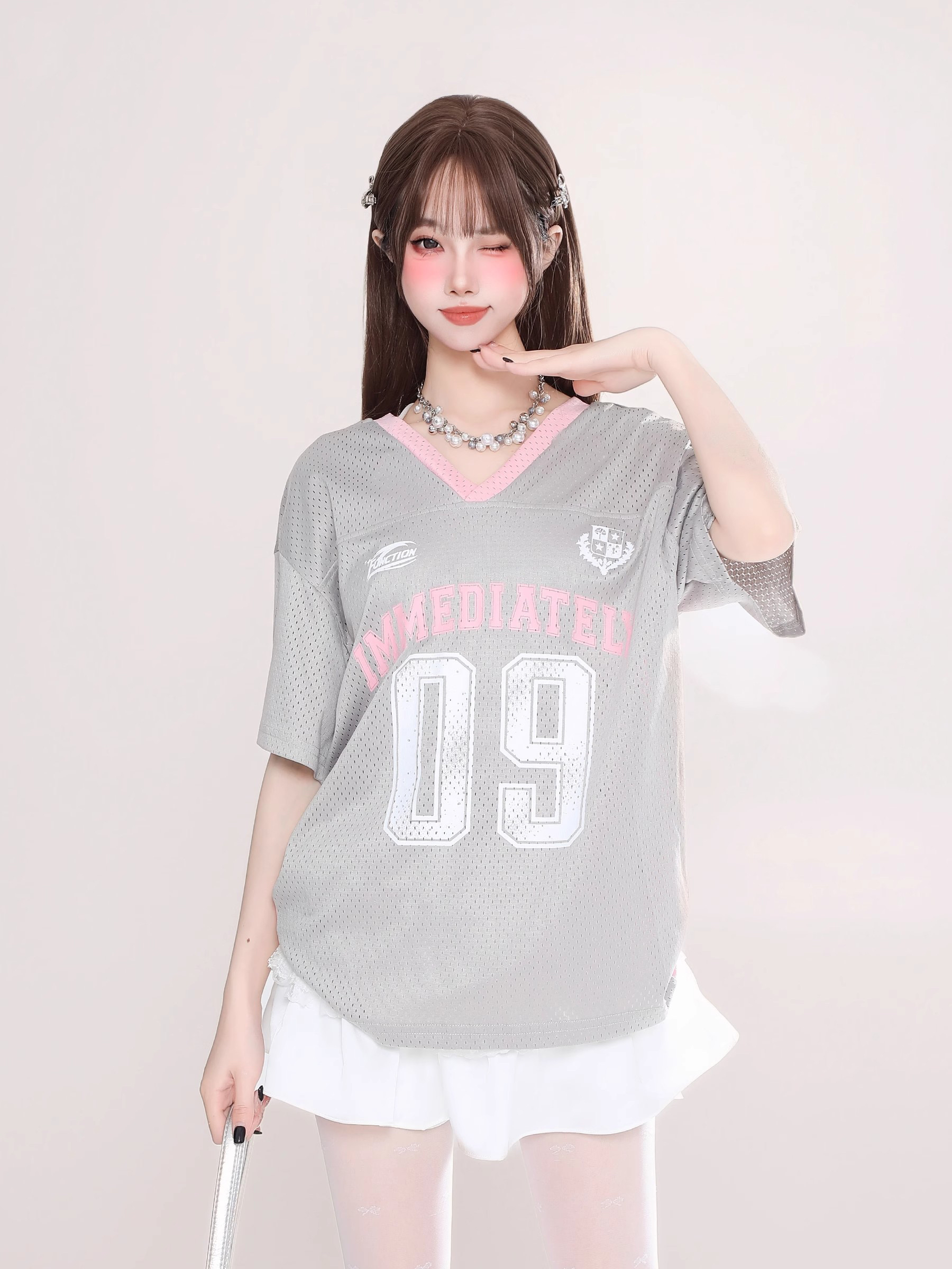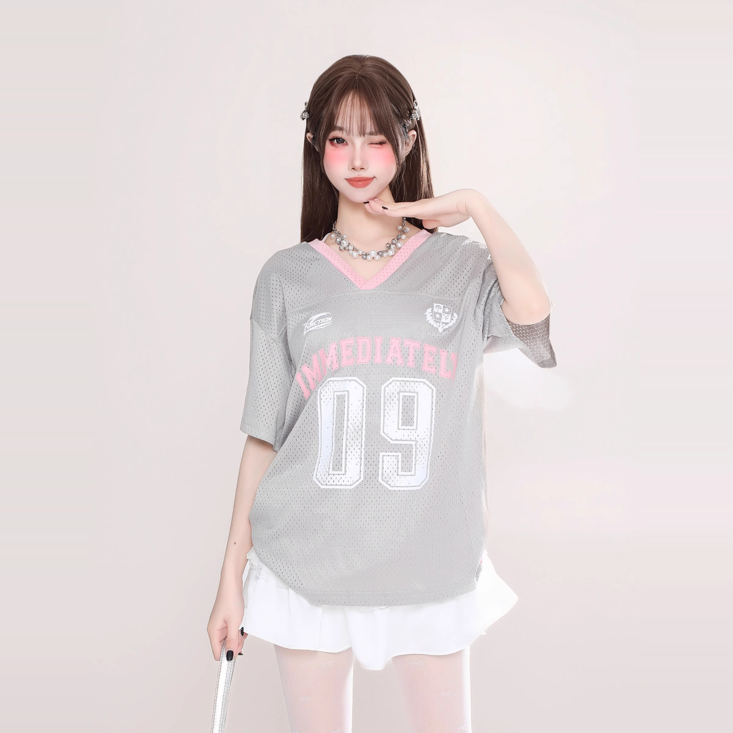 字母印花球衣风镂空透气V领短袖T恤女宽松显瘦上衣