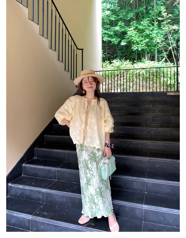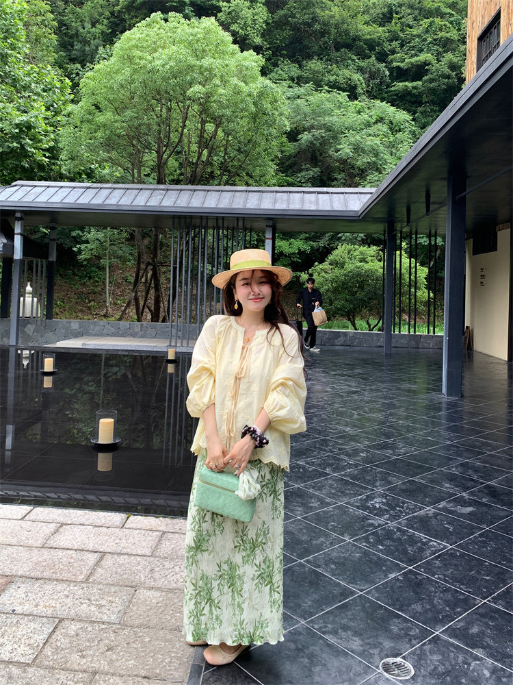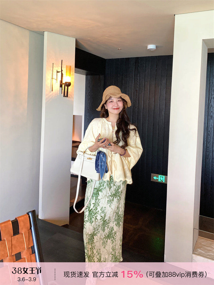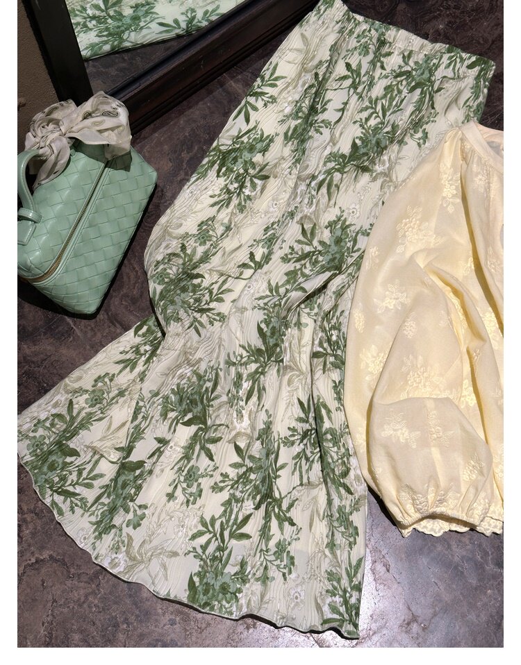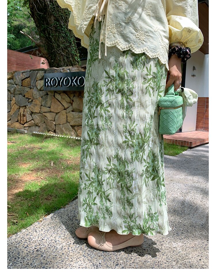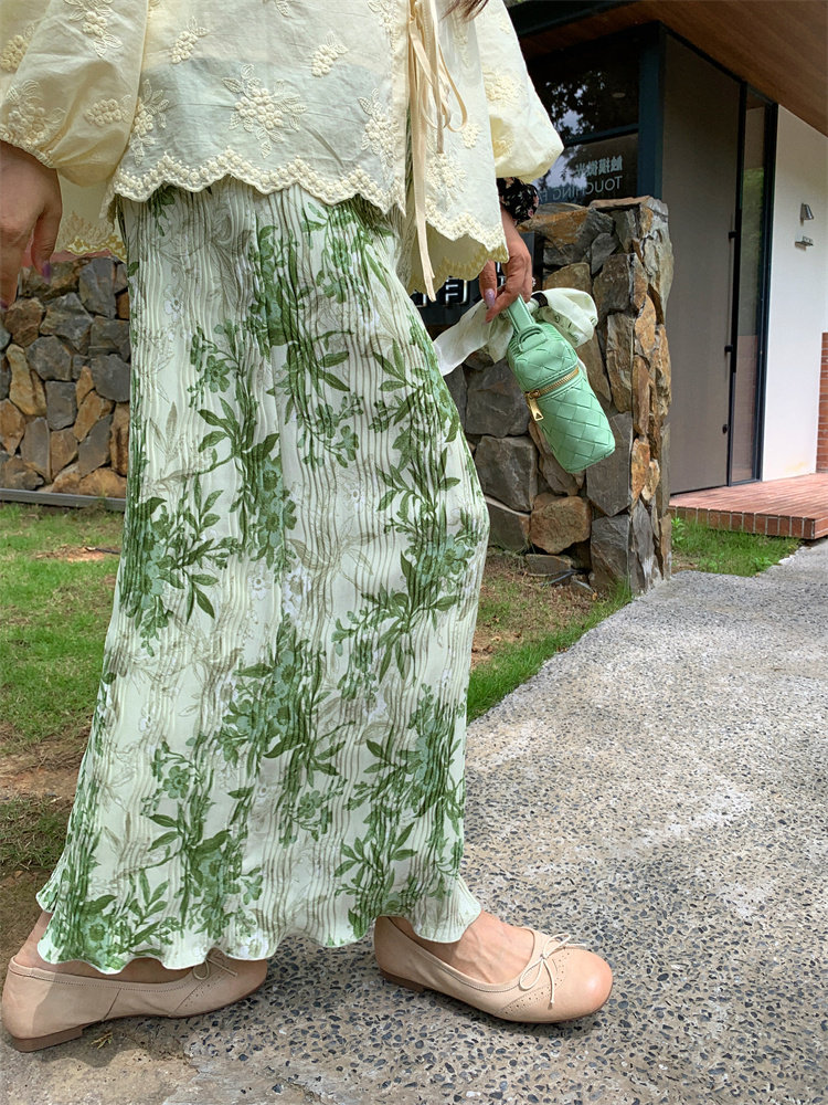 复古风2025夏季新款印花开叉垂感高腰显瘦褶皱气质半身裙中长裙