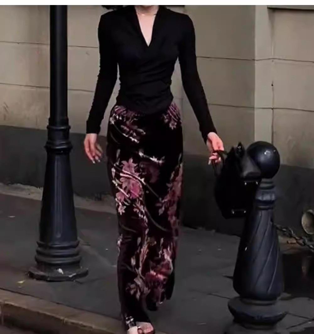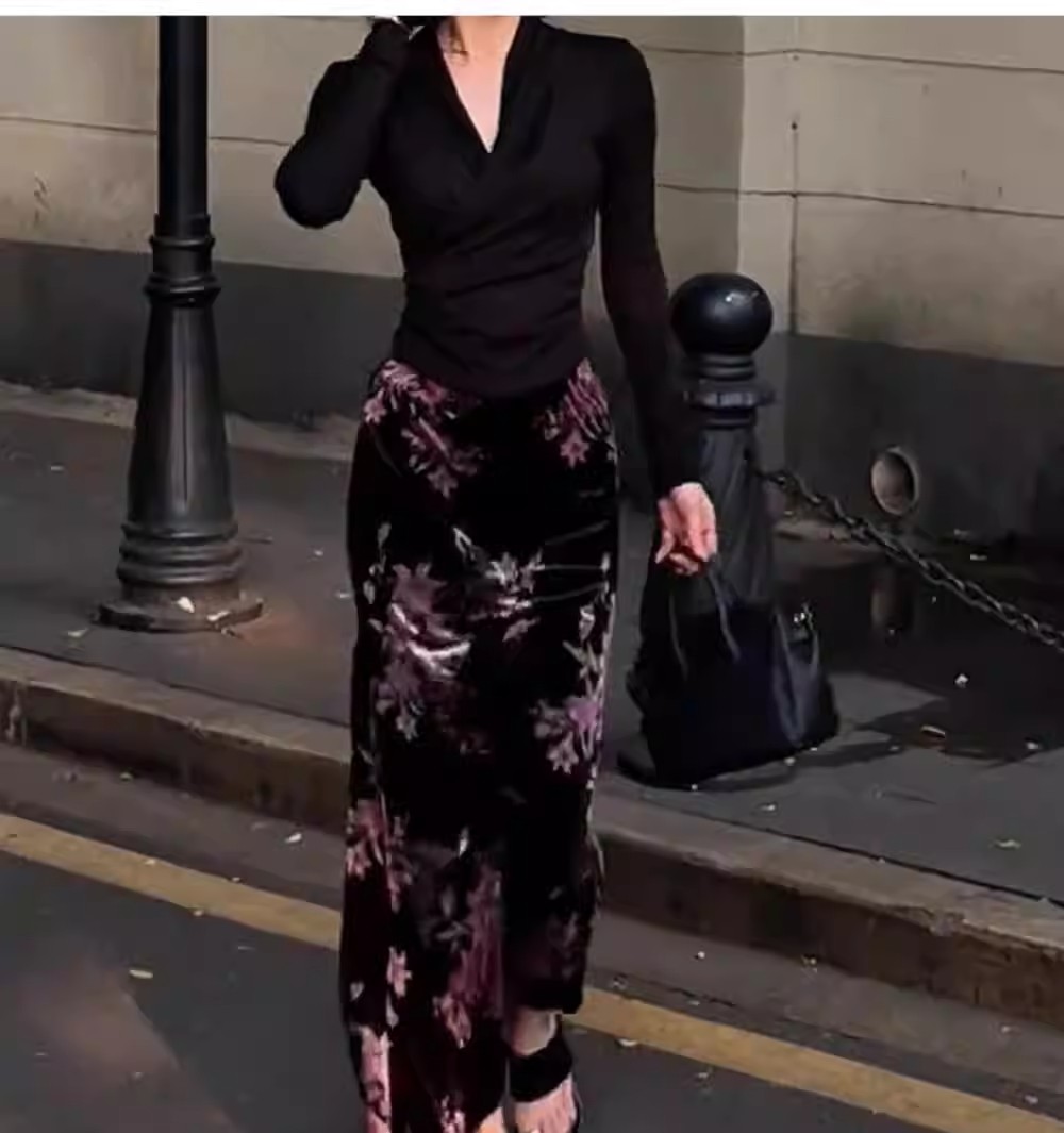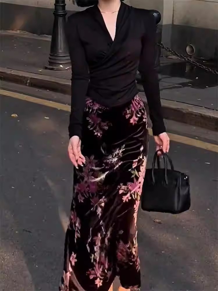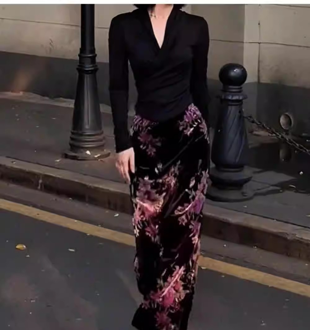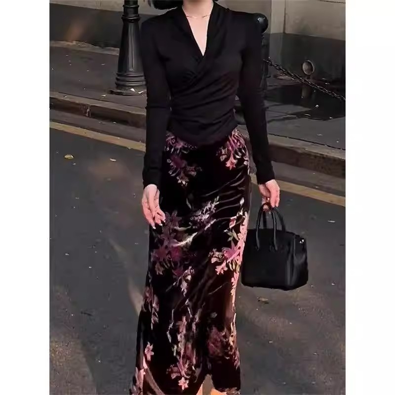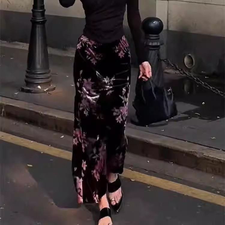 复古慵懒风显瘦碎花丝绒裙新中式秋季新款松紧腰包臀垂坠感半身裙