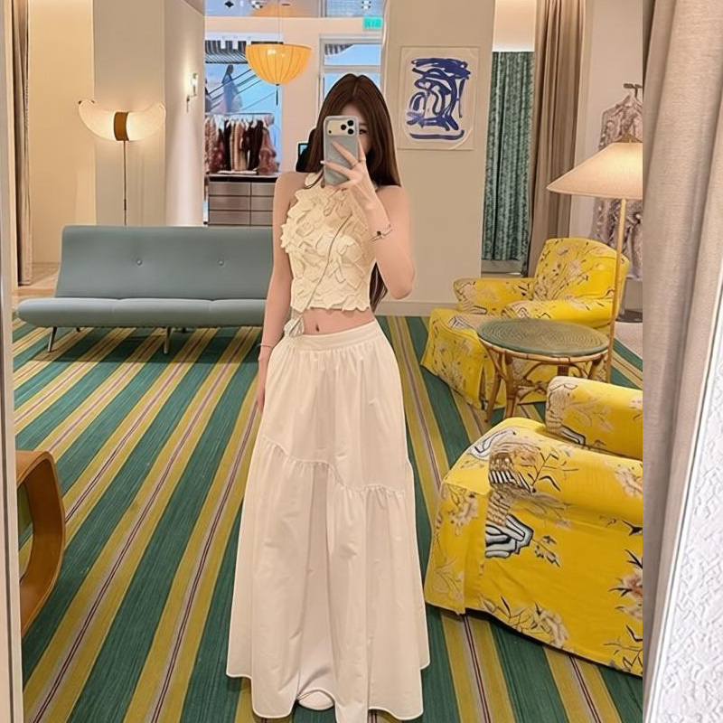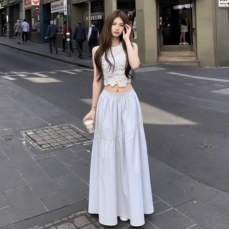 cchen陈陈 - 퓨어 화이트 러브 헤비듀티 자카드 민소매 탑, 라운드넥 베스트, 롱 케이크 스커트 세트