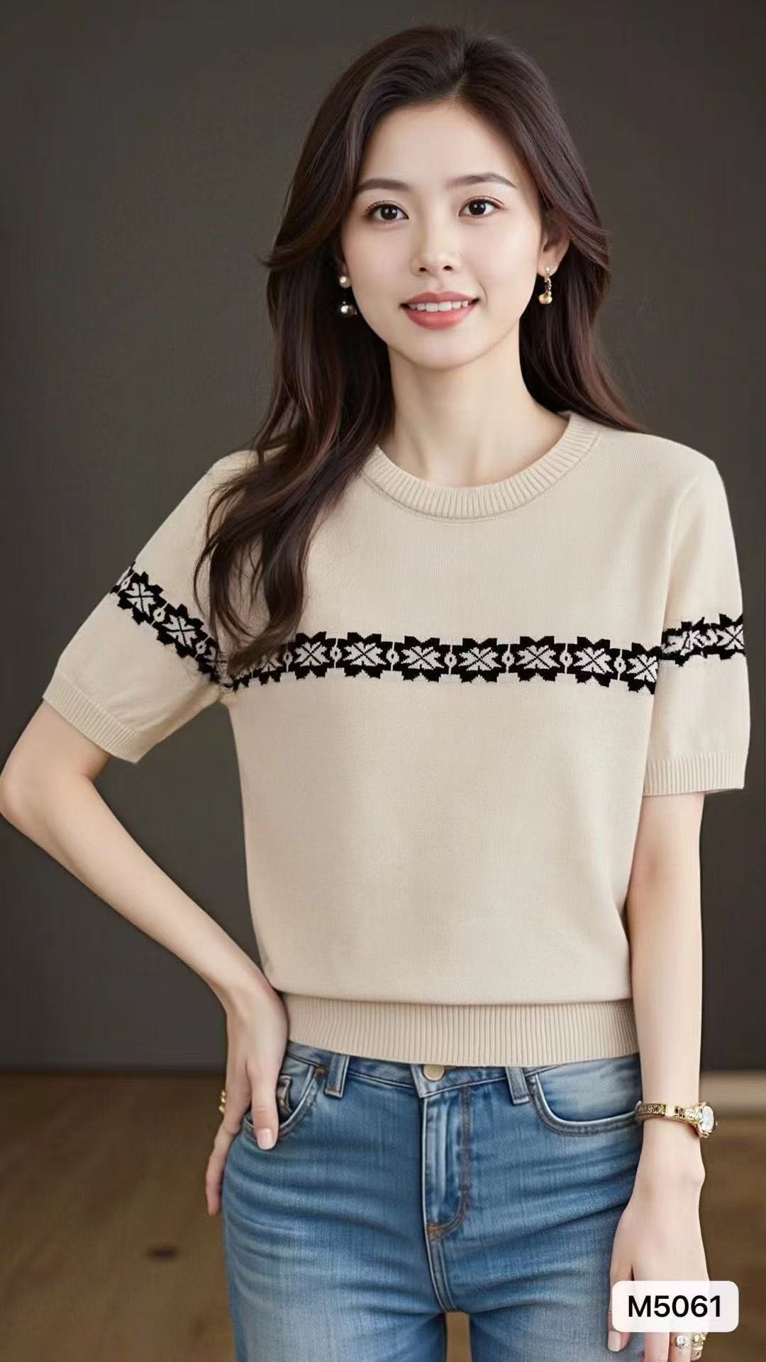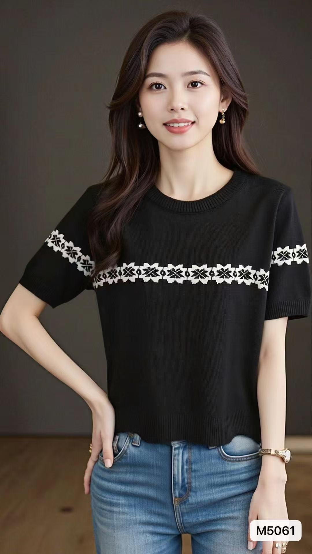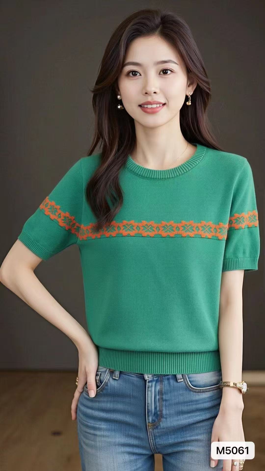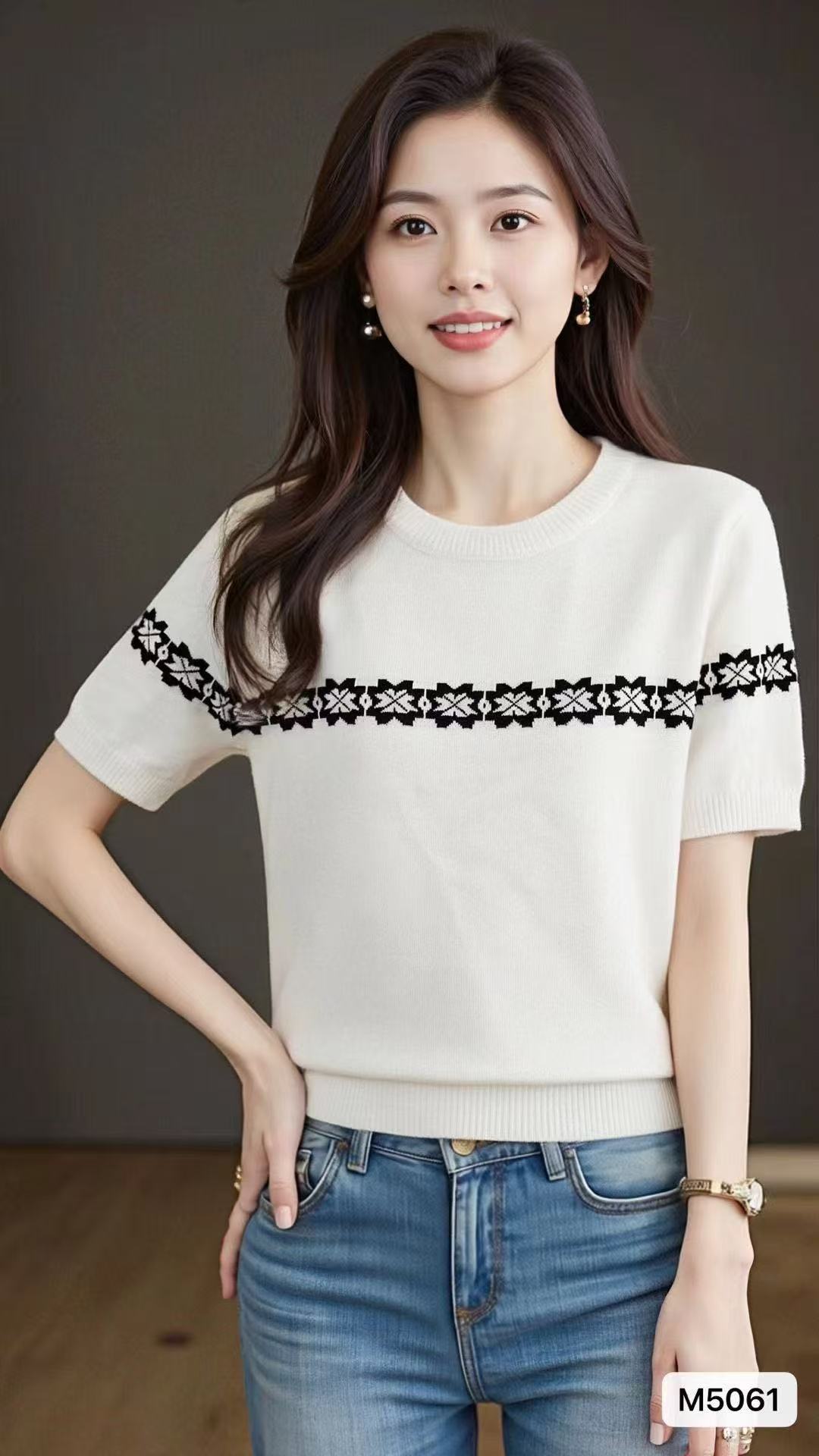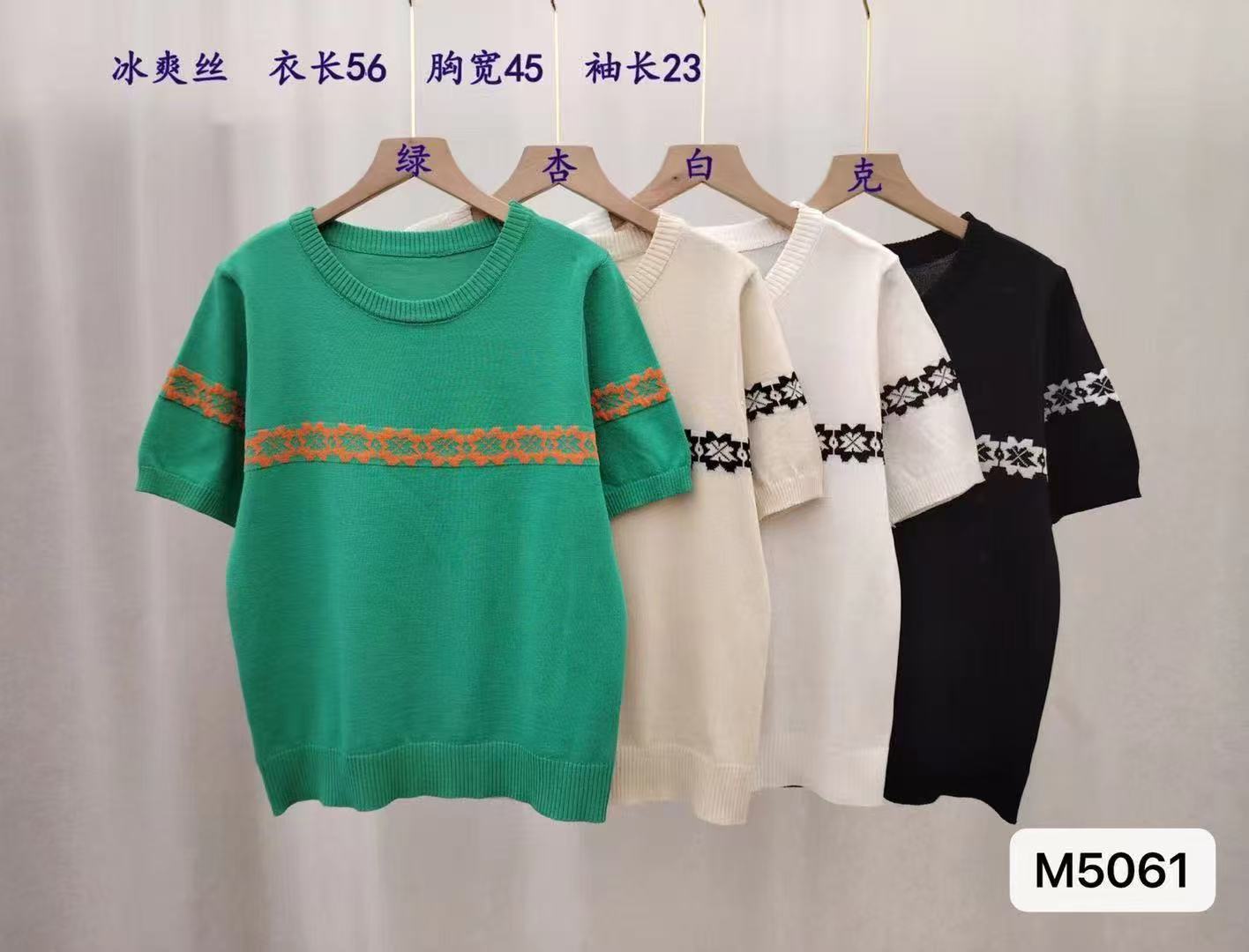 实价时尚圆领撞色复古提花宽松百搭短袖