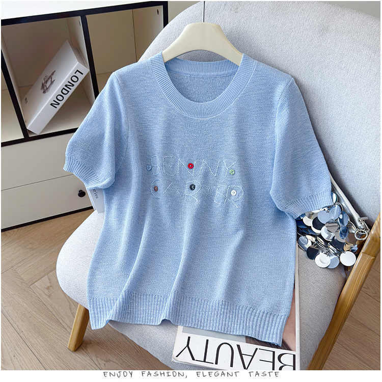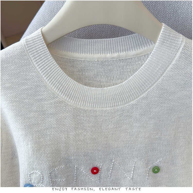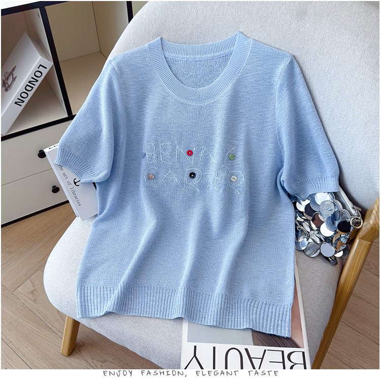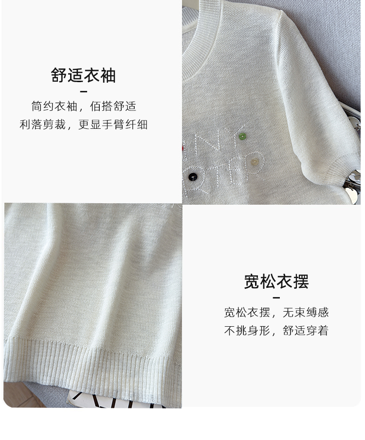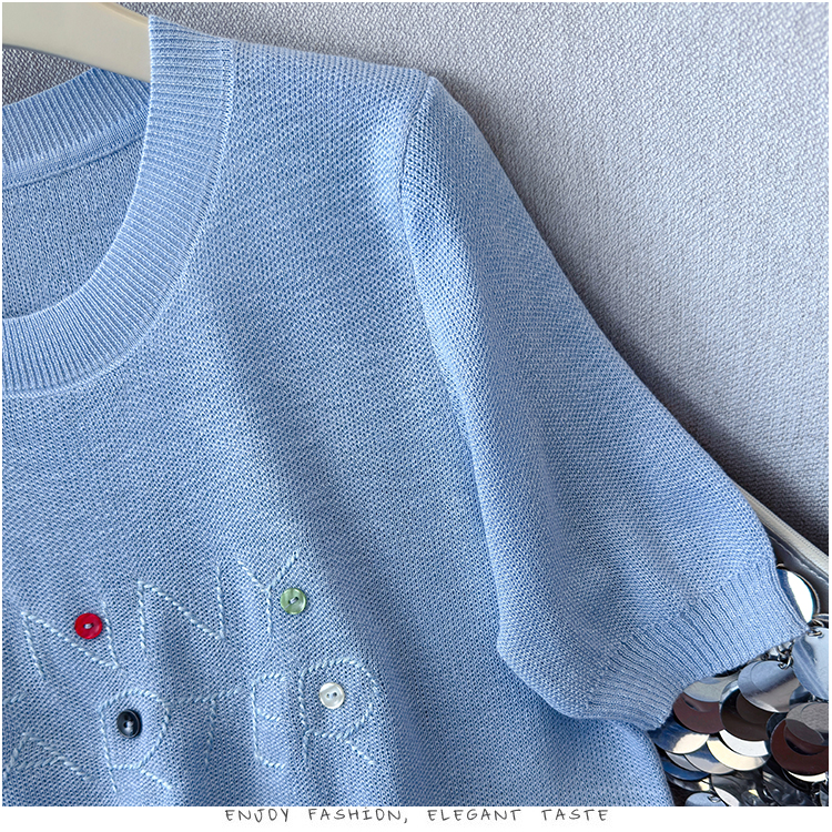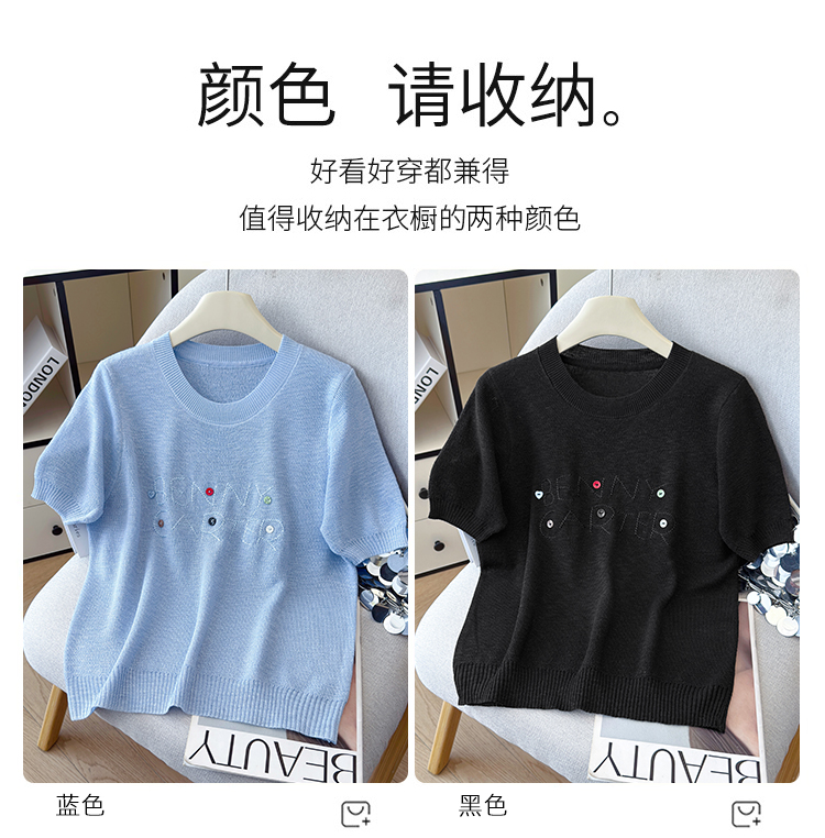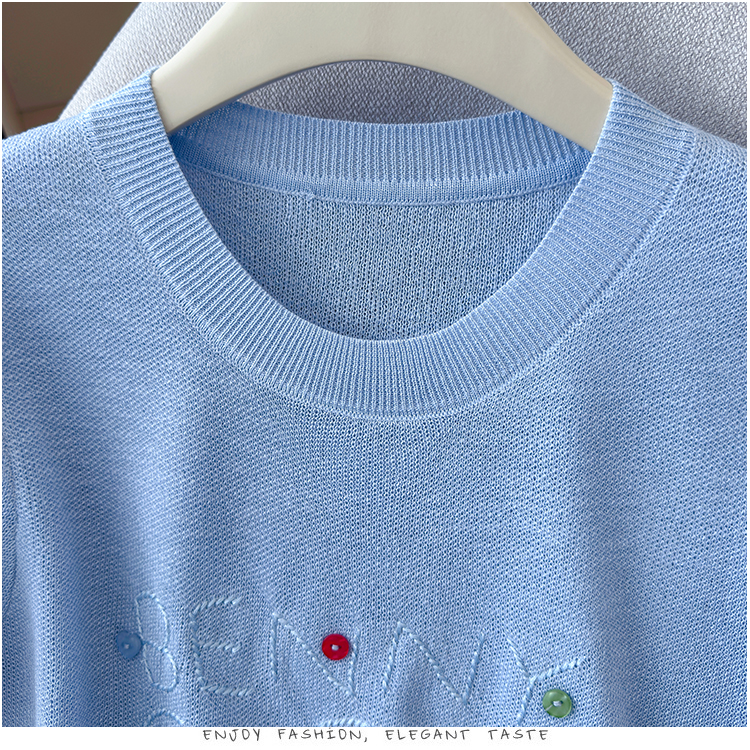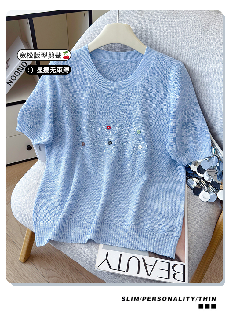 2026年夏季新款时尚百搭圆领宽松刺绣冰丝T恤天丝麻针织衫上衣女