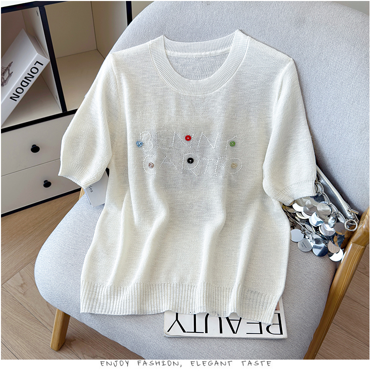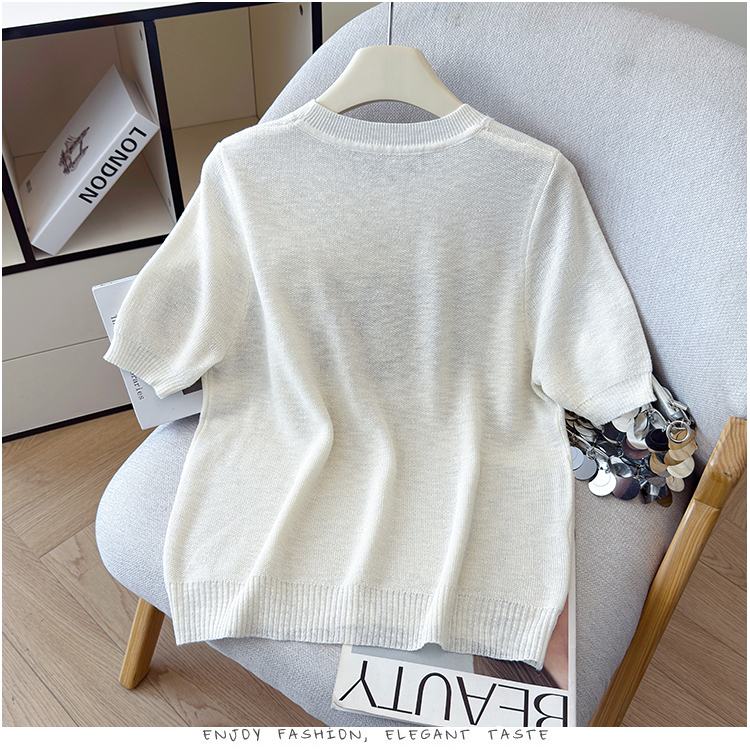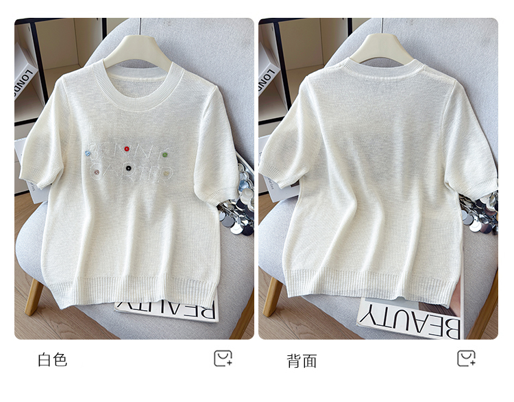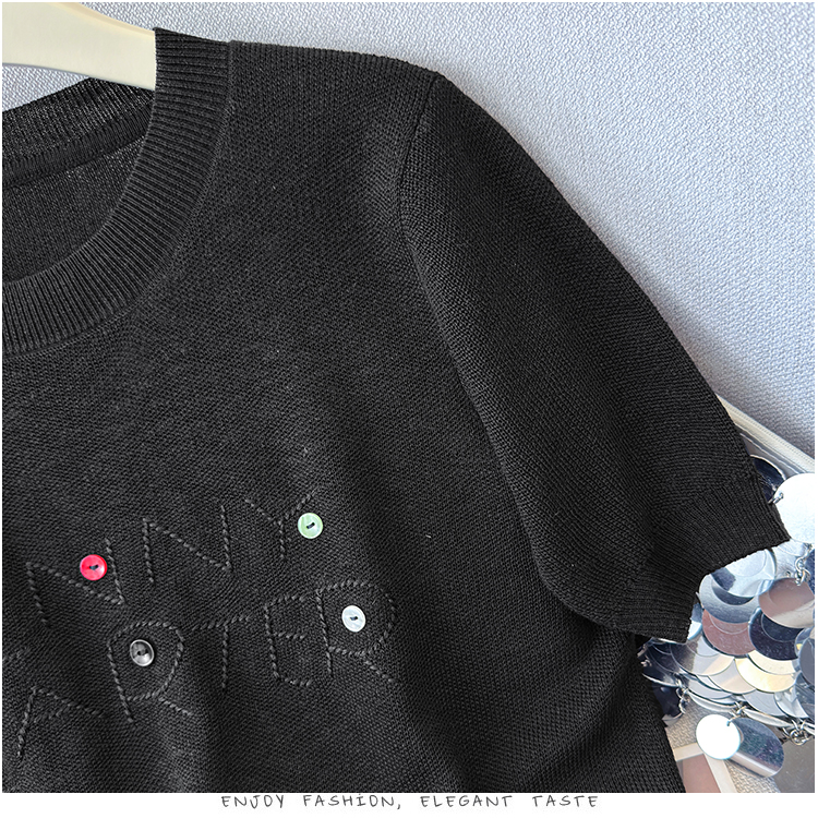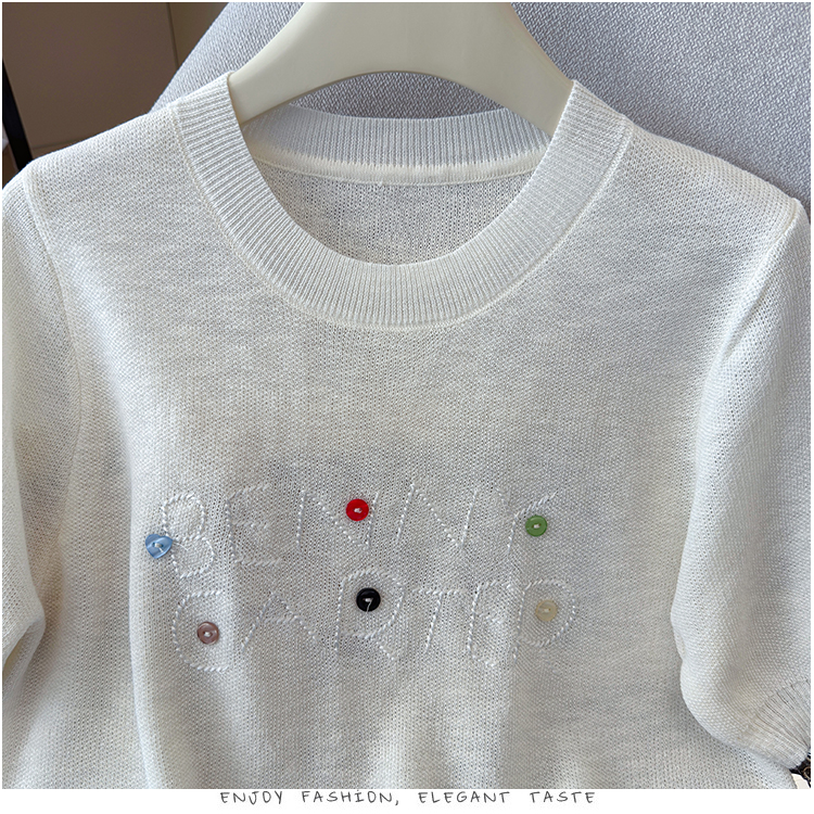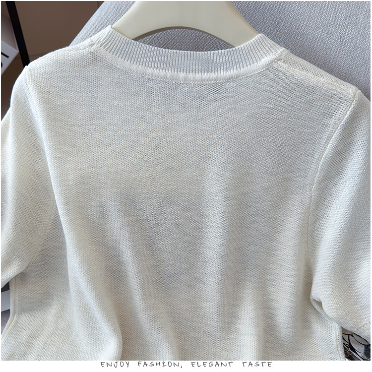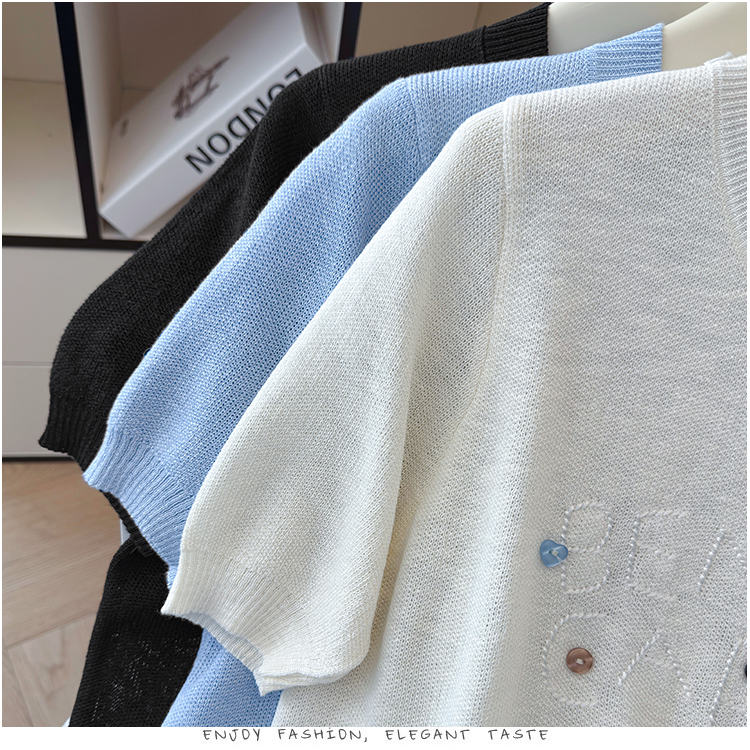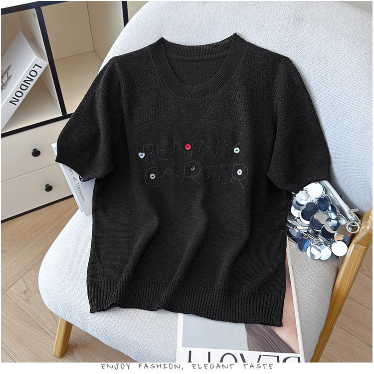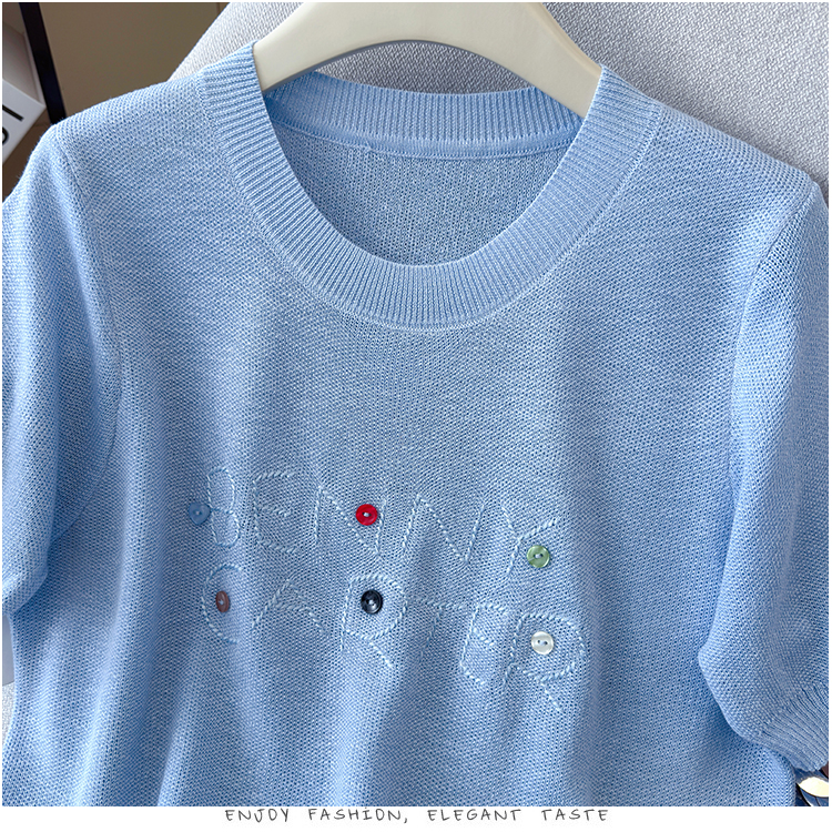 2026年夏季新款时尚百搭圆领宽松刺绣冰丝T恤天丝麻针织衫上衣女