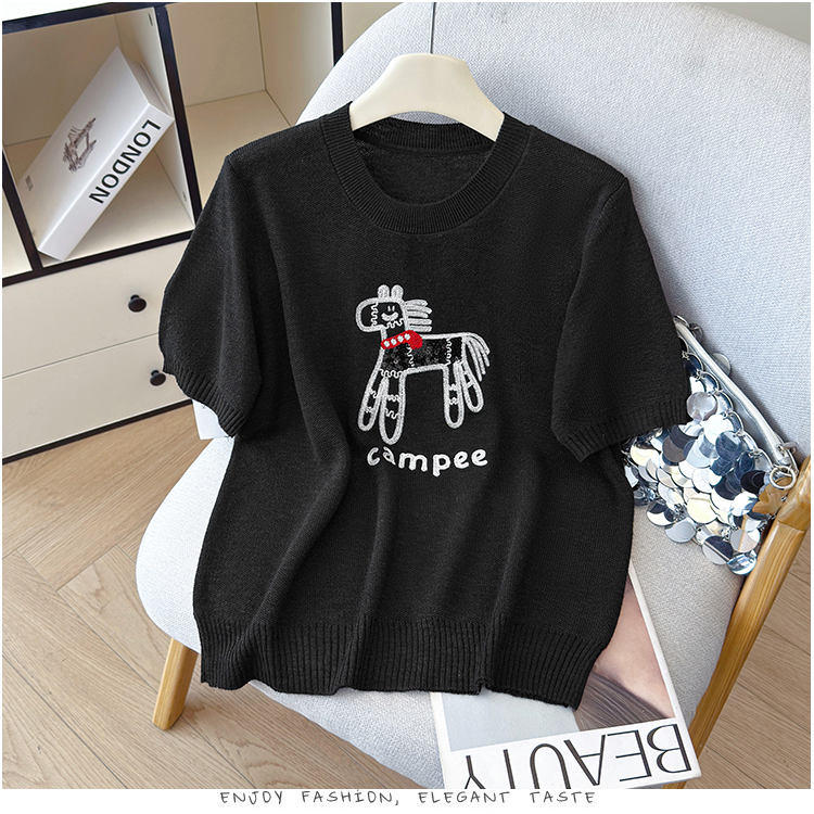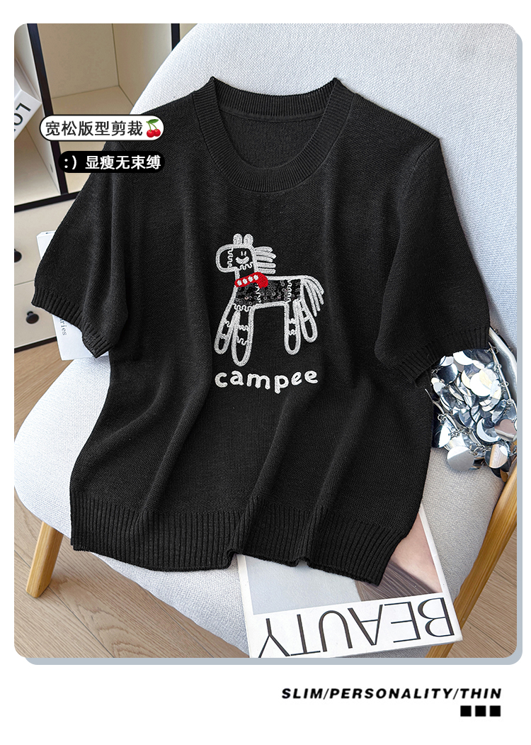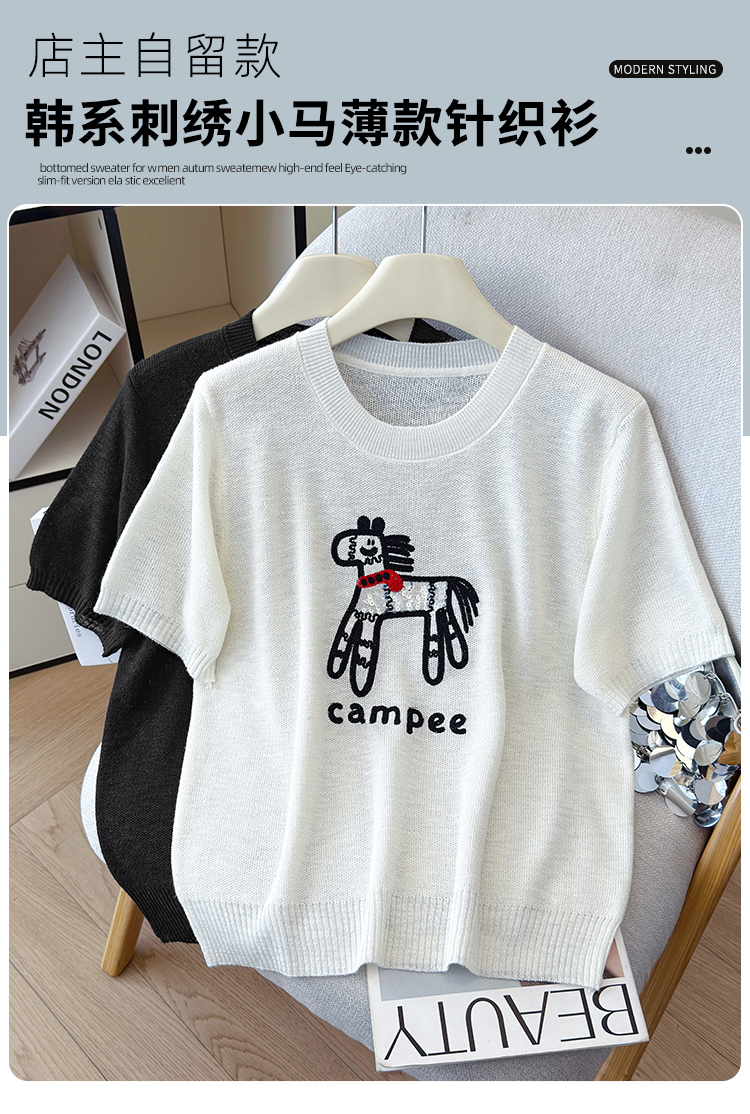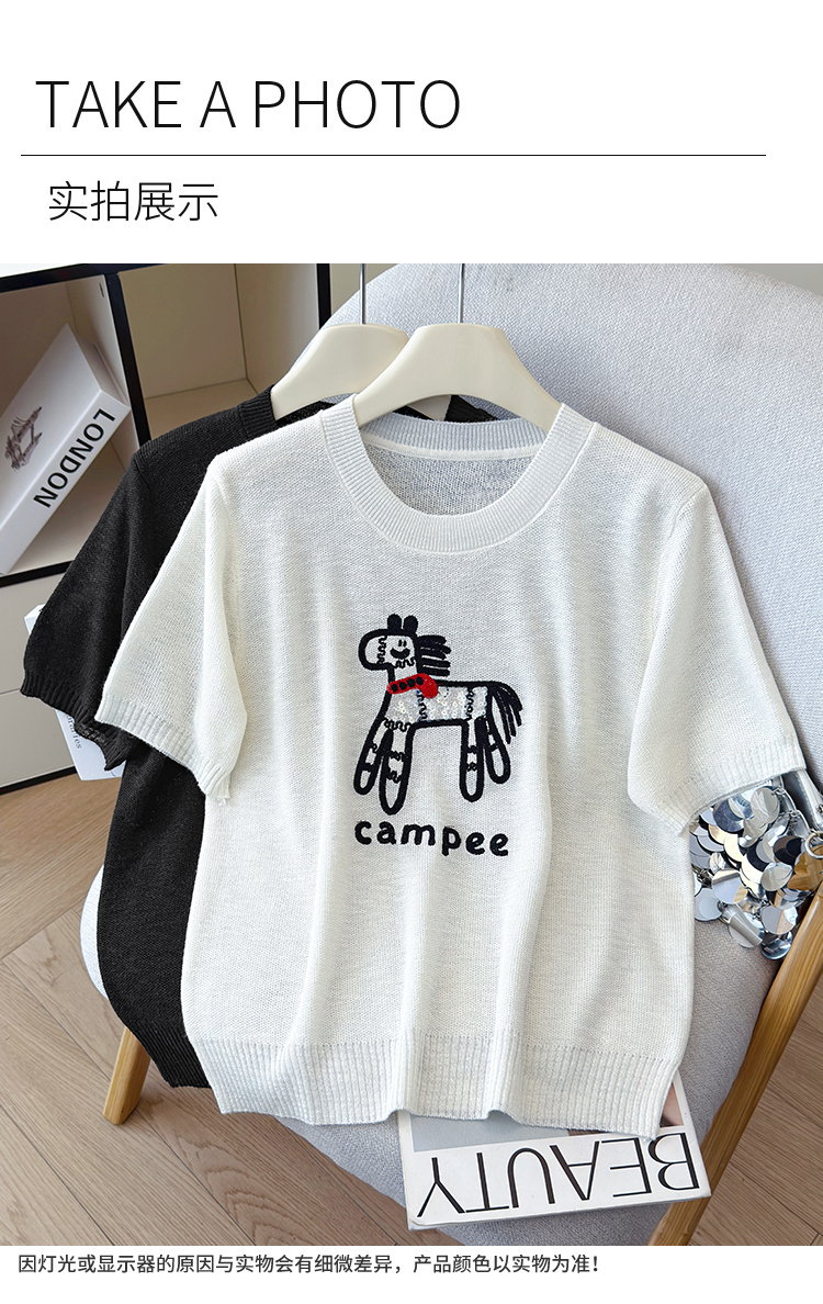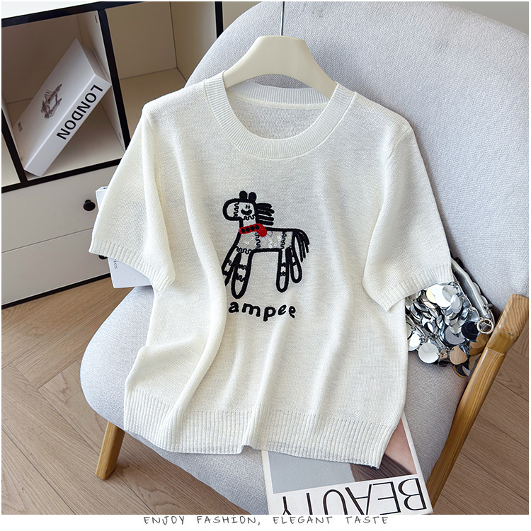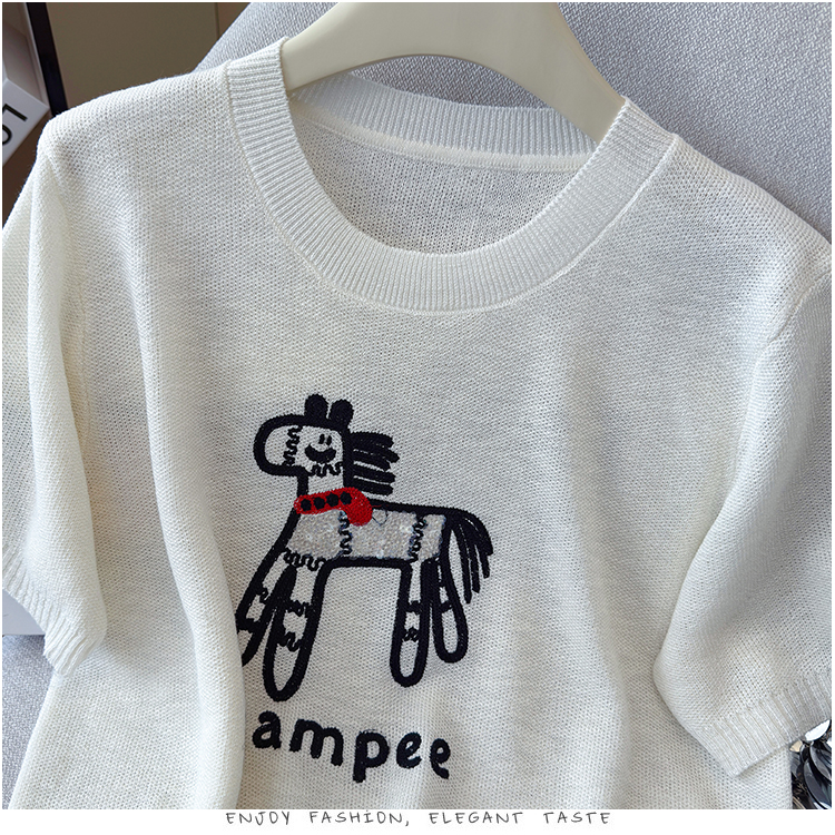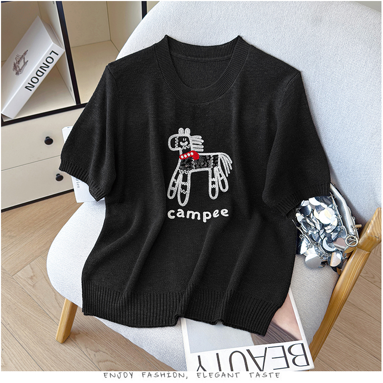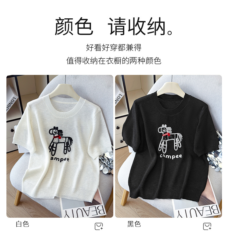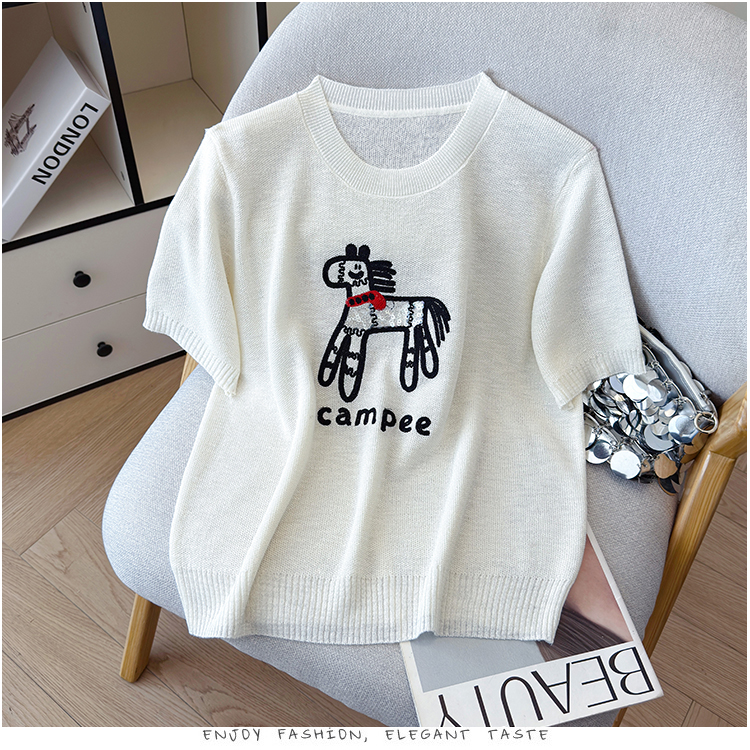 2026夏季新款百搭圆领宽松小马刺绣冰丝T恤天丝麻针织衫上衣女
