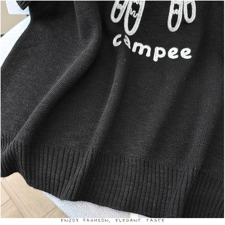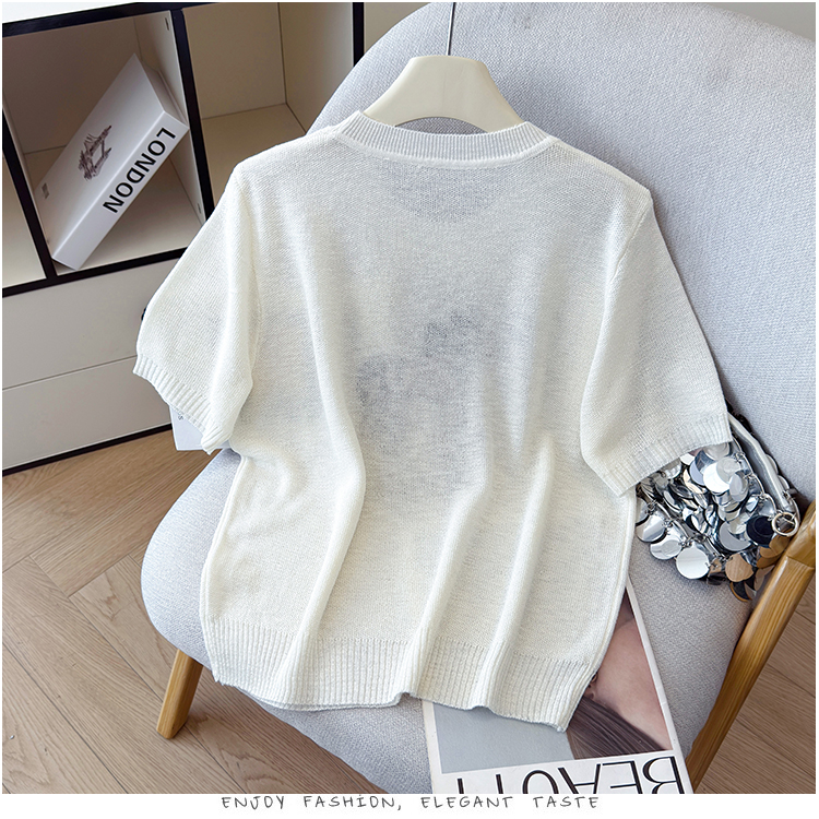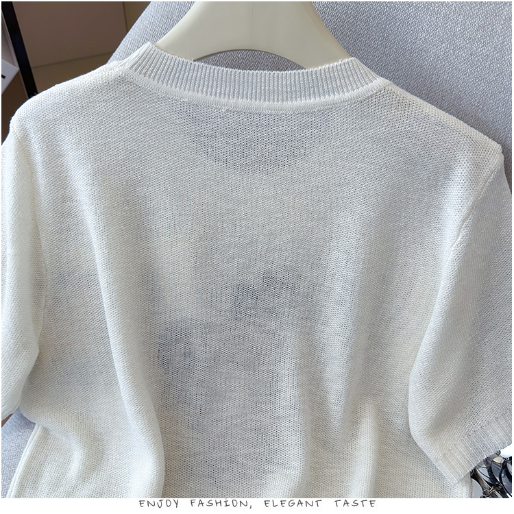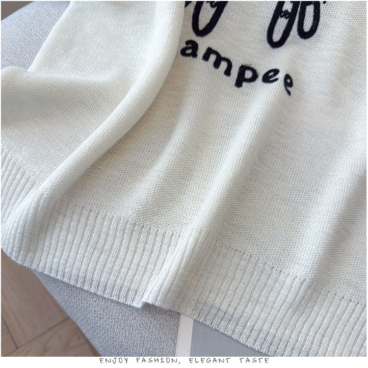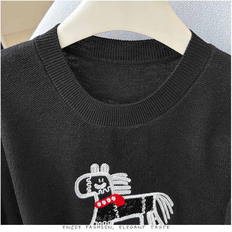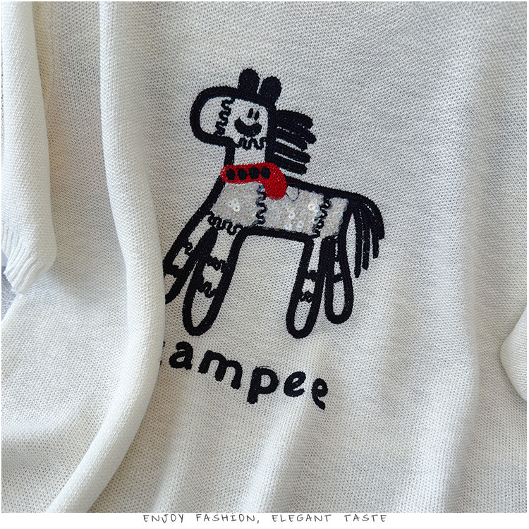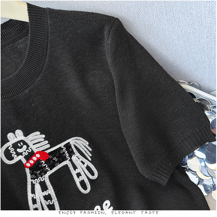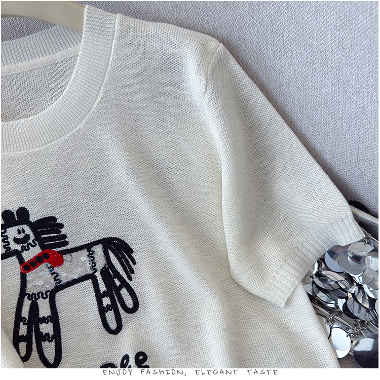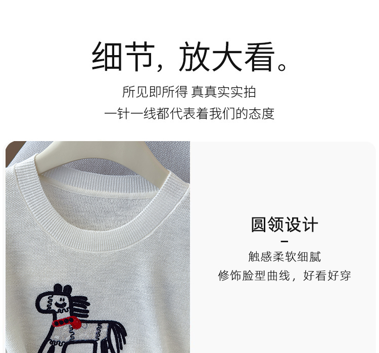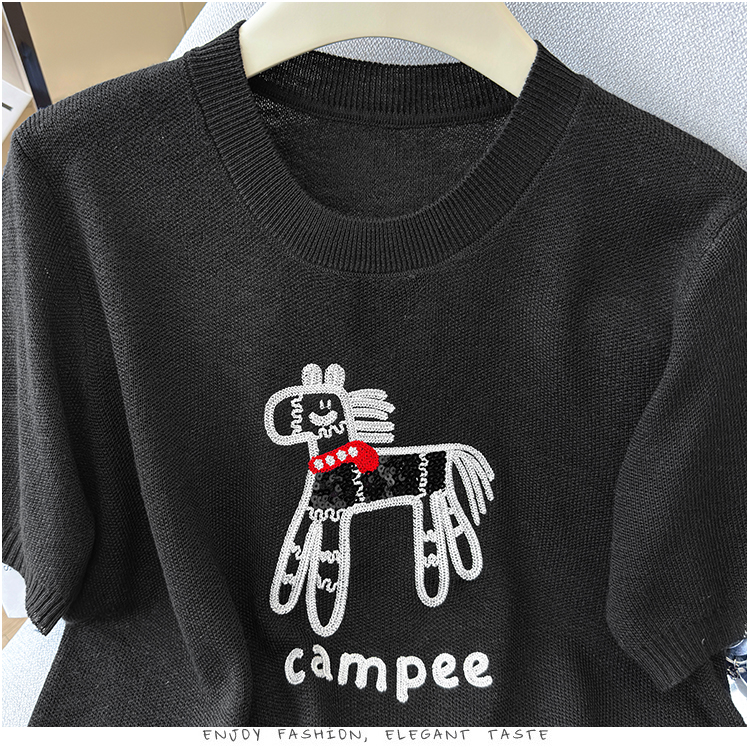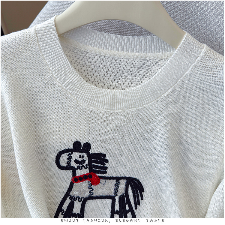 2026夏季新款百搭圆领宽松小马刺绣冰丝T恤天丝麻针织衫上衣女