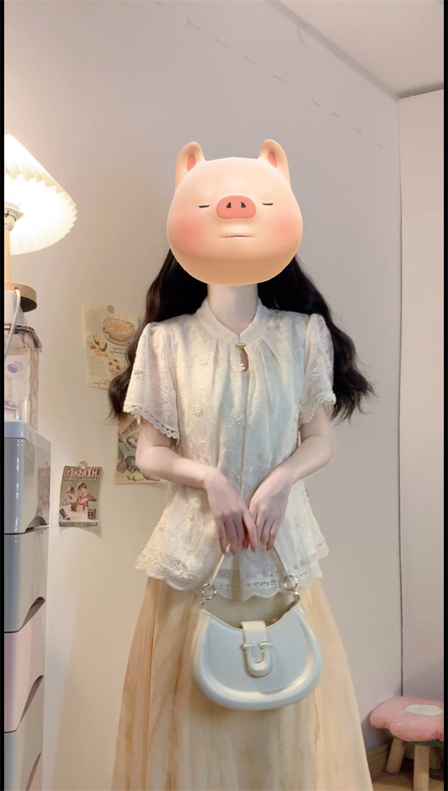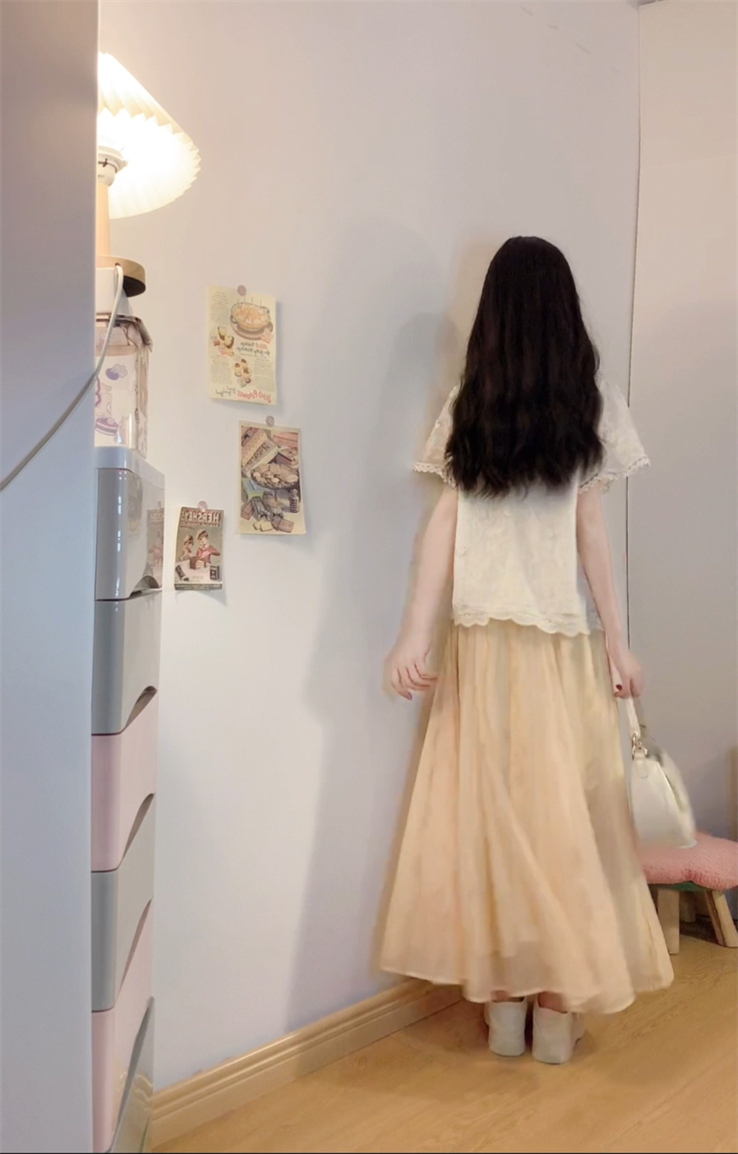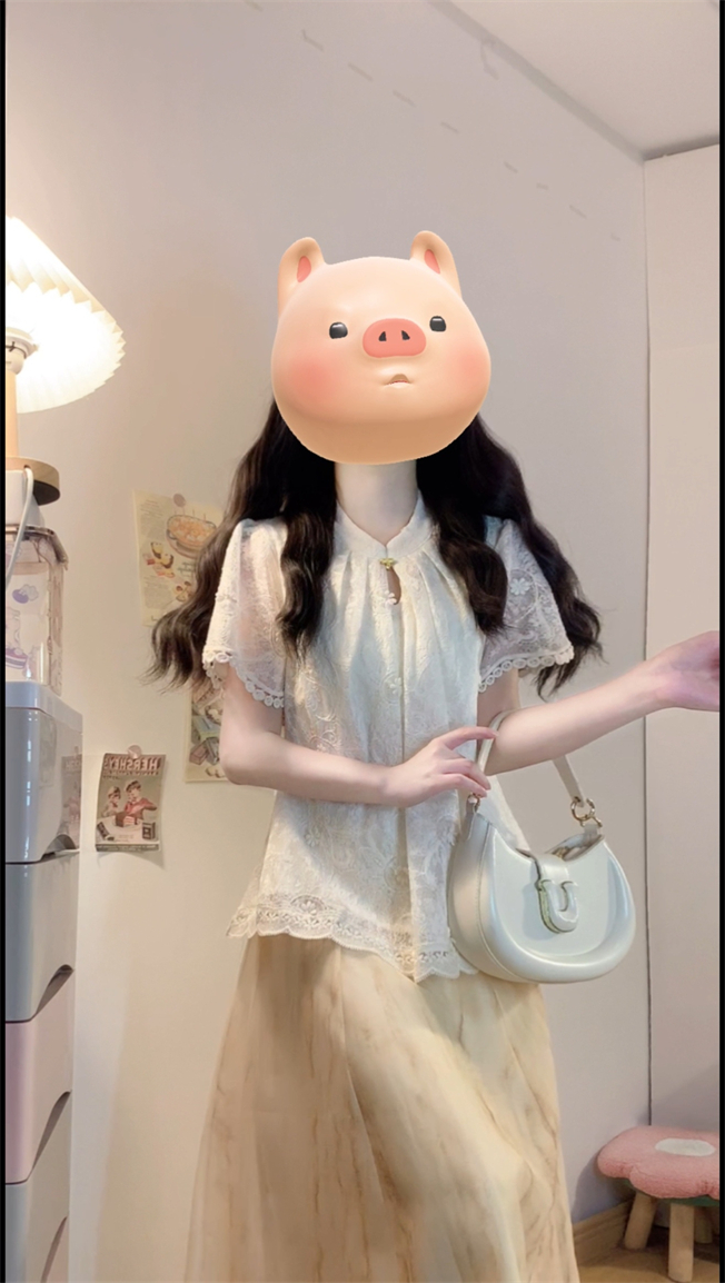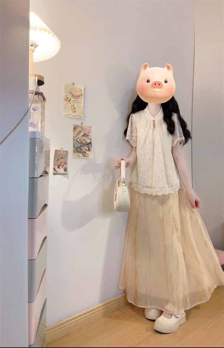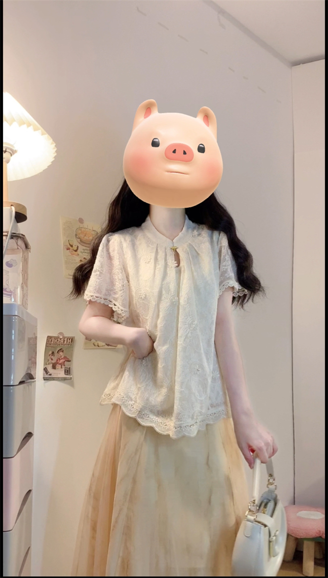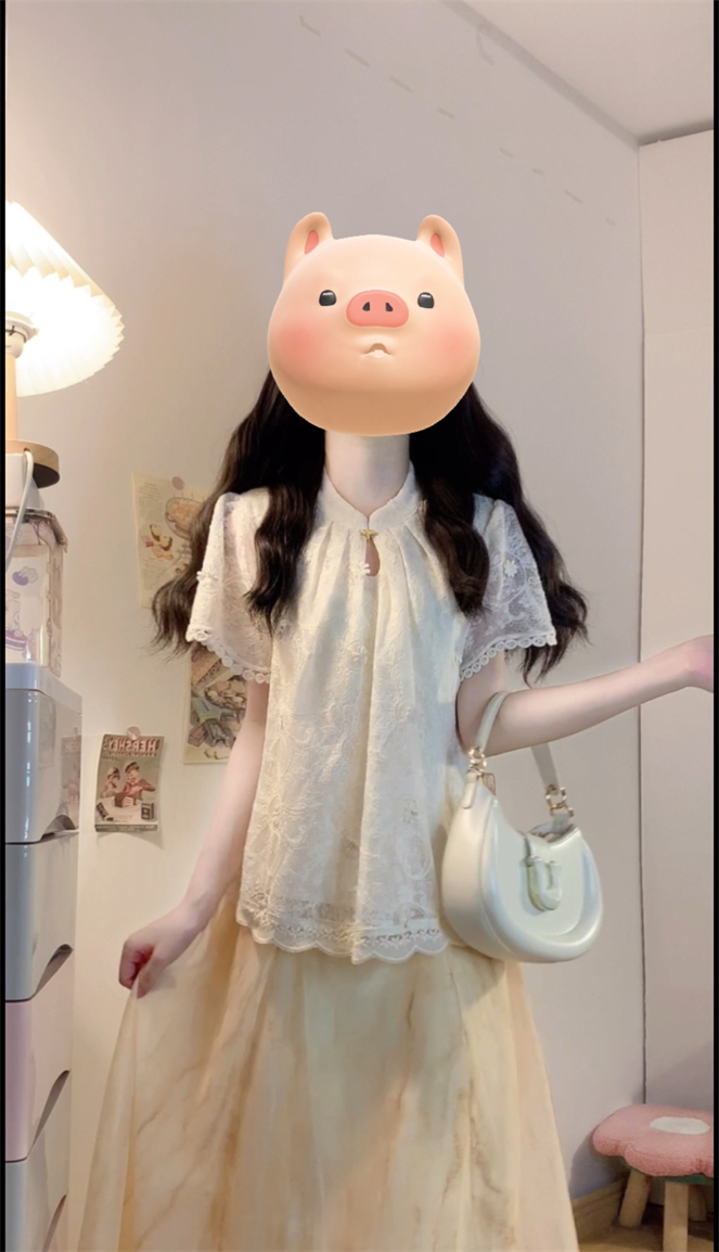 实拍~新中式国风钩花蕾丝拼接高级感大码女装上衣+晕染半身裙套装