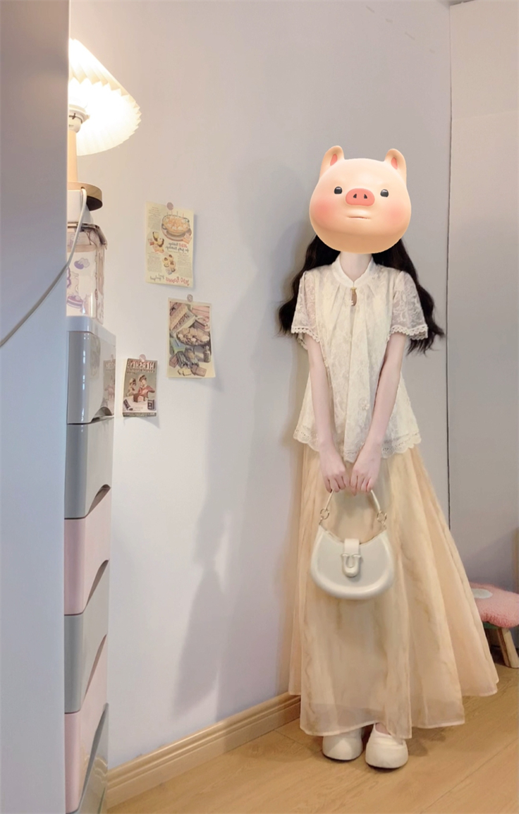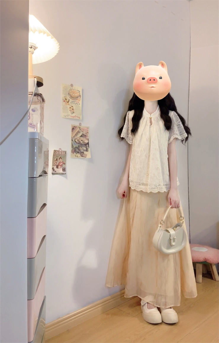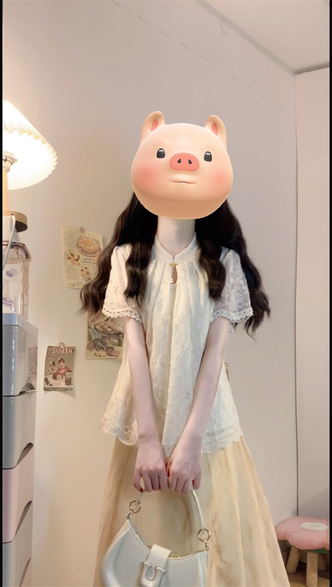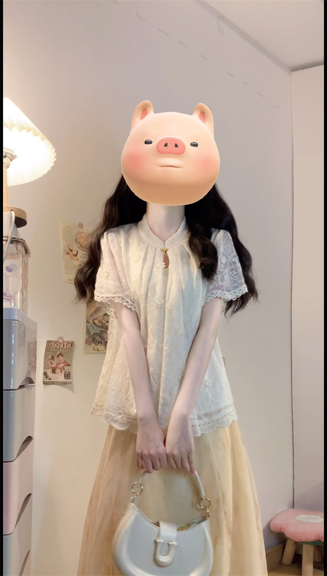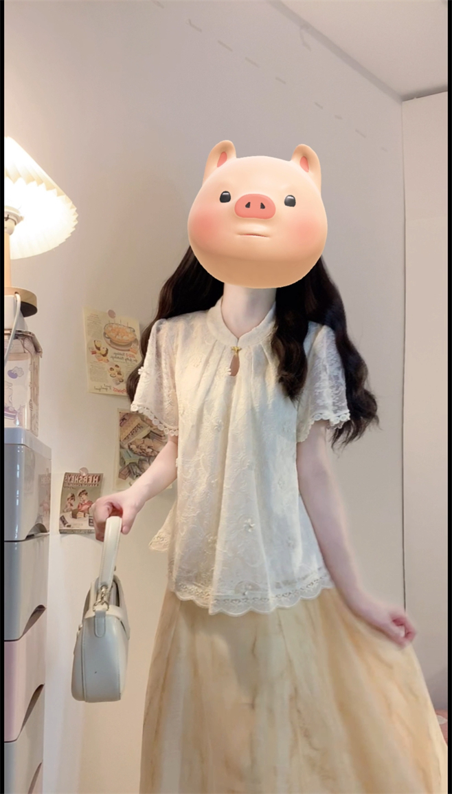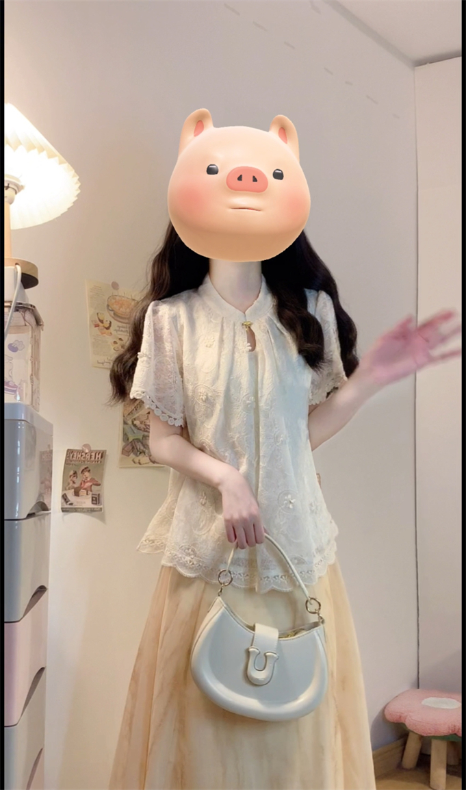 实拍~新中式国风钩花蕾丝拼接高级感大码女装上衣+晕染半身裙套装