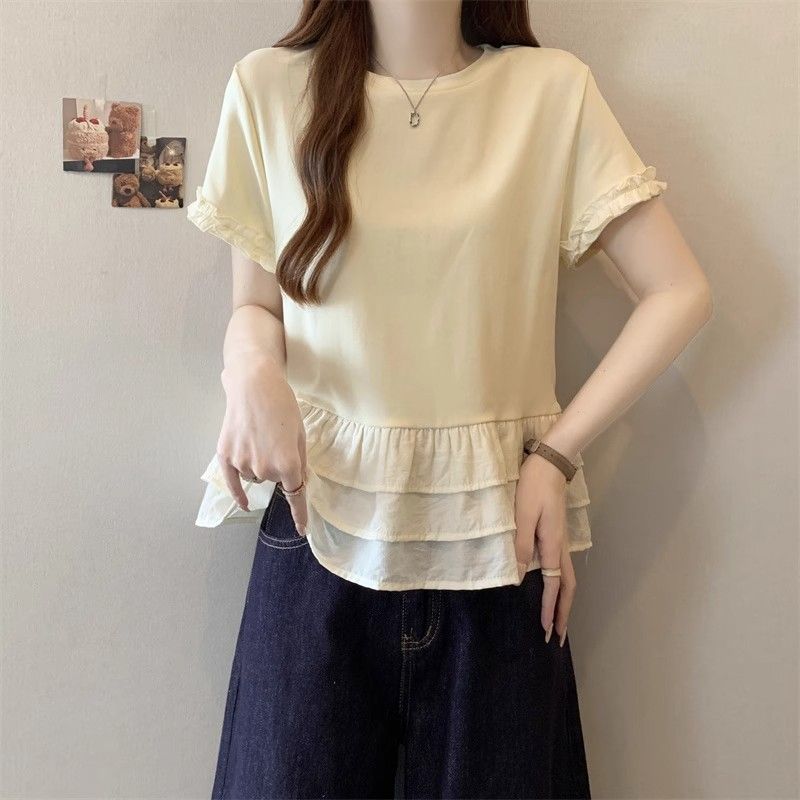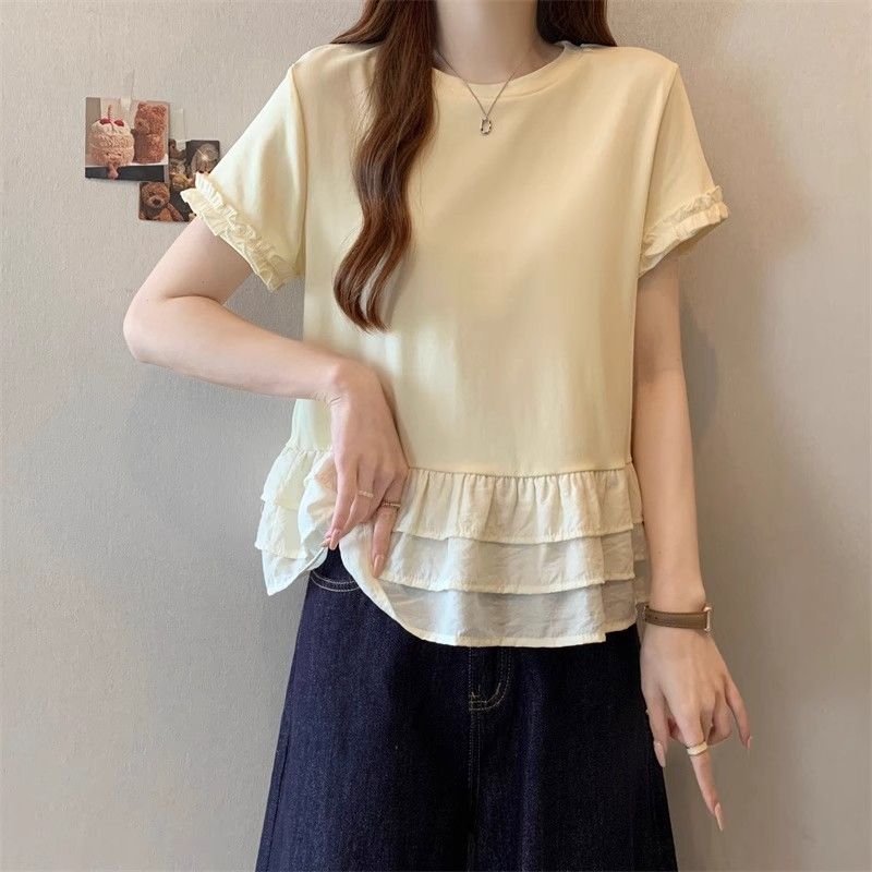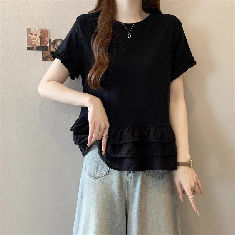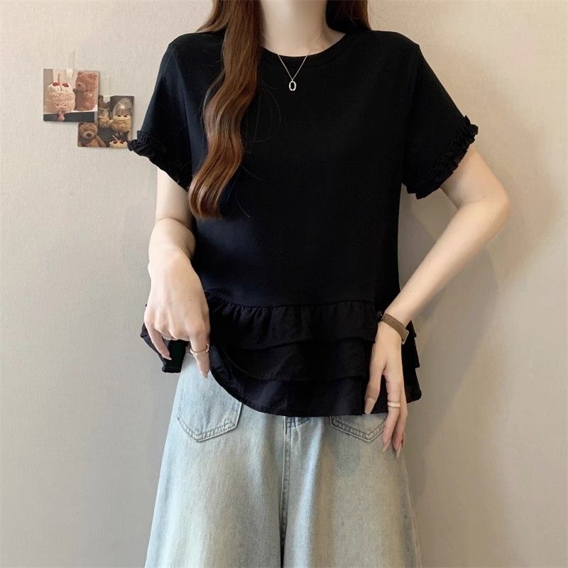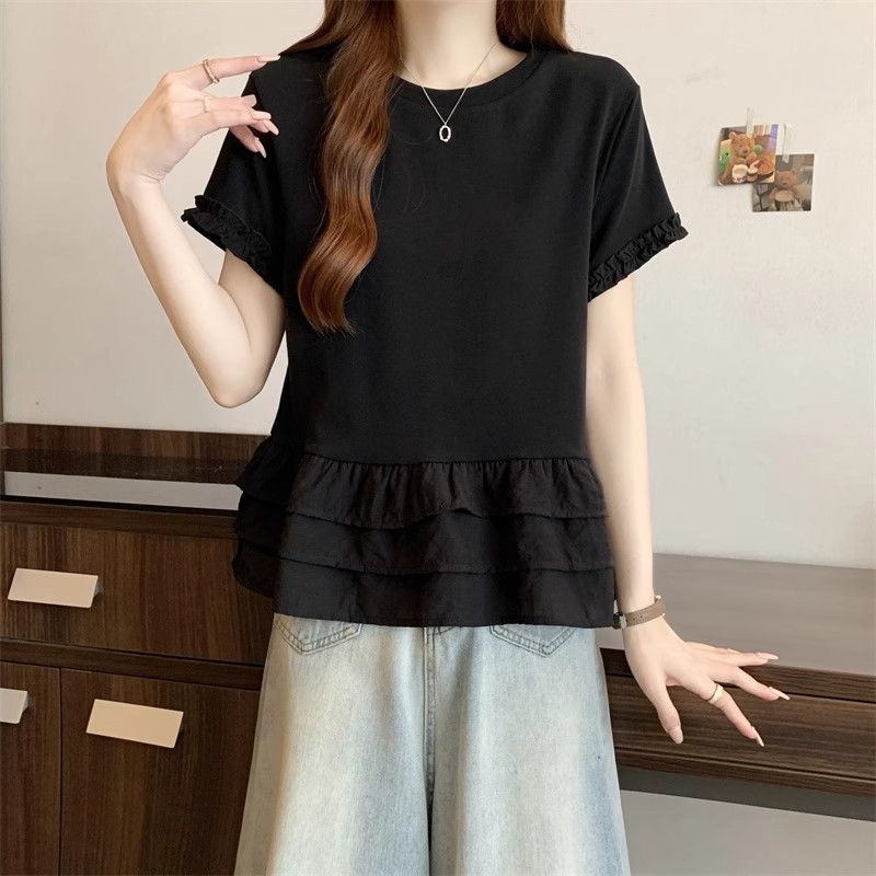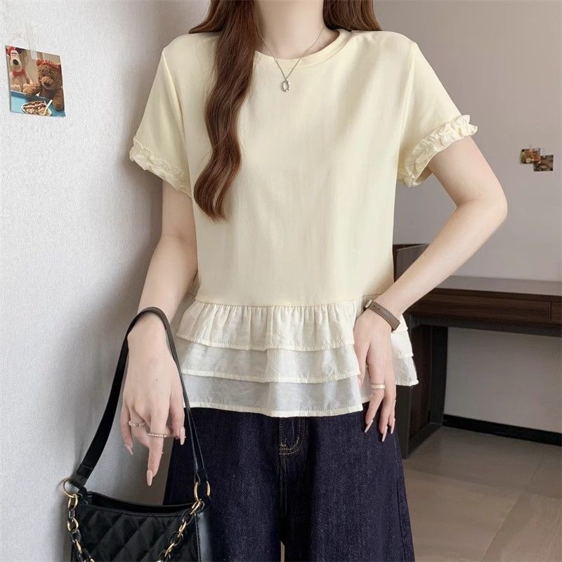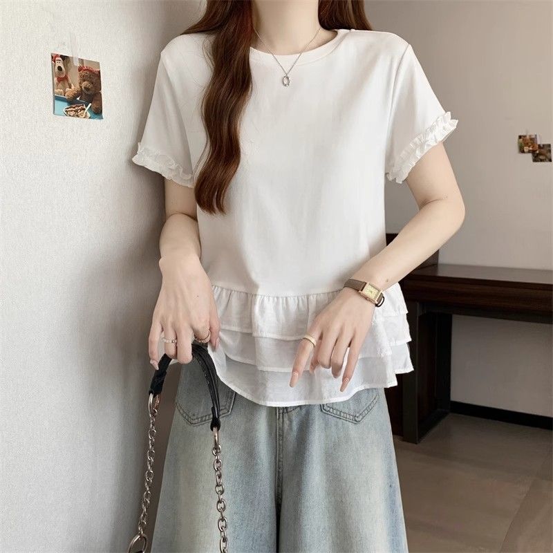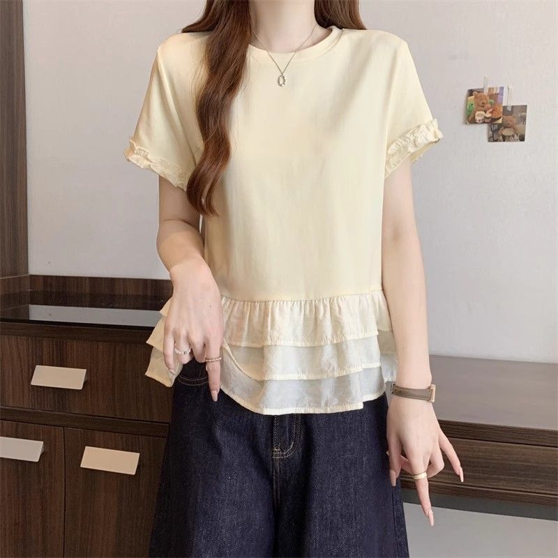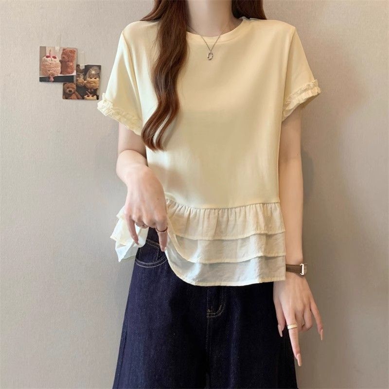 纯色时尚正肩圆领短袖t恤女2026年夏季新款荷叶拼接裙摆宽松上衣