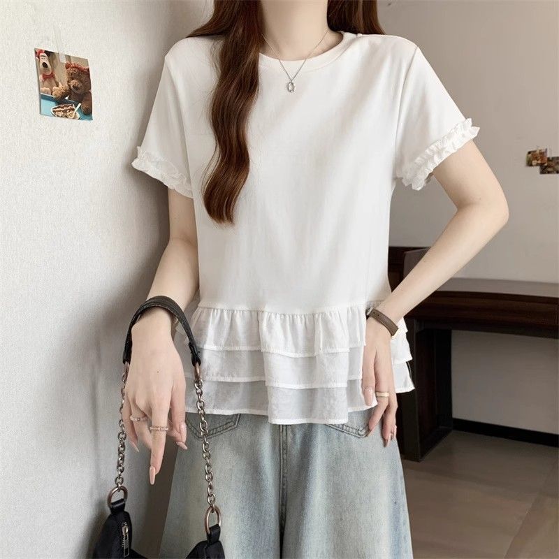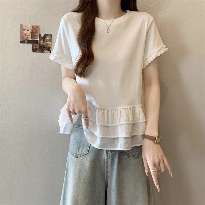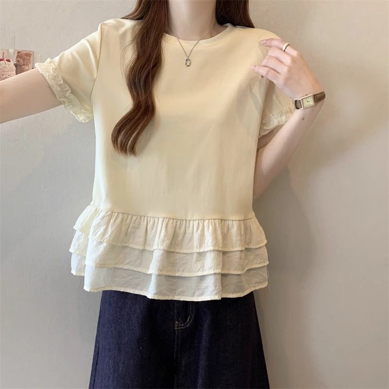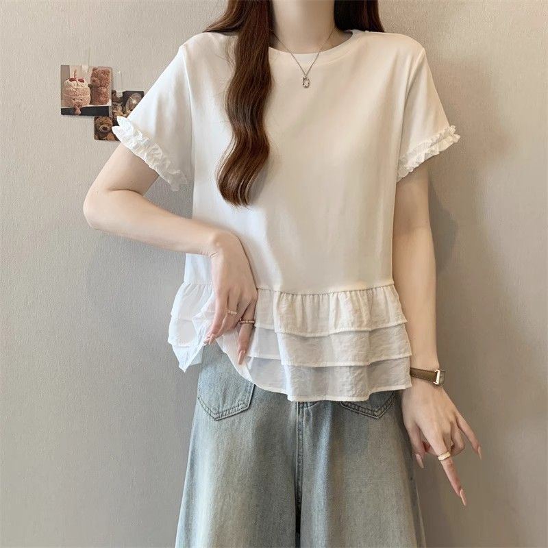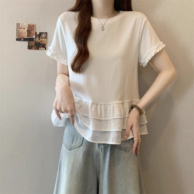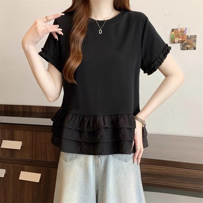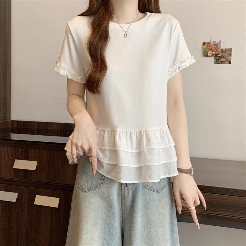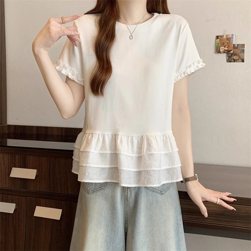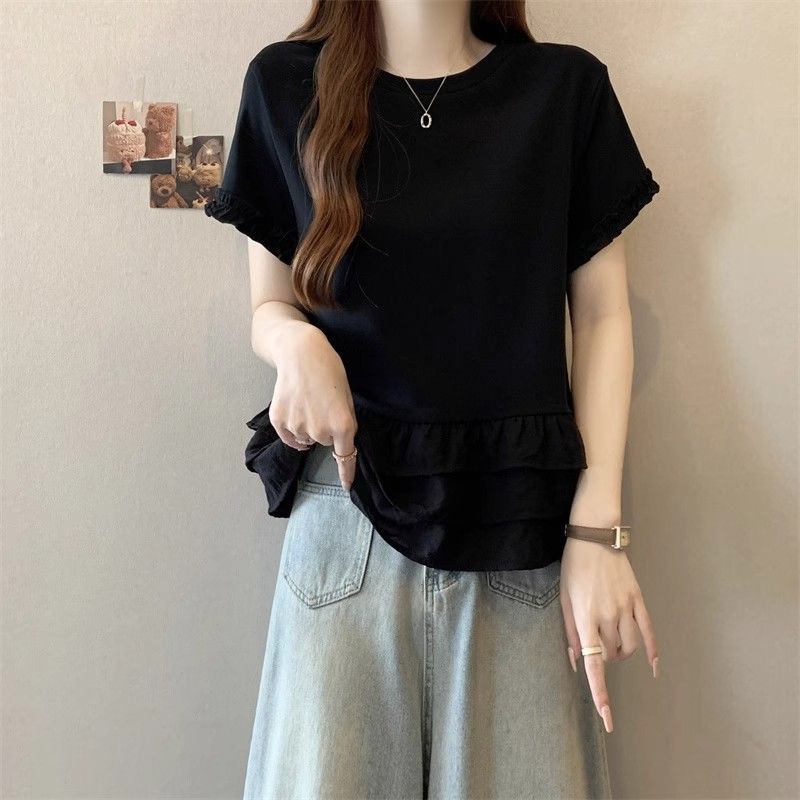 纯色时尚正肩圆领短袖t恤女2026年夏季新款荷叶拼接裙摆宽松上衣