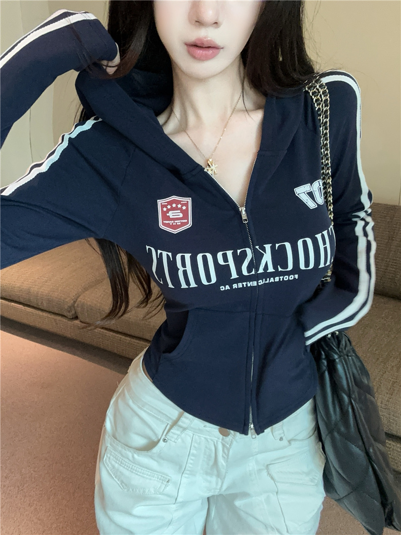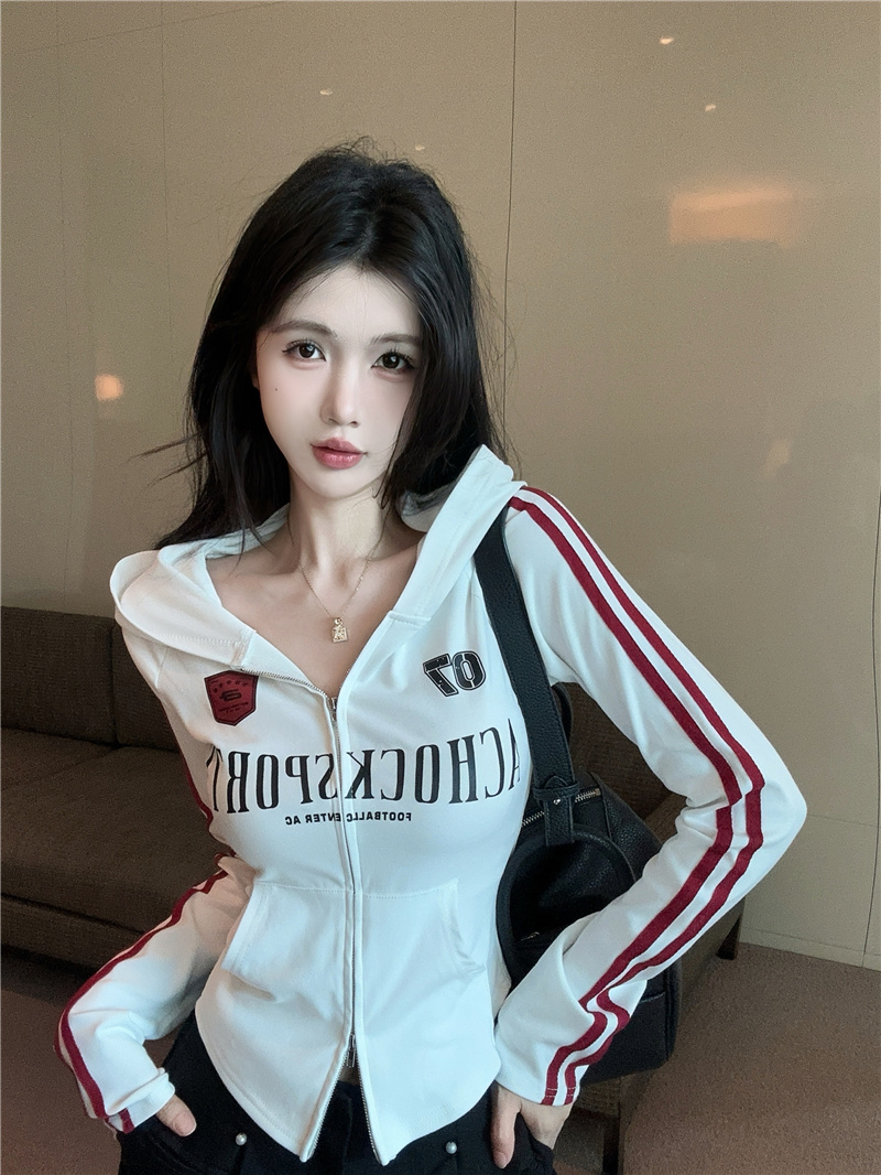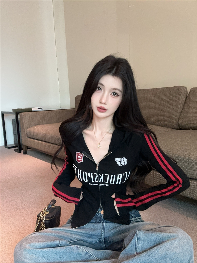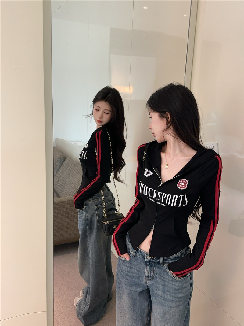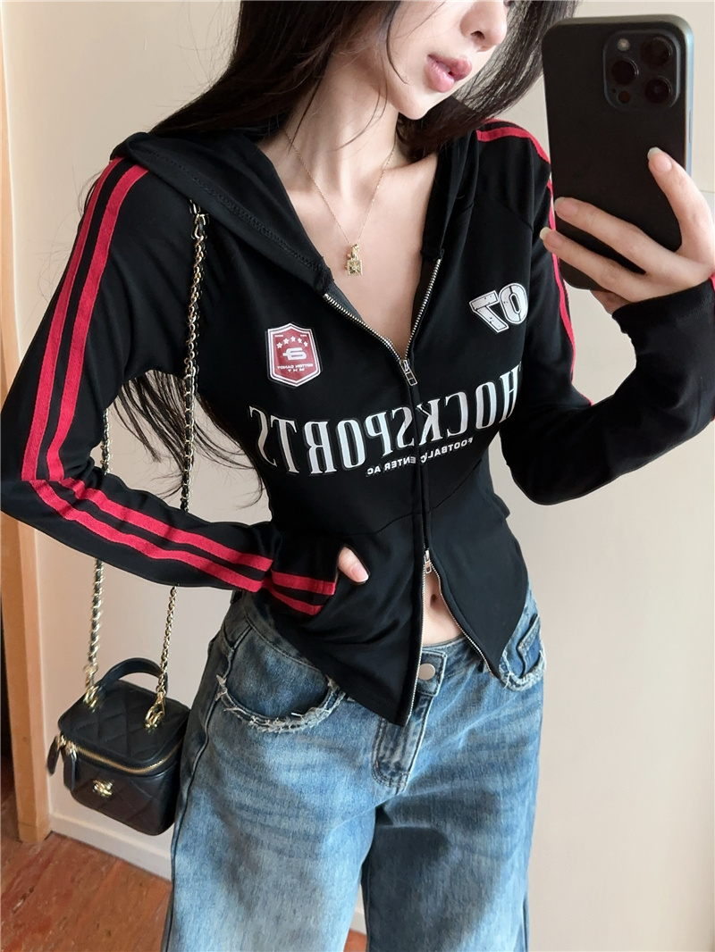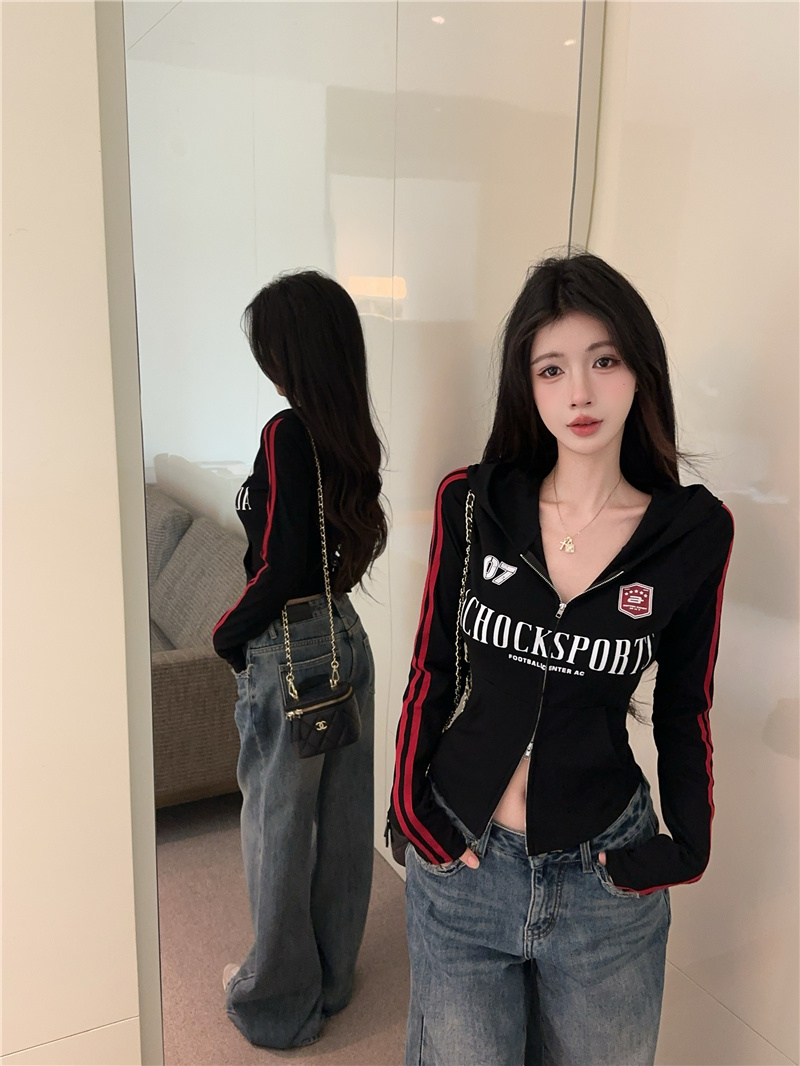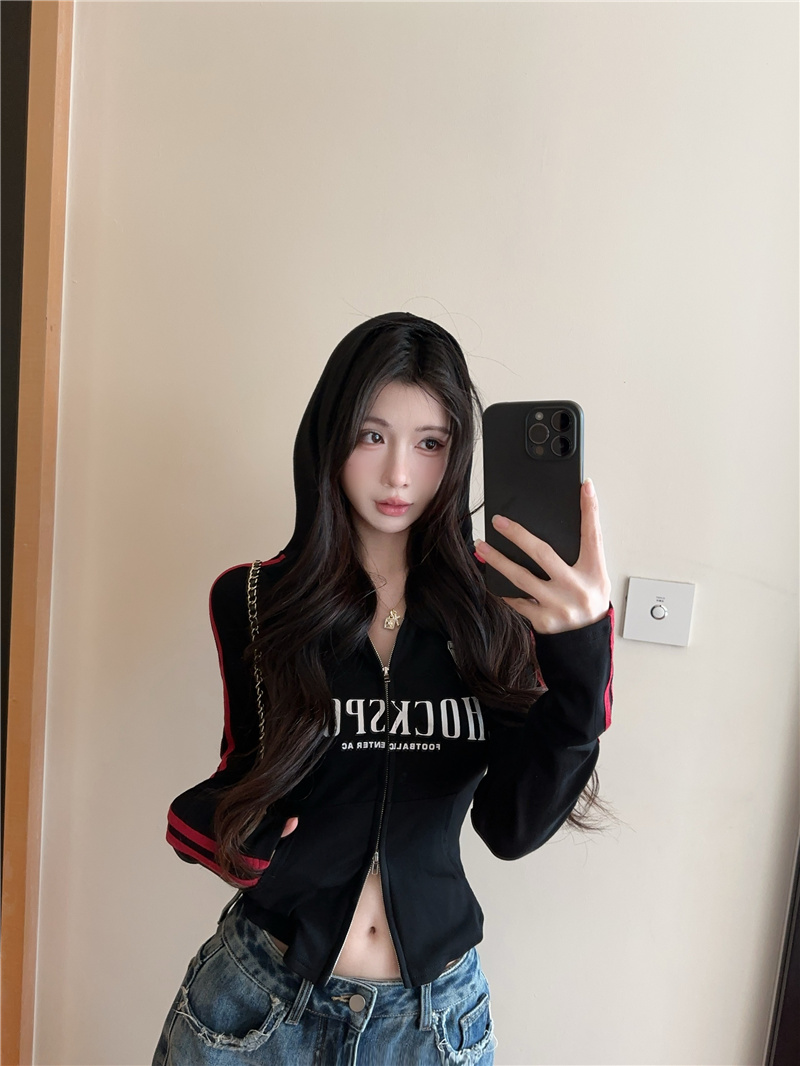 实价实拍~美式辣妹设计感连帽外套修身显瘦洋气字母印花拉链上衣