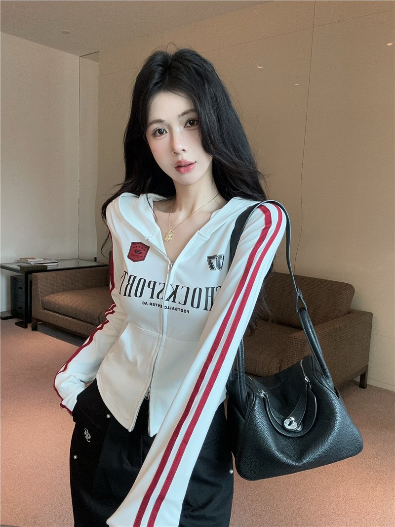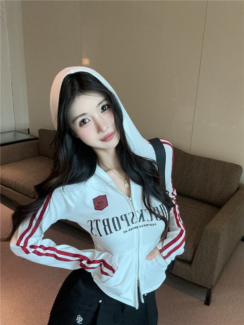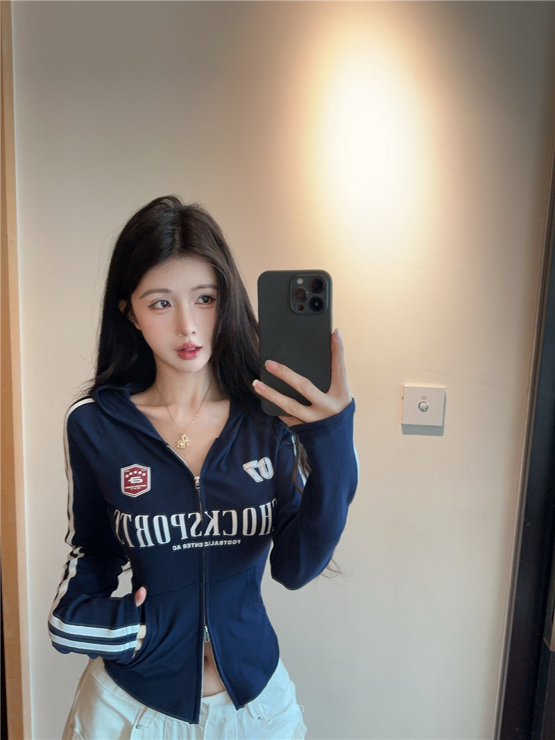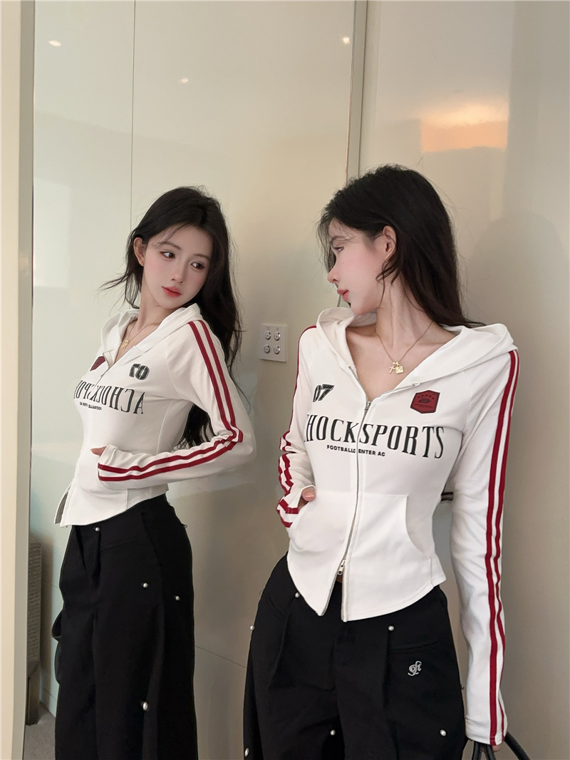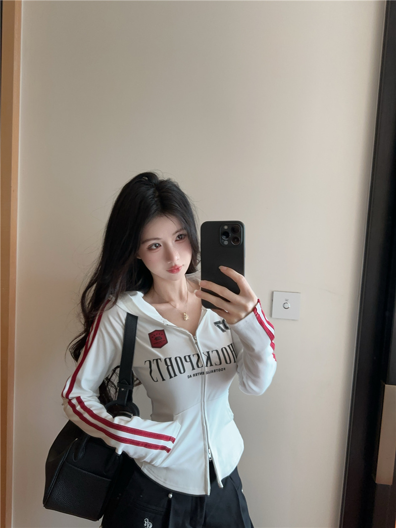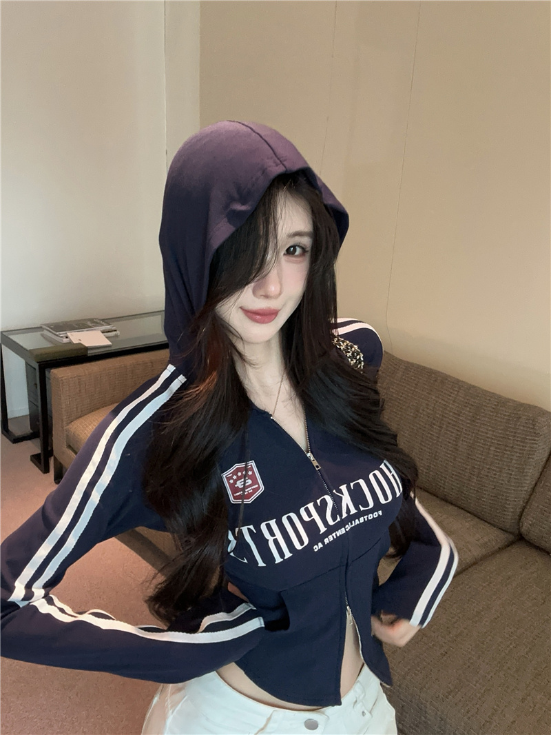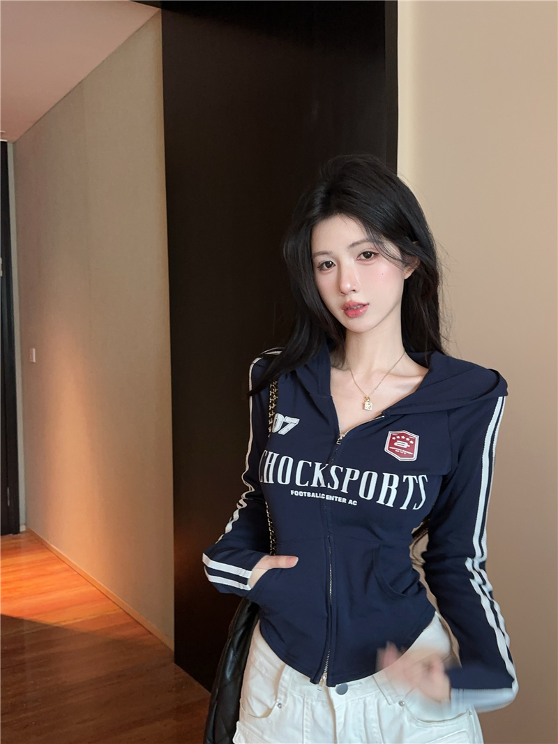 实价实拍~美式辣妹设计感连帽外套修身显瘦洋气字母印花拉链上衣