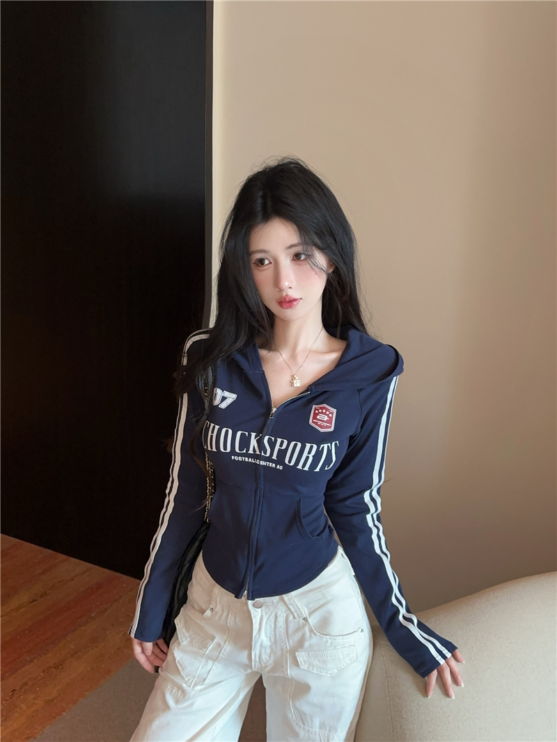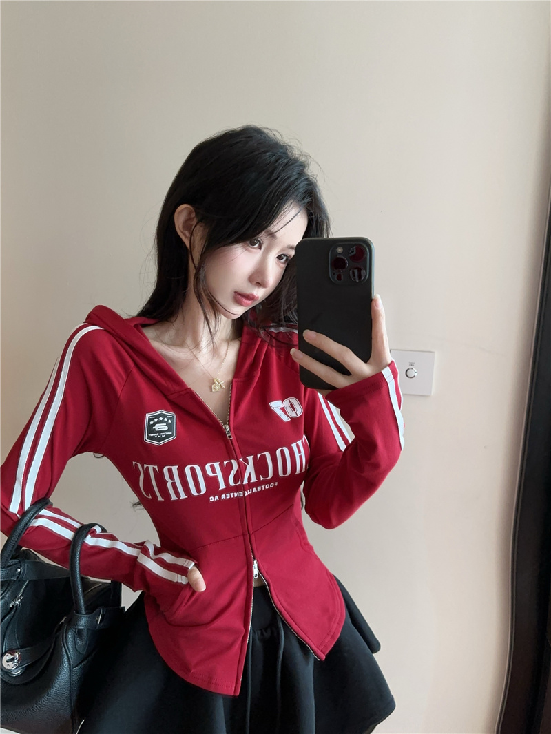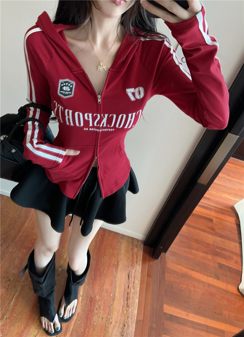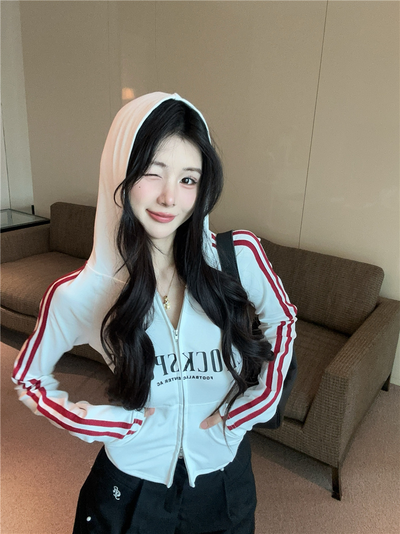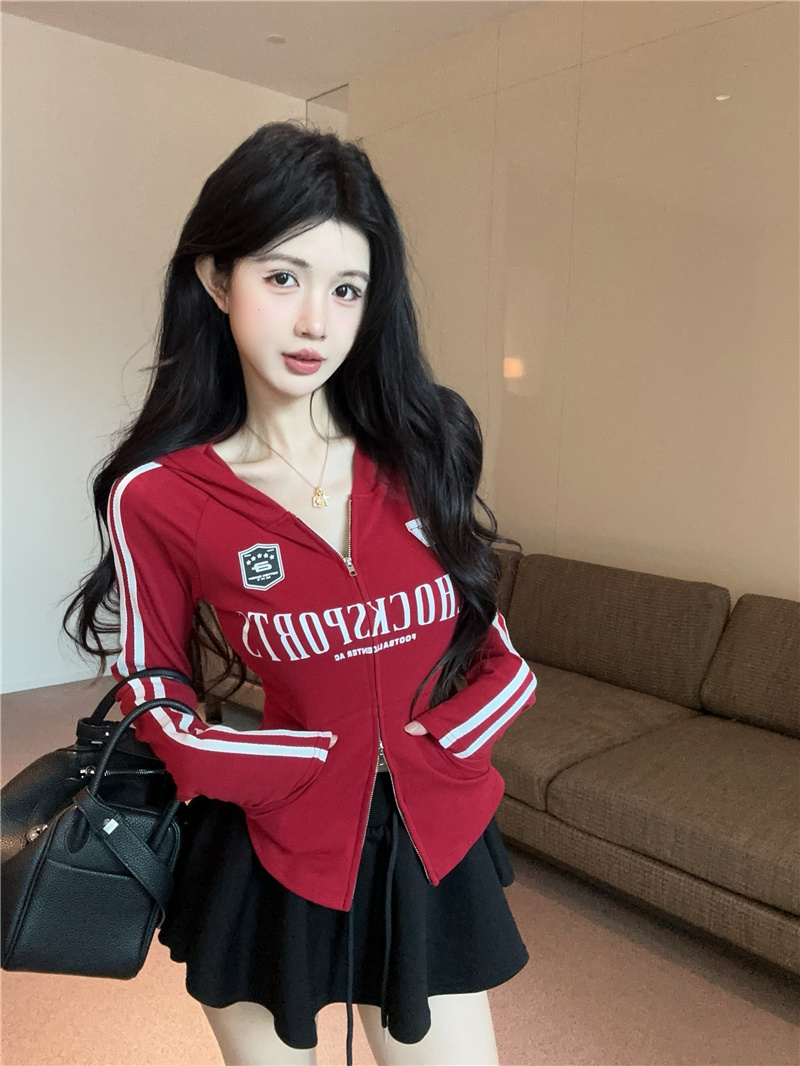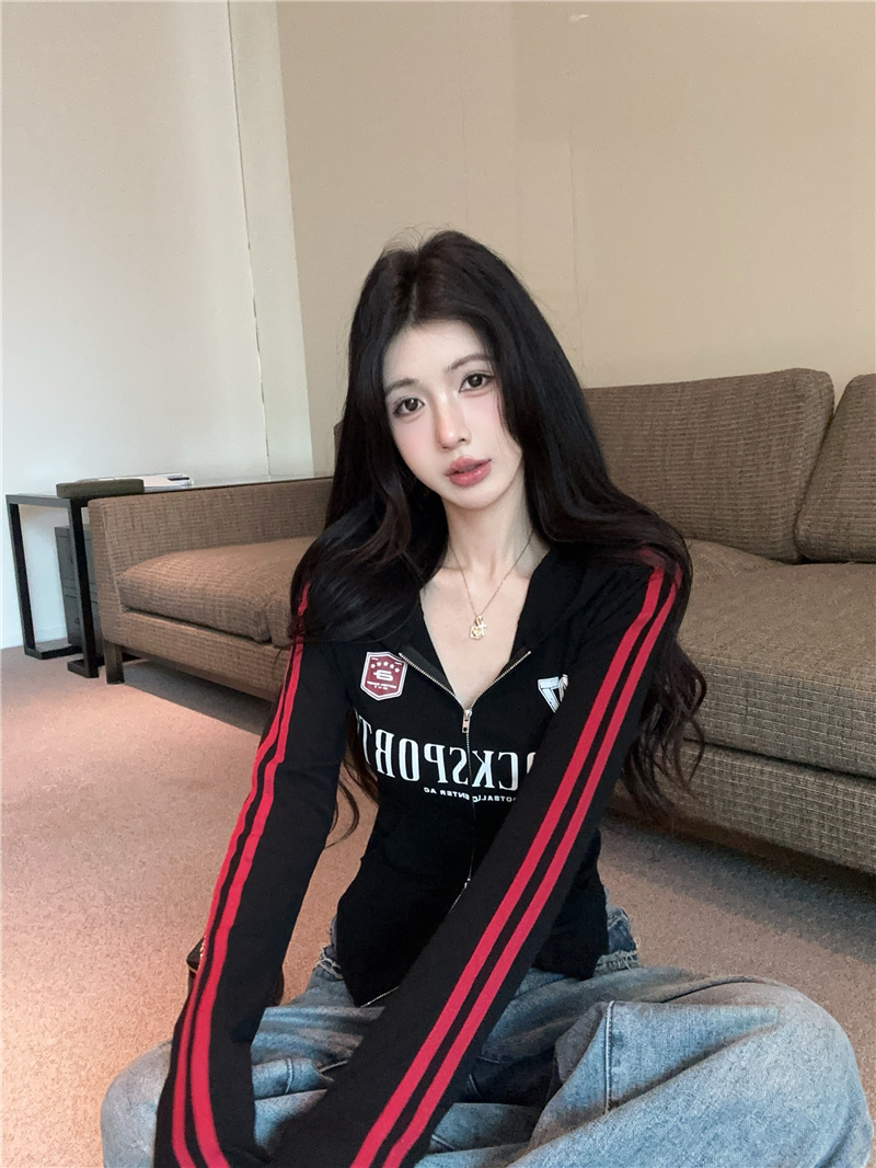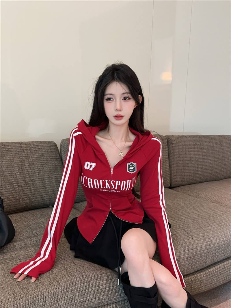 实价实拍~美式辣妹设计感连帽外套修身显瘦洋气字母印花拉链上衣