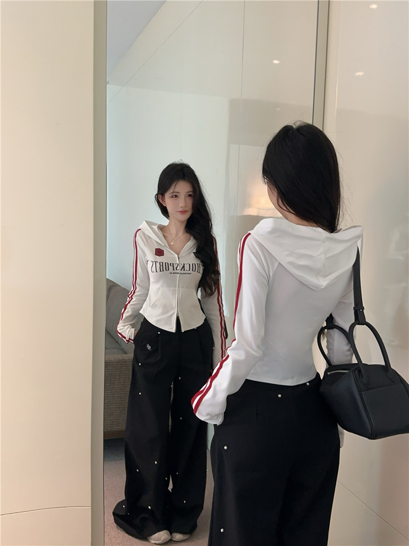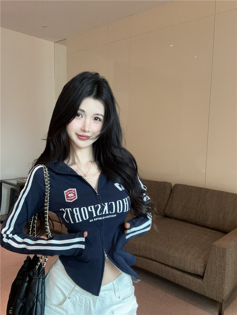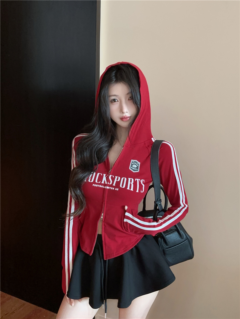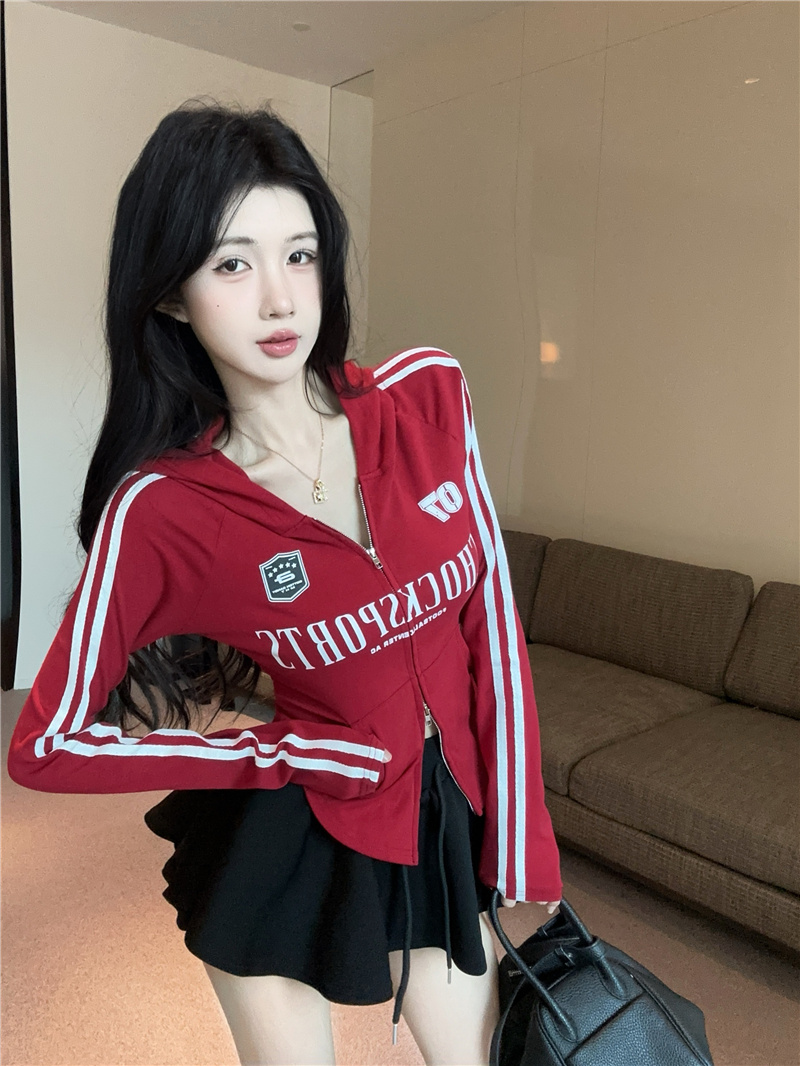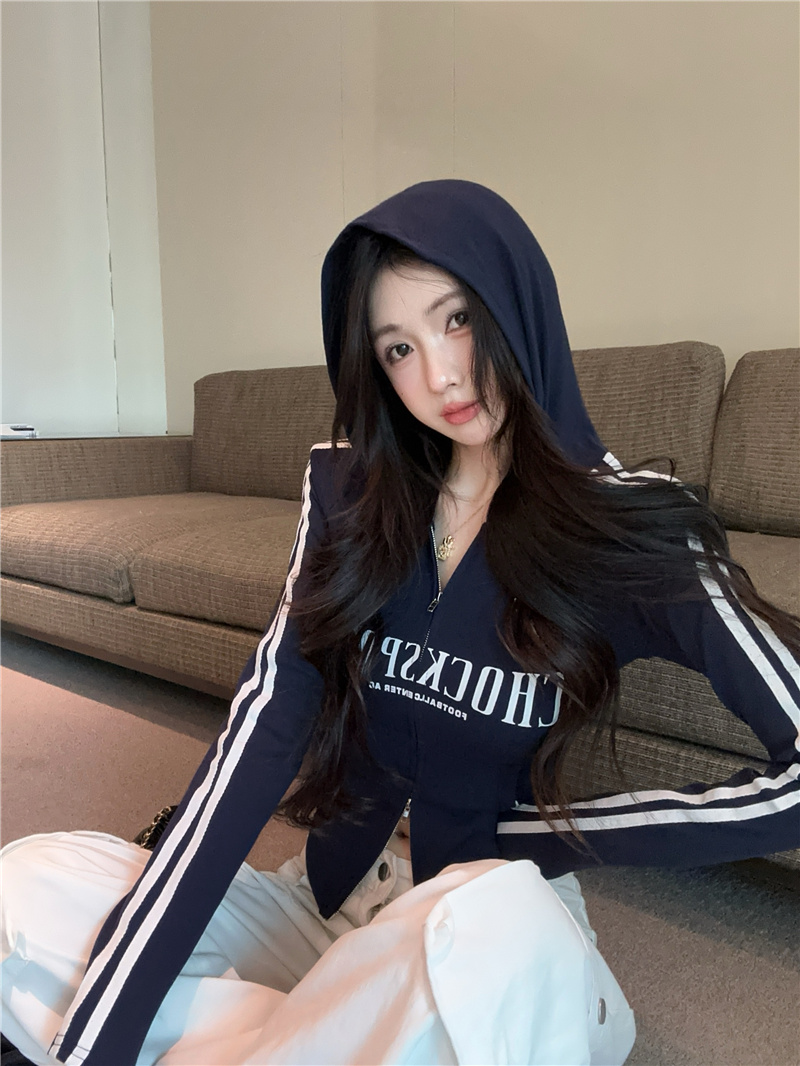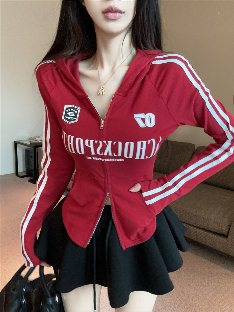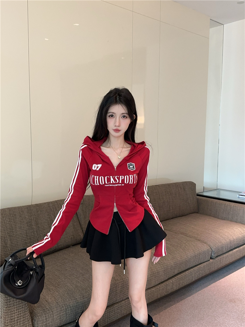 实价实拍~美式辣妹设计感连帽外套修身显瘦洋气字母印花拉链上衣