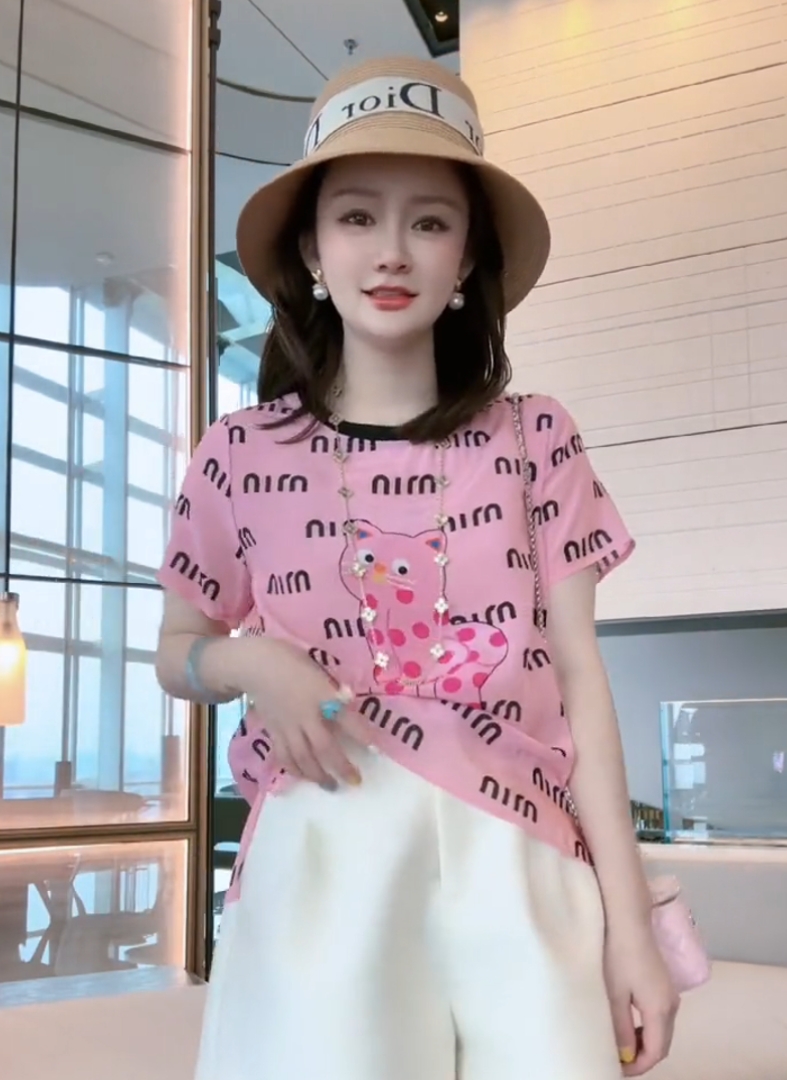 休闲时尚粉色系减龄轻薄圆领字母卡通图案设计T桖2026夏季新款女