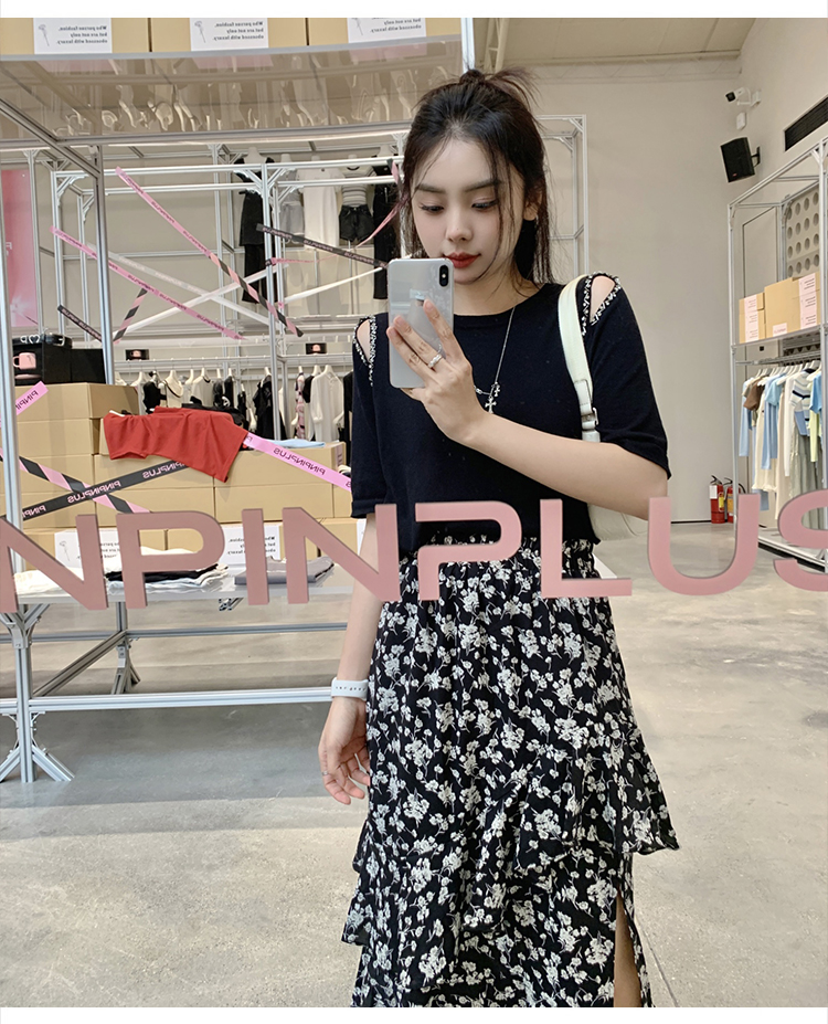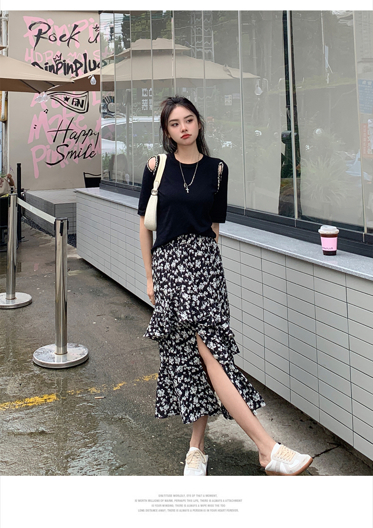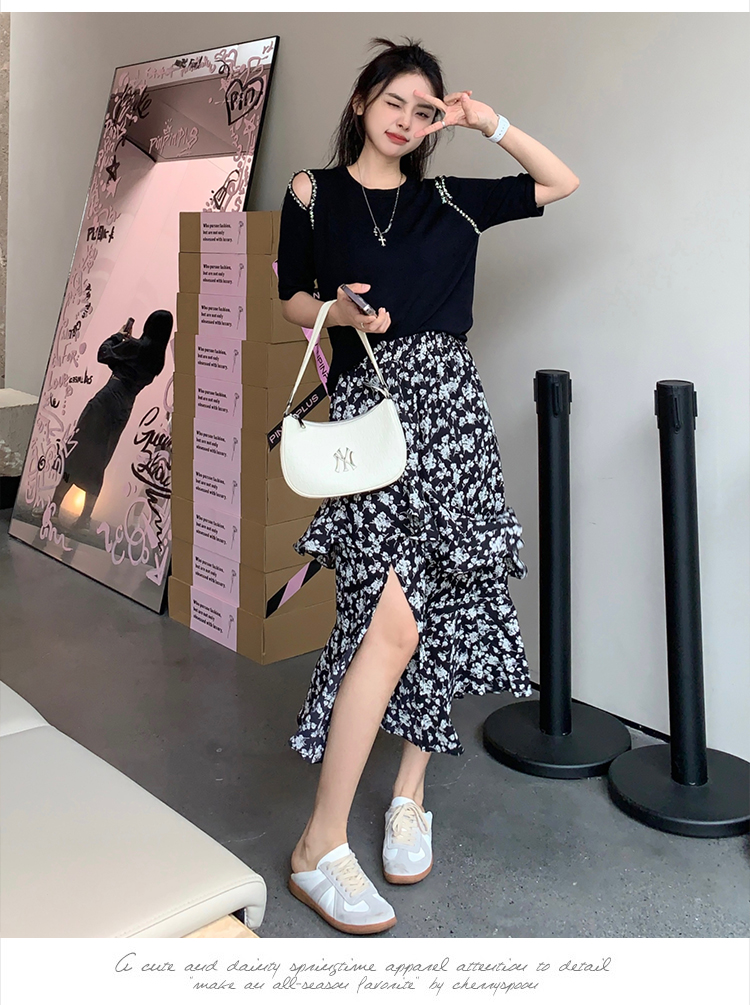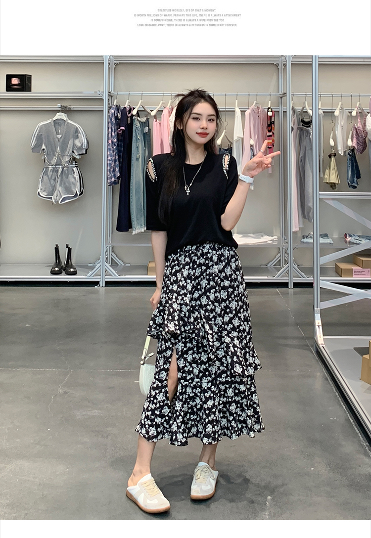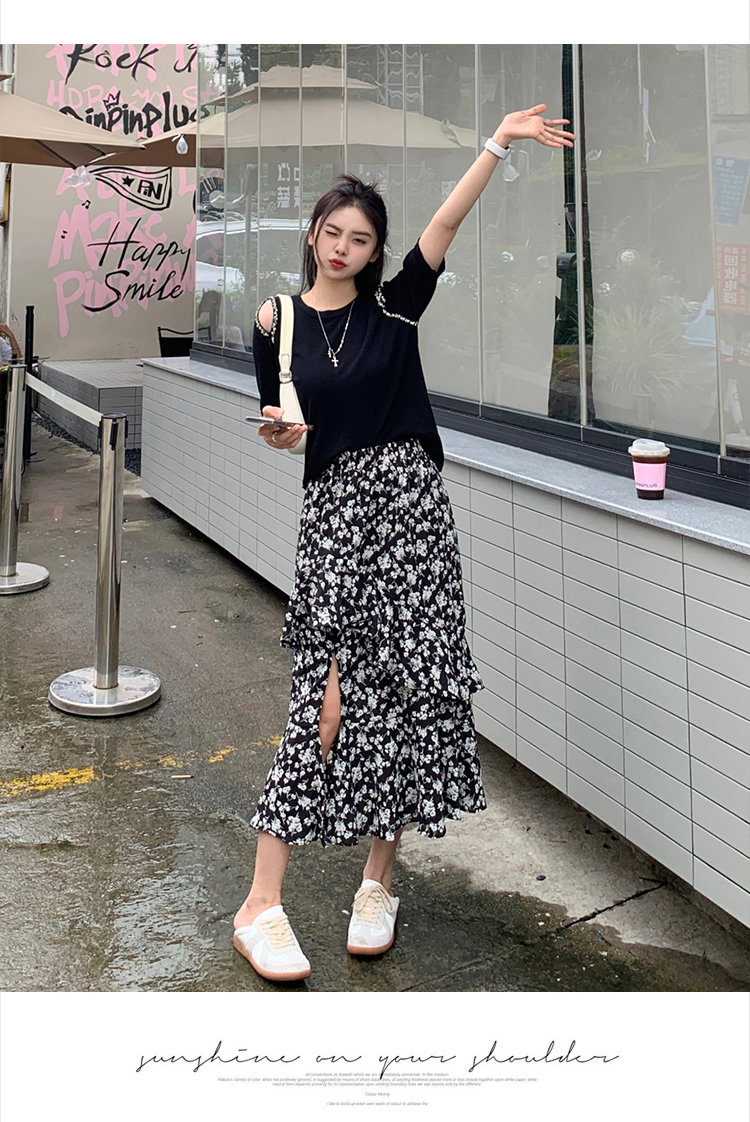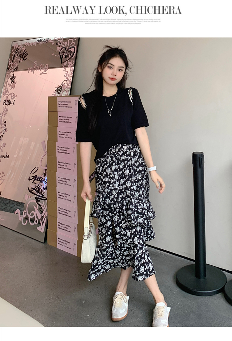 实拍大码女装胖mm春夏露肩钉珠针织T恤荷叶边开叉碎花长裙两件套