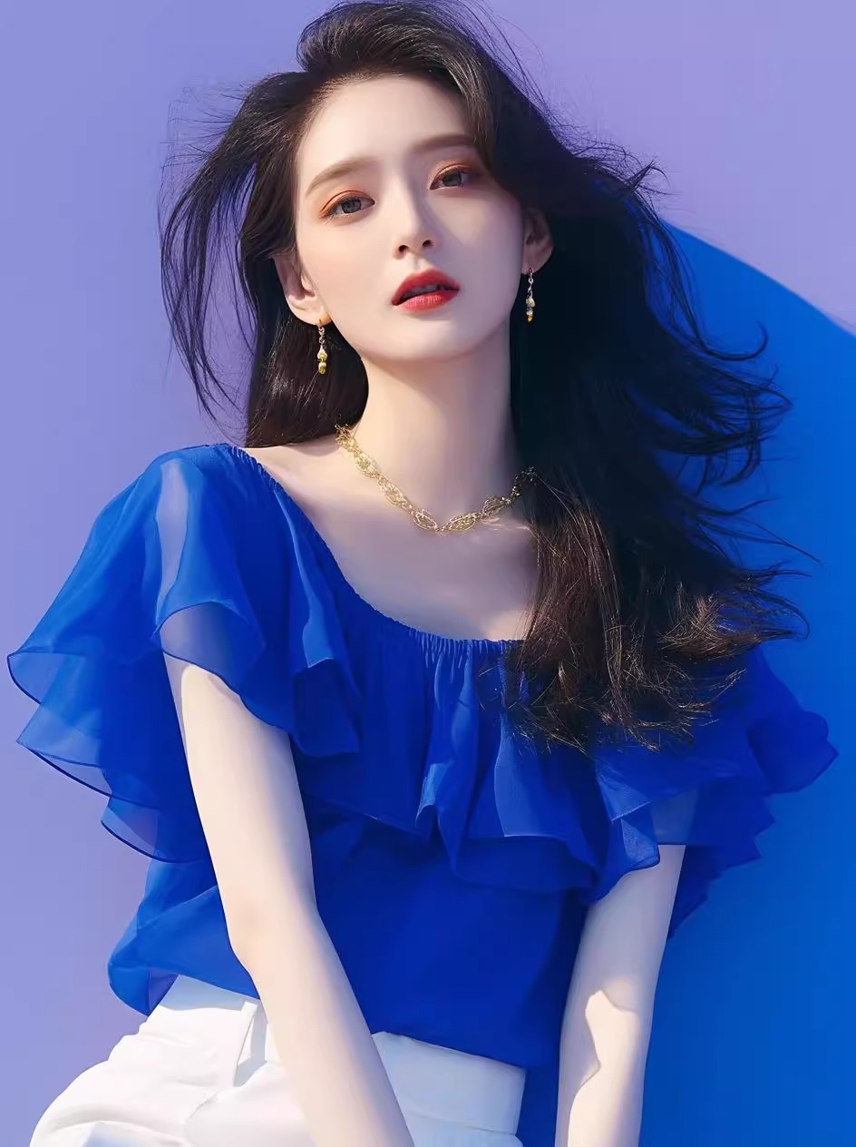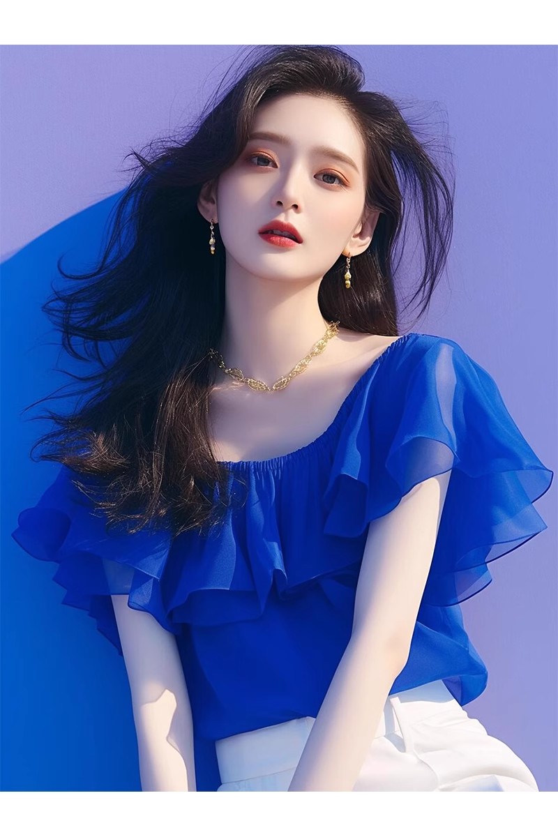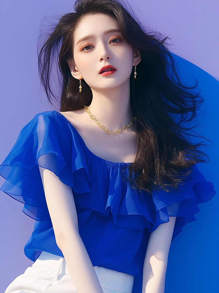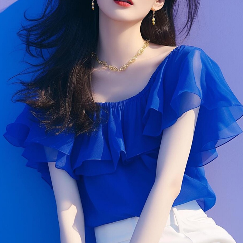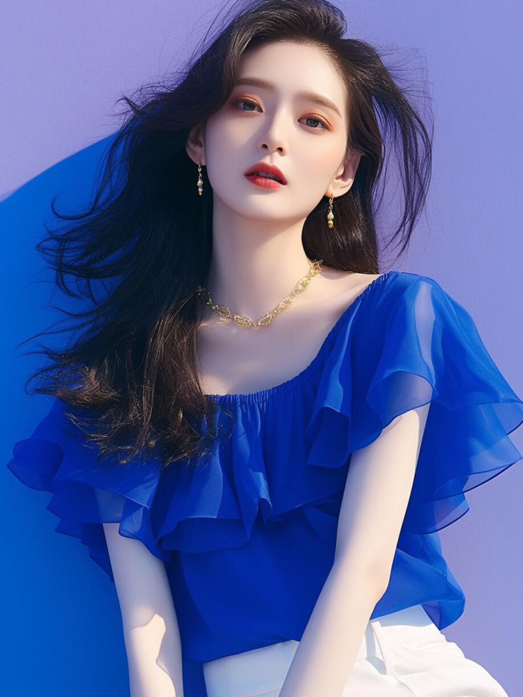 今年流行独特漂亮小衫法式一字肩雪纺上衣女夏轻奢高级感蓝色衬衫