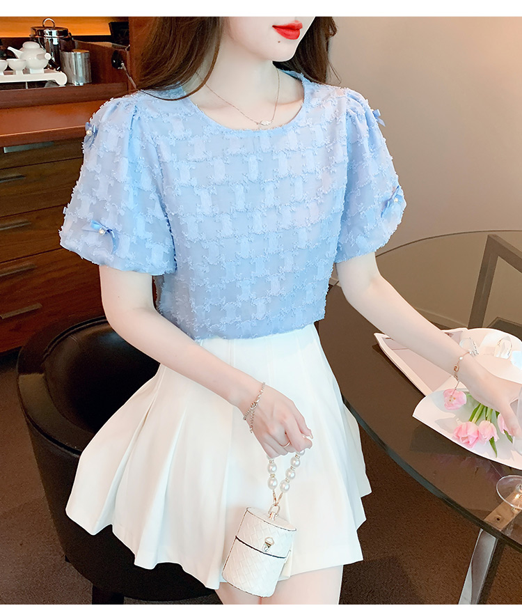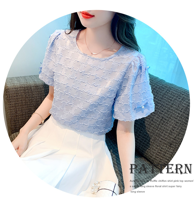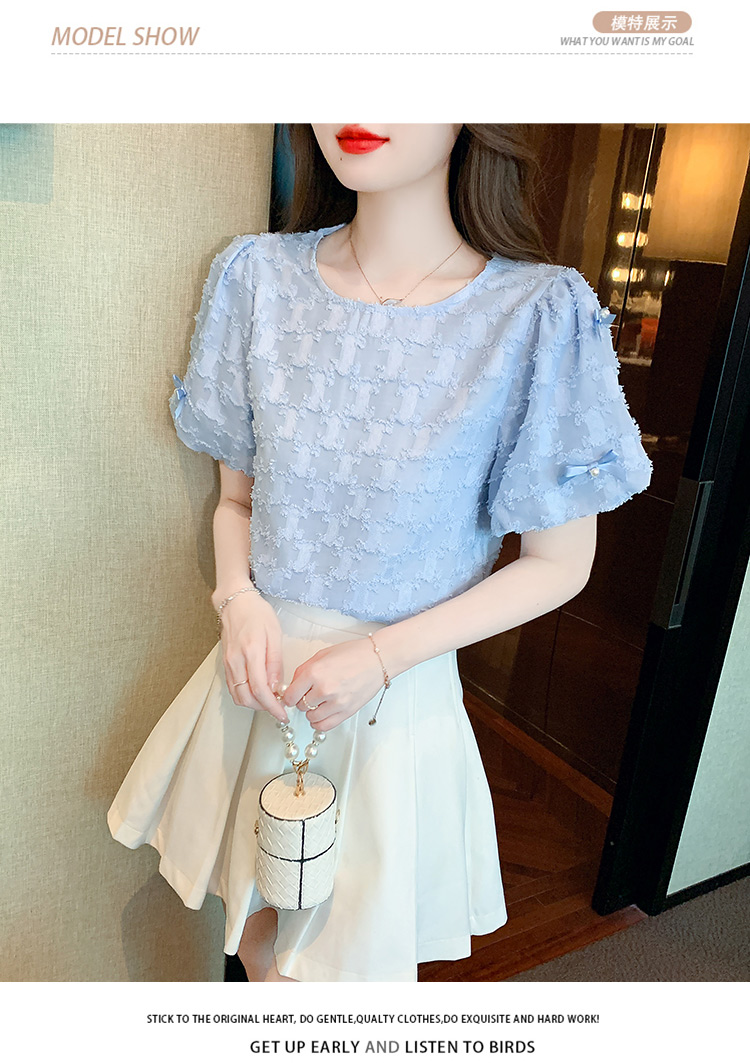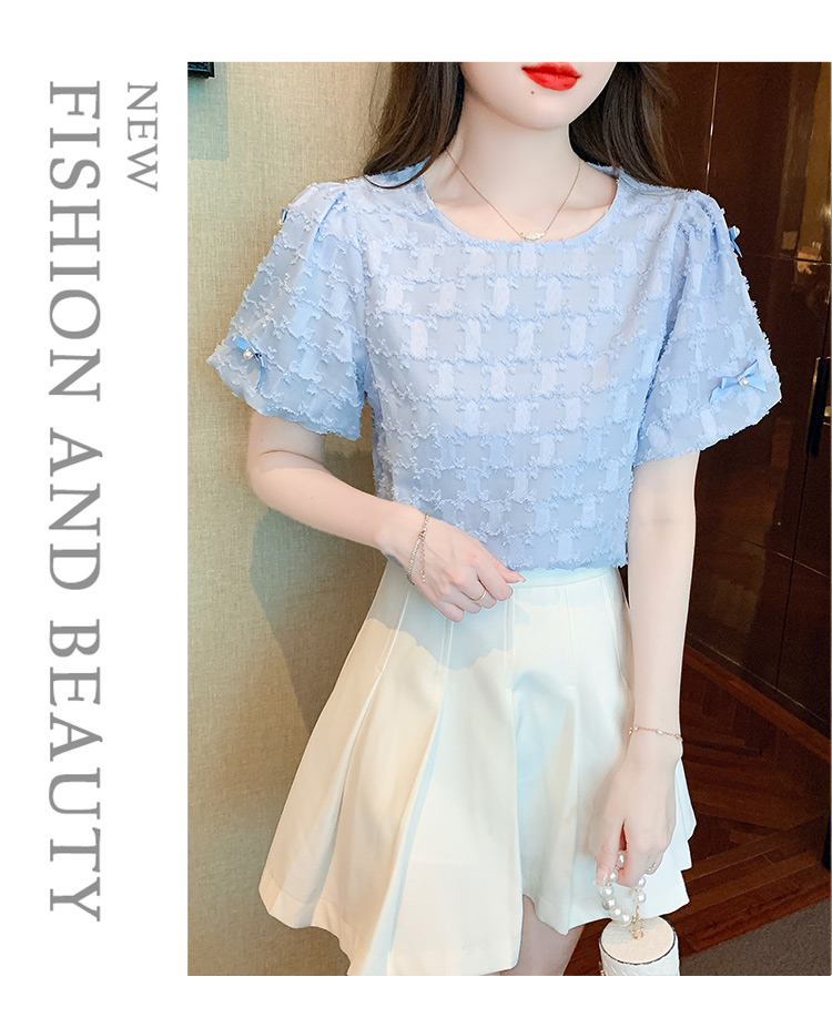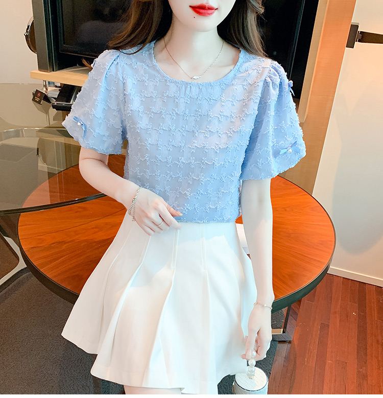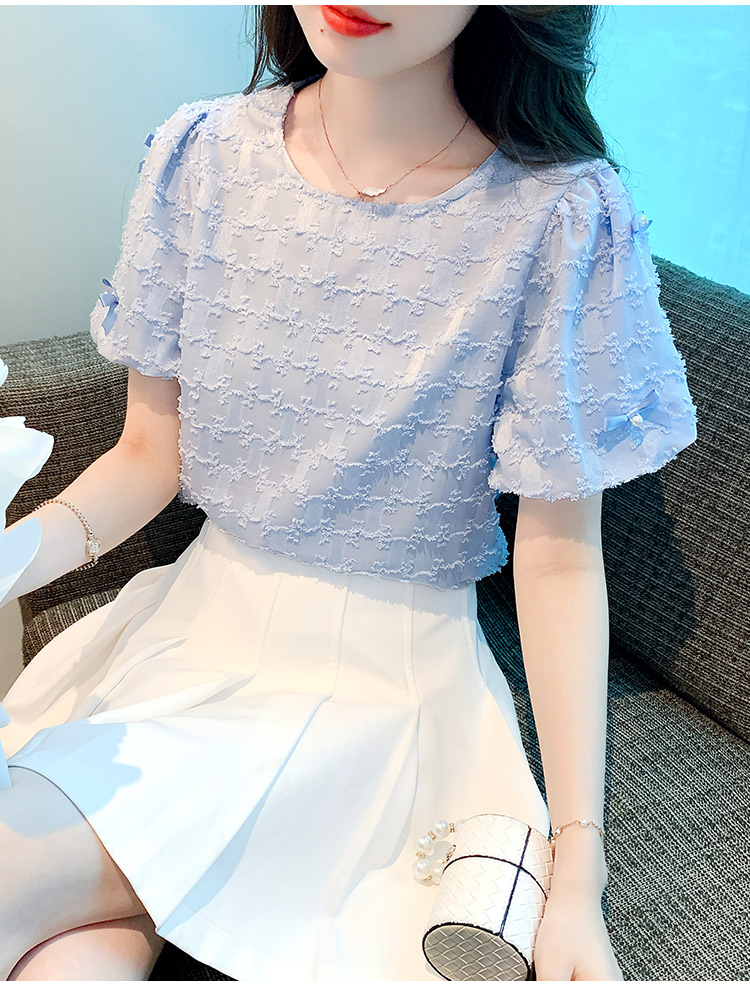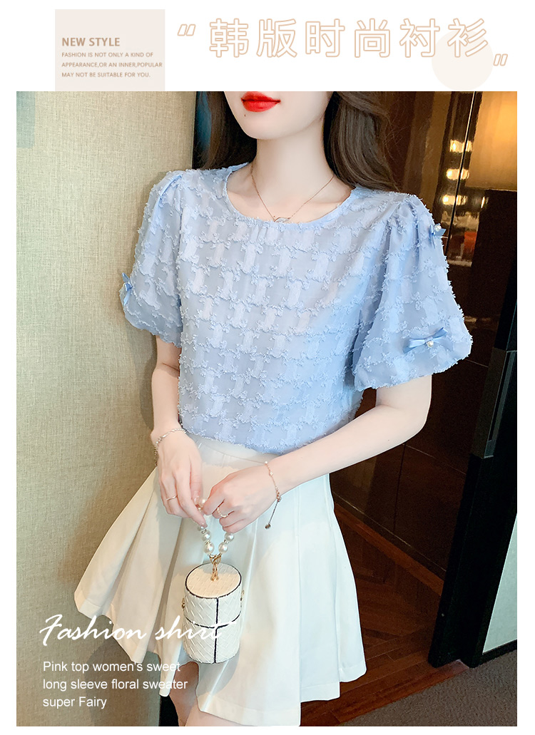 独特别致泡泡袖雪纺上衣女夏法式温柔小香风韩系甜美减龄蓝色衬衫