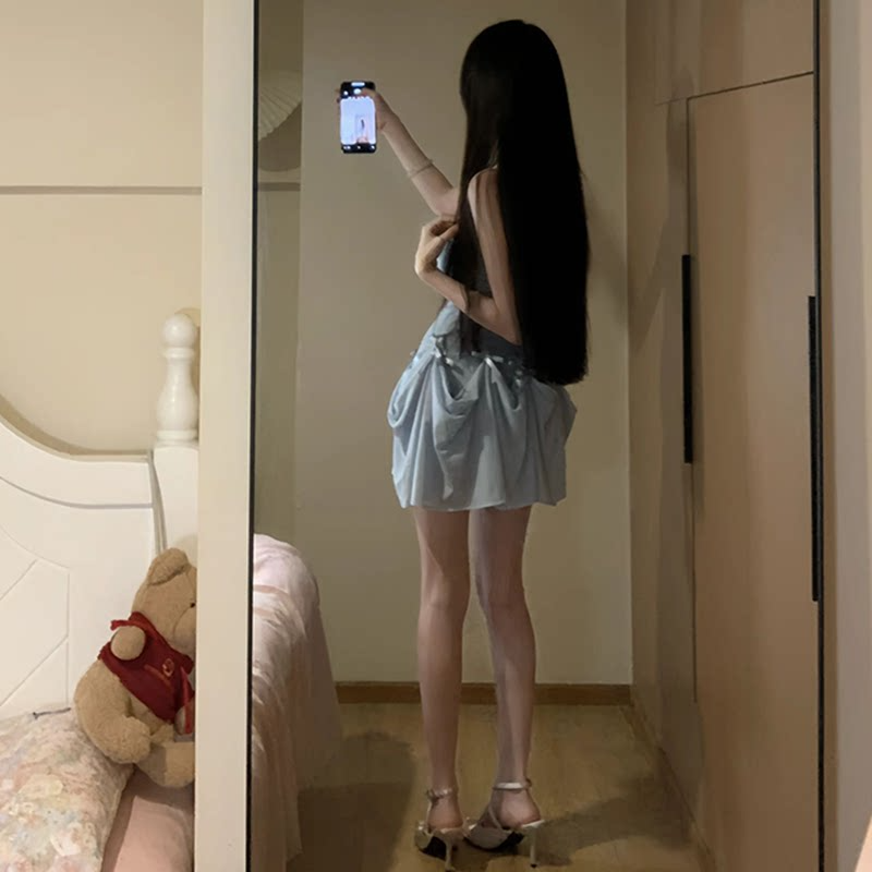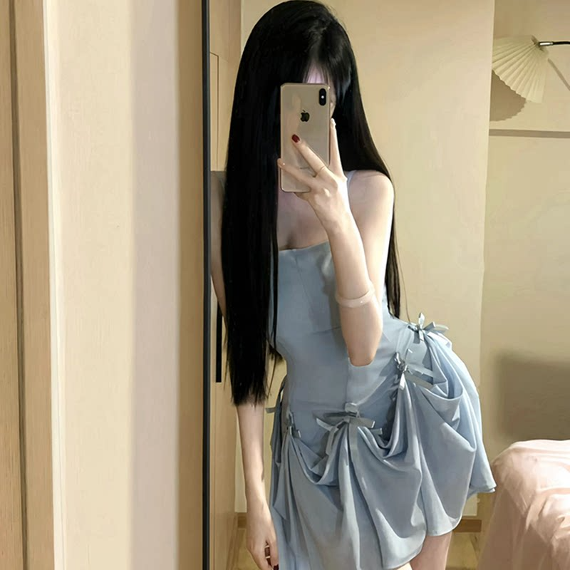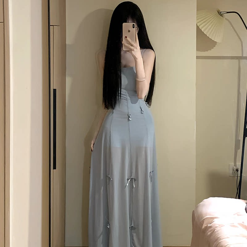 出大货 拉链打揽一温柔风蓝色吊带收腰长裙三穿蝴蝶结裙子