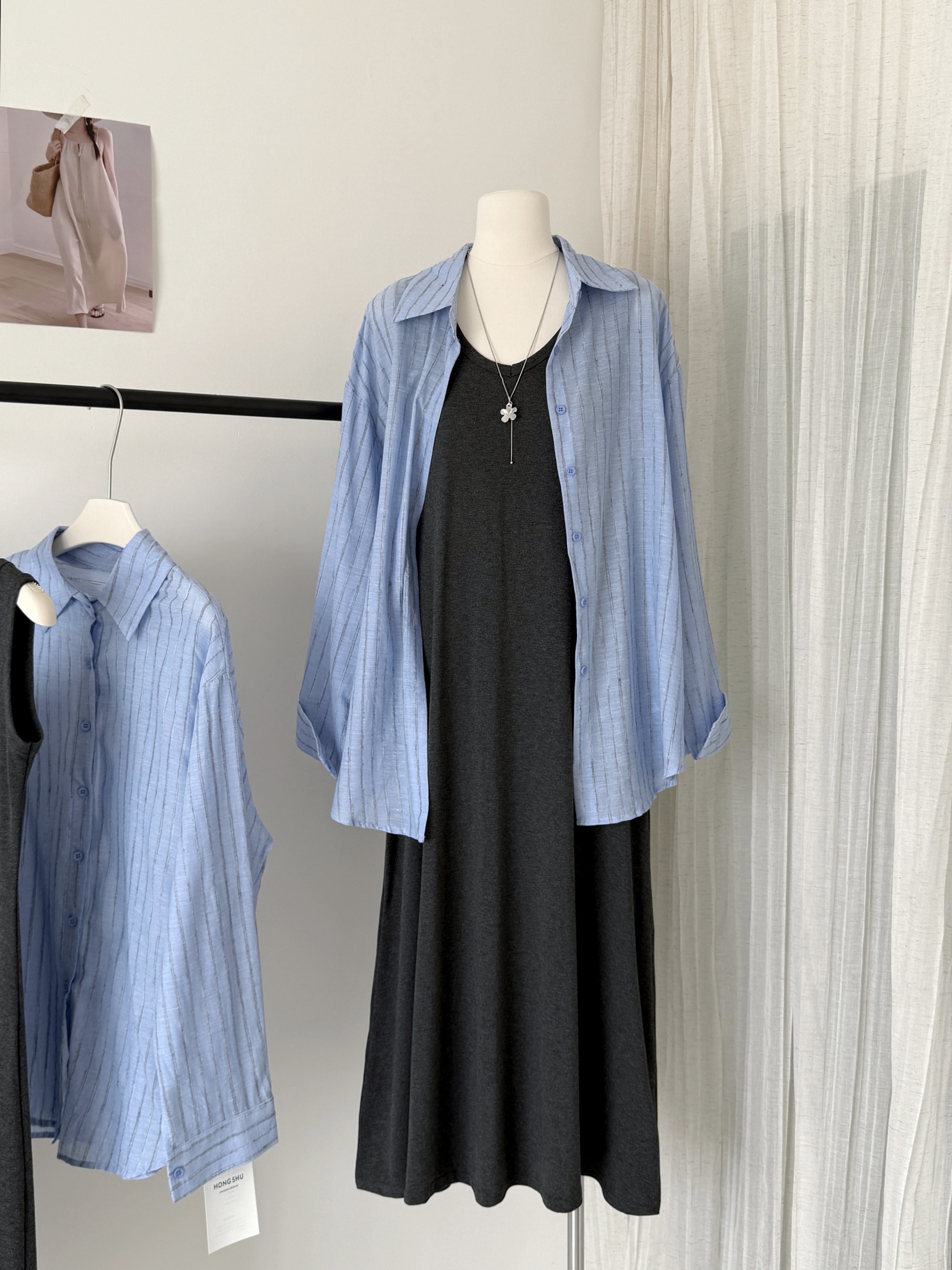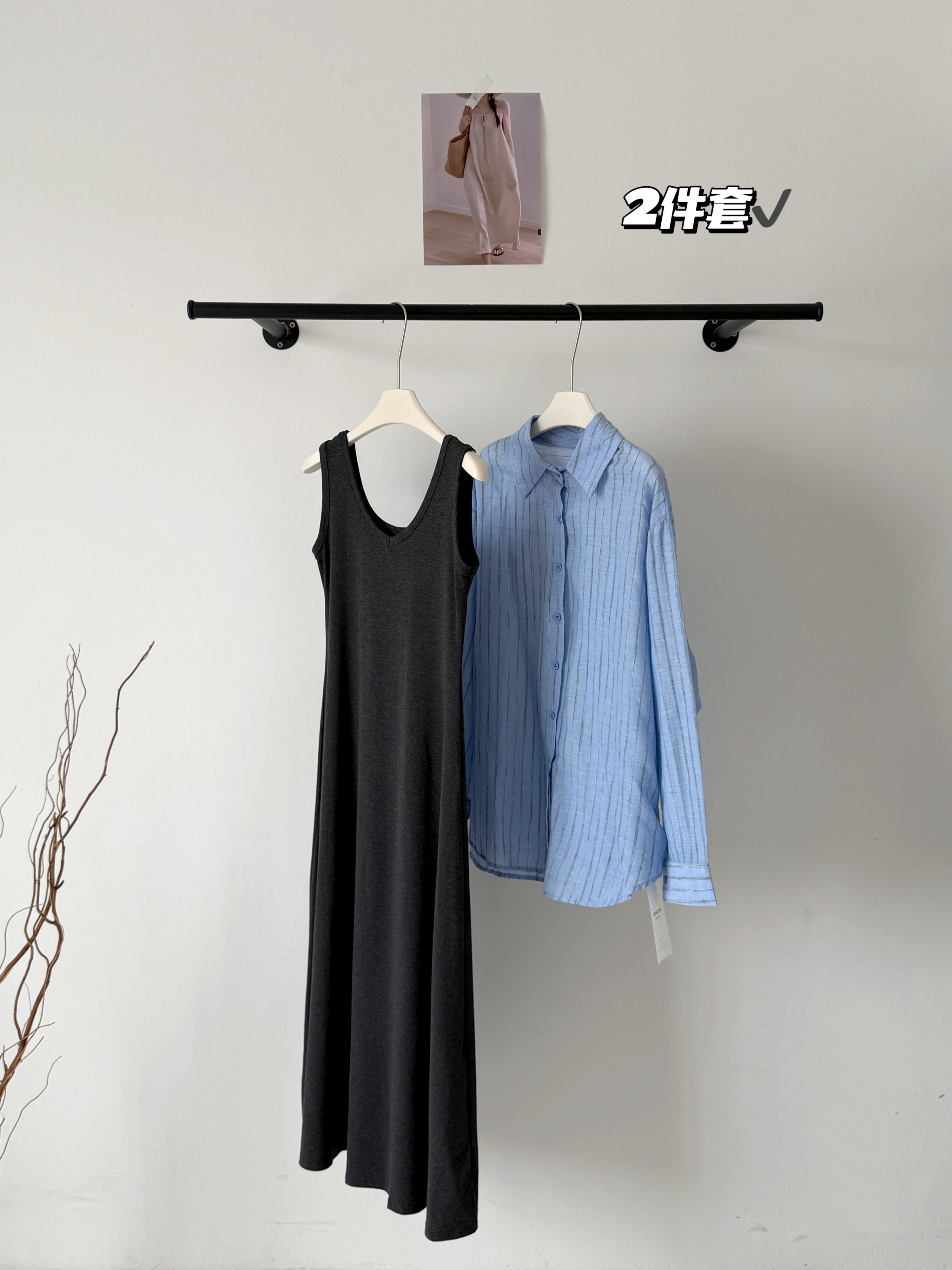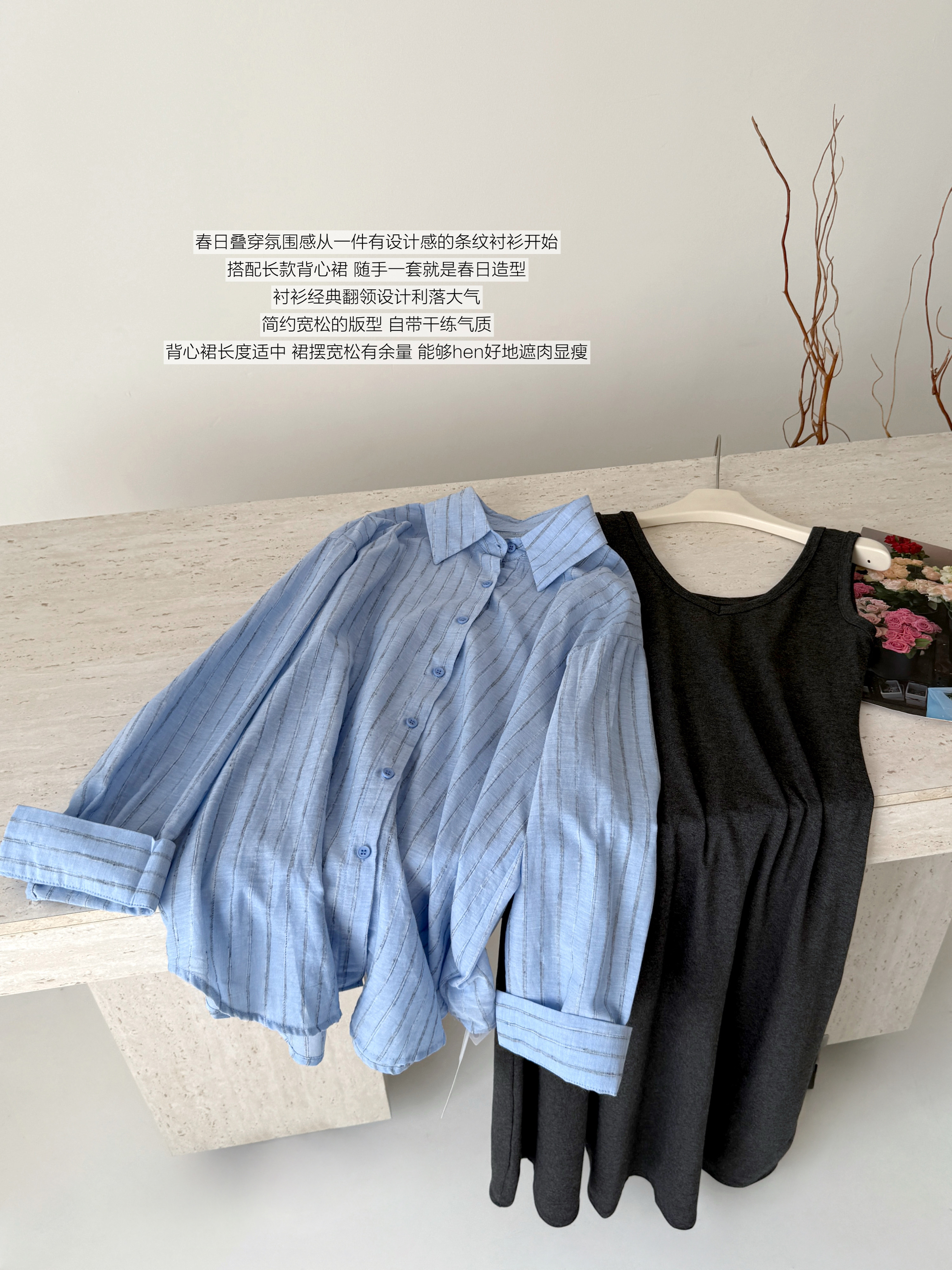 2026春夏新款条纹开叉慵懒风衬衫+修身显瘦长款背心连衣裙套装女