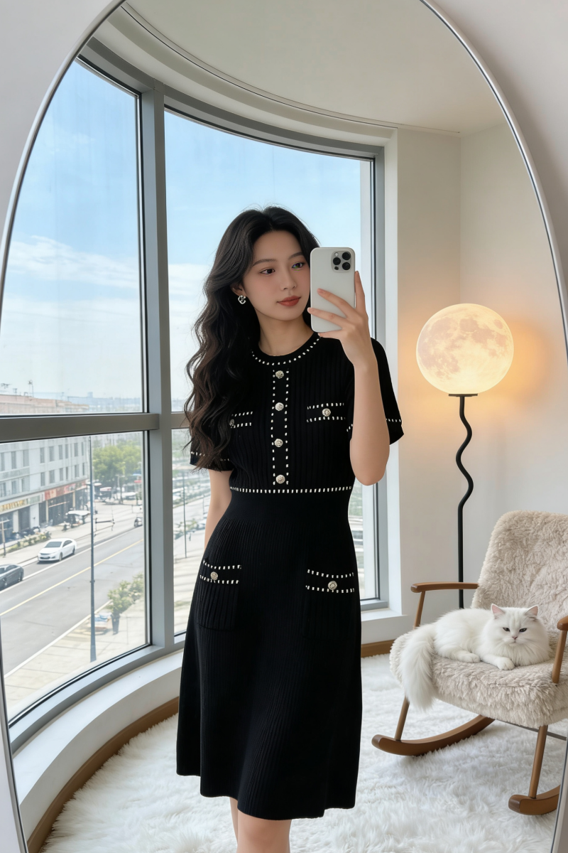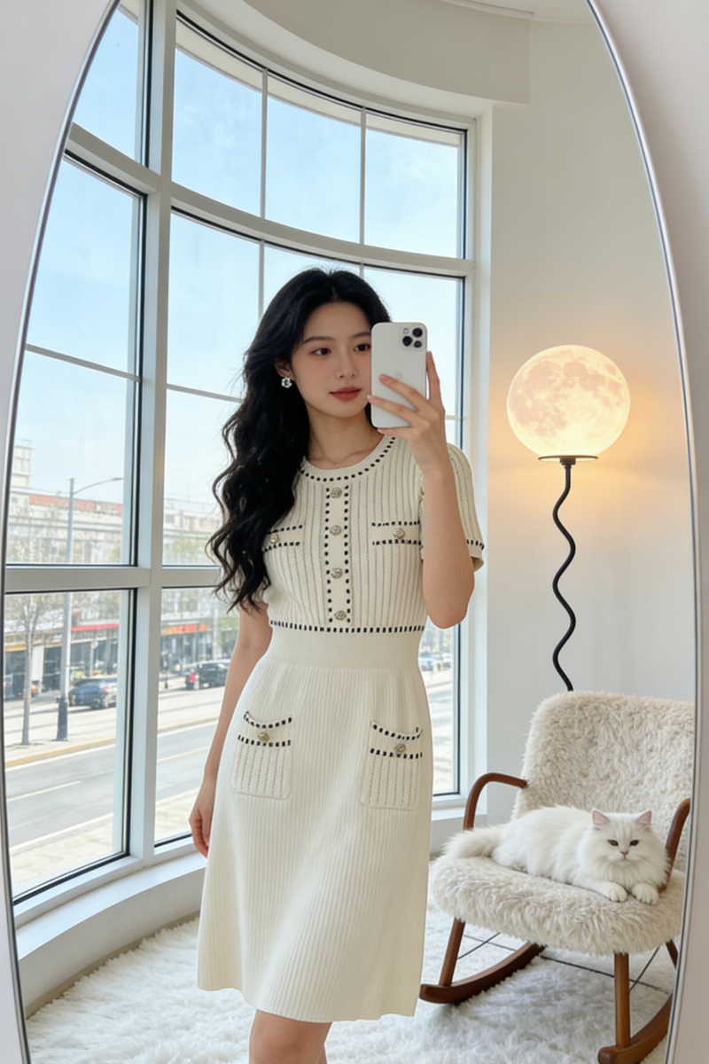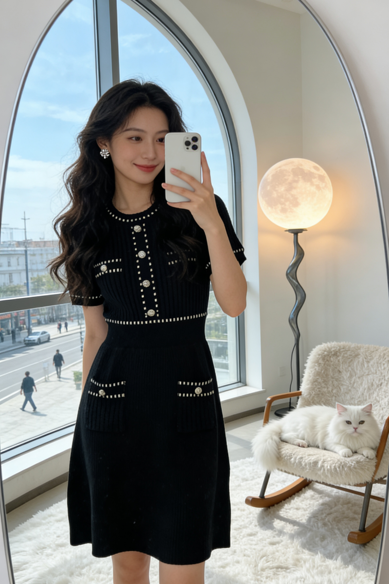 法式名媛小香风金属扣收腰圆领短袖针织连衣裙女夏季显瘦气质裙女