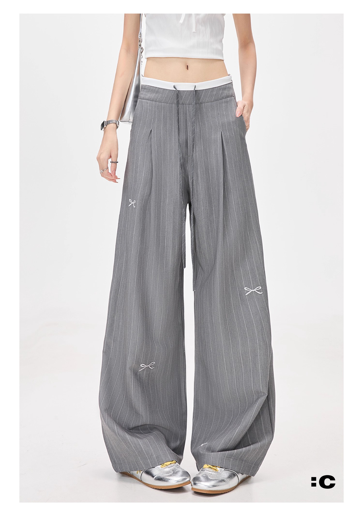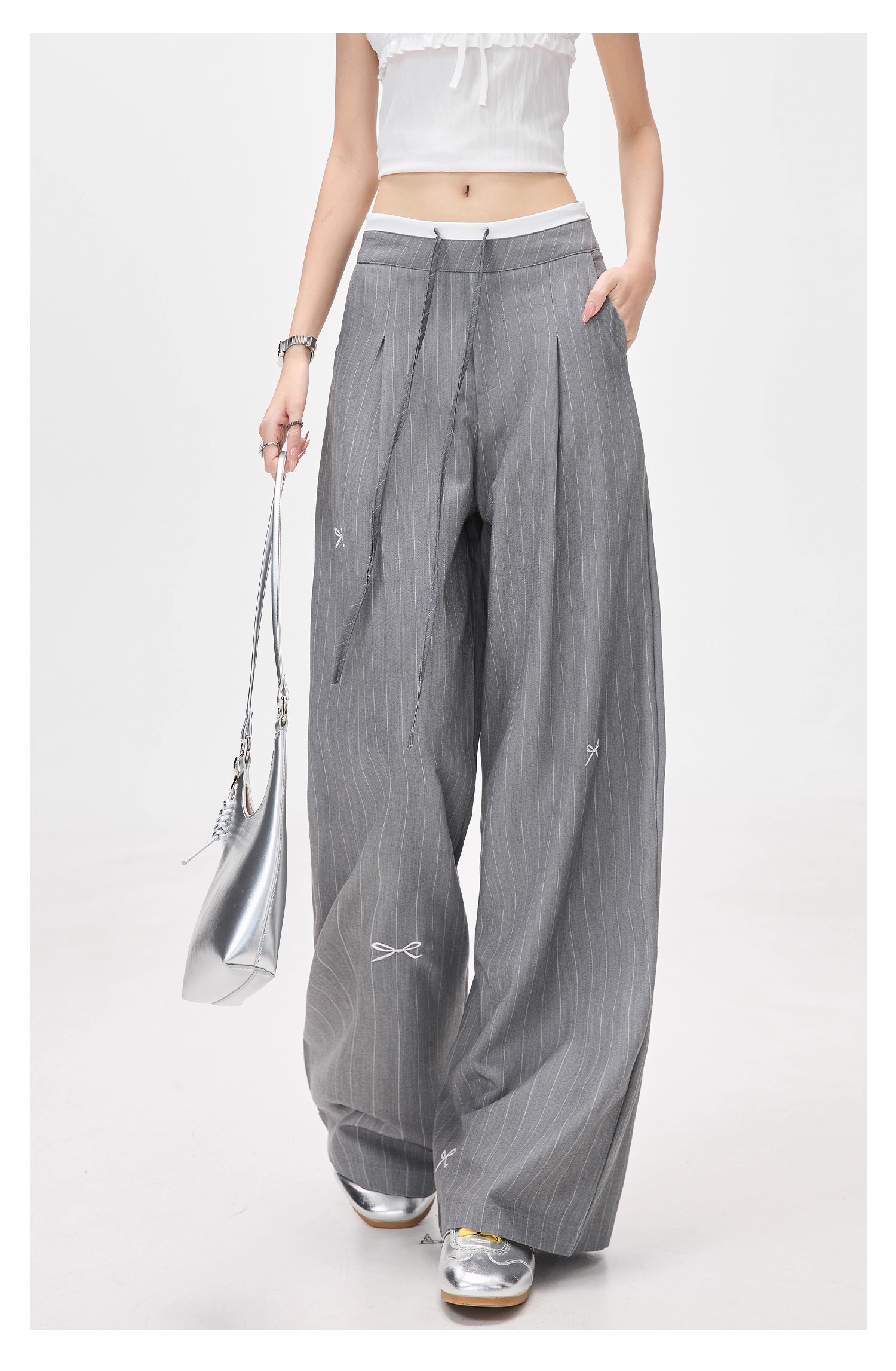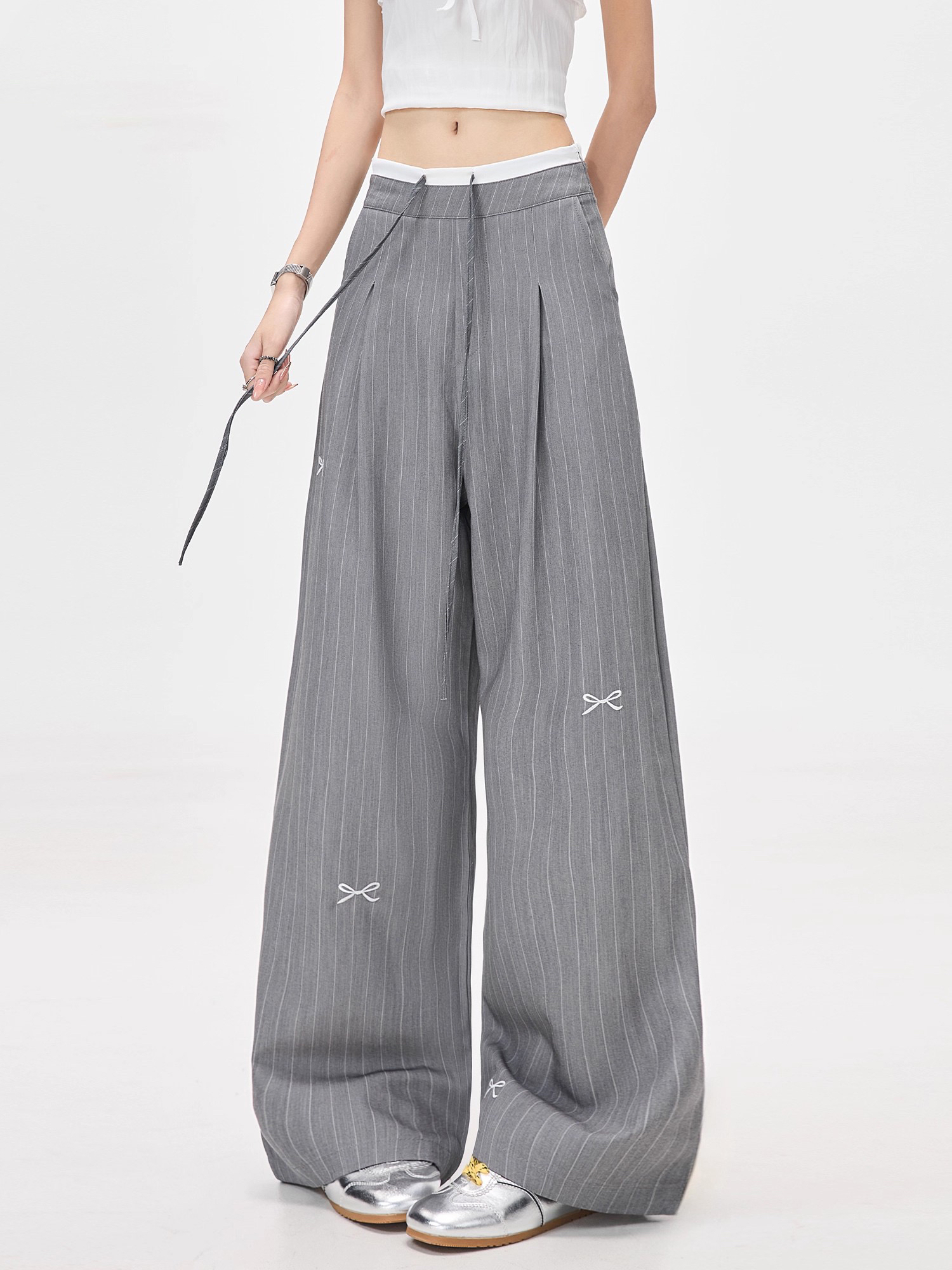 美式灰色条纹蝴蝶结西装裤高腰宽松阔腿休闲裤女