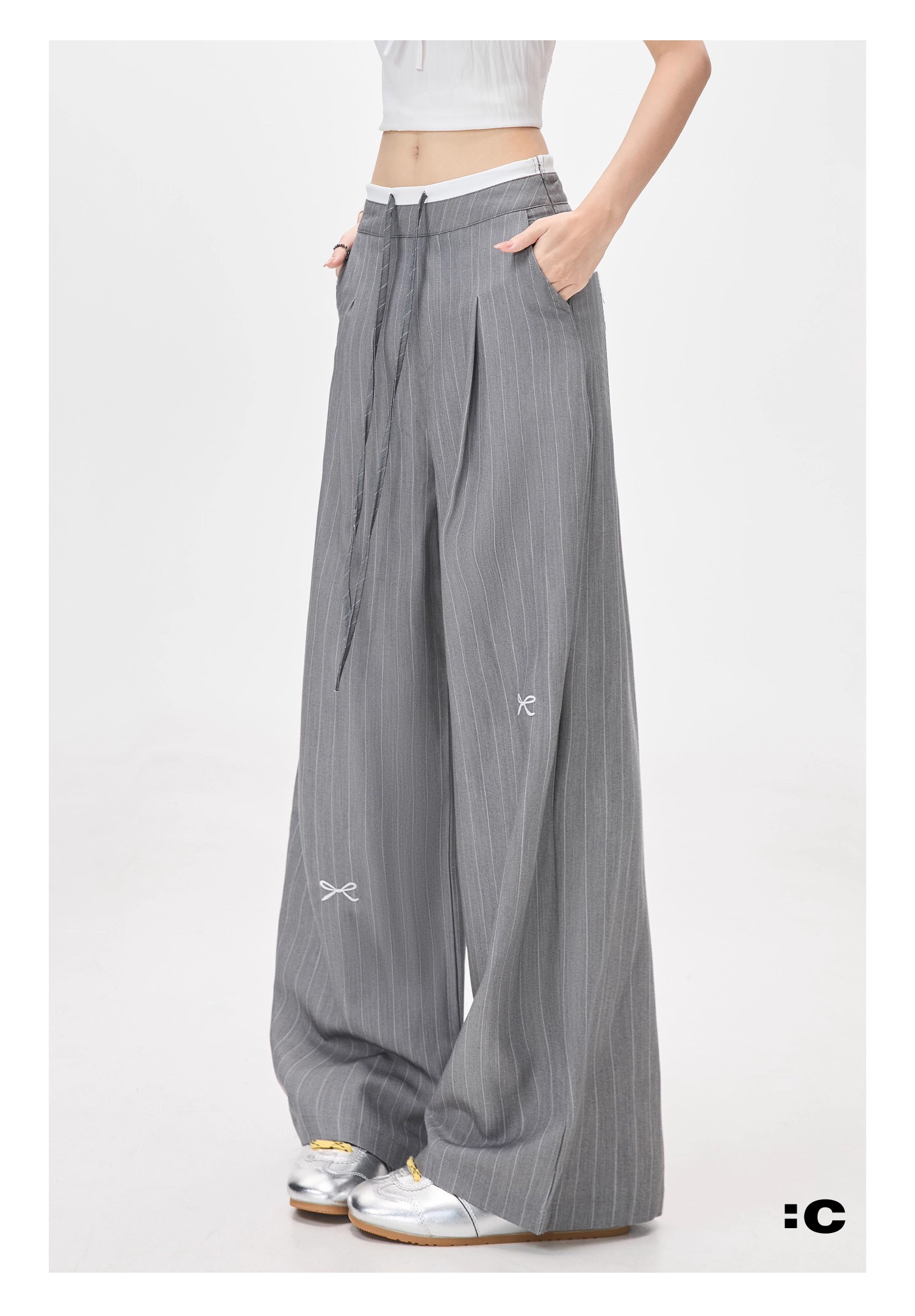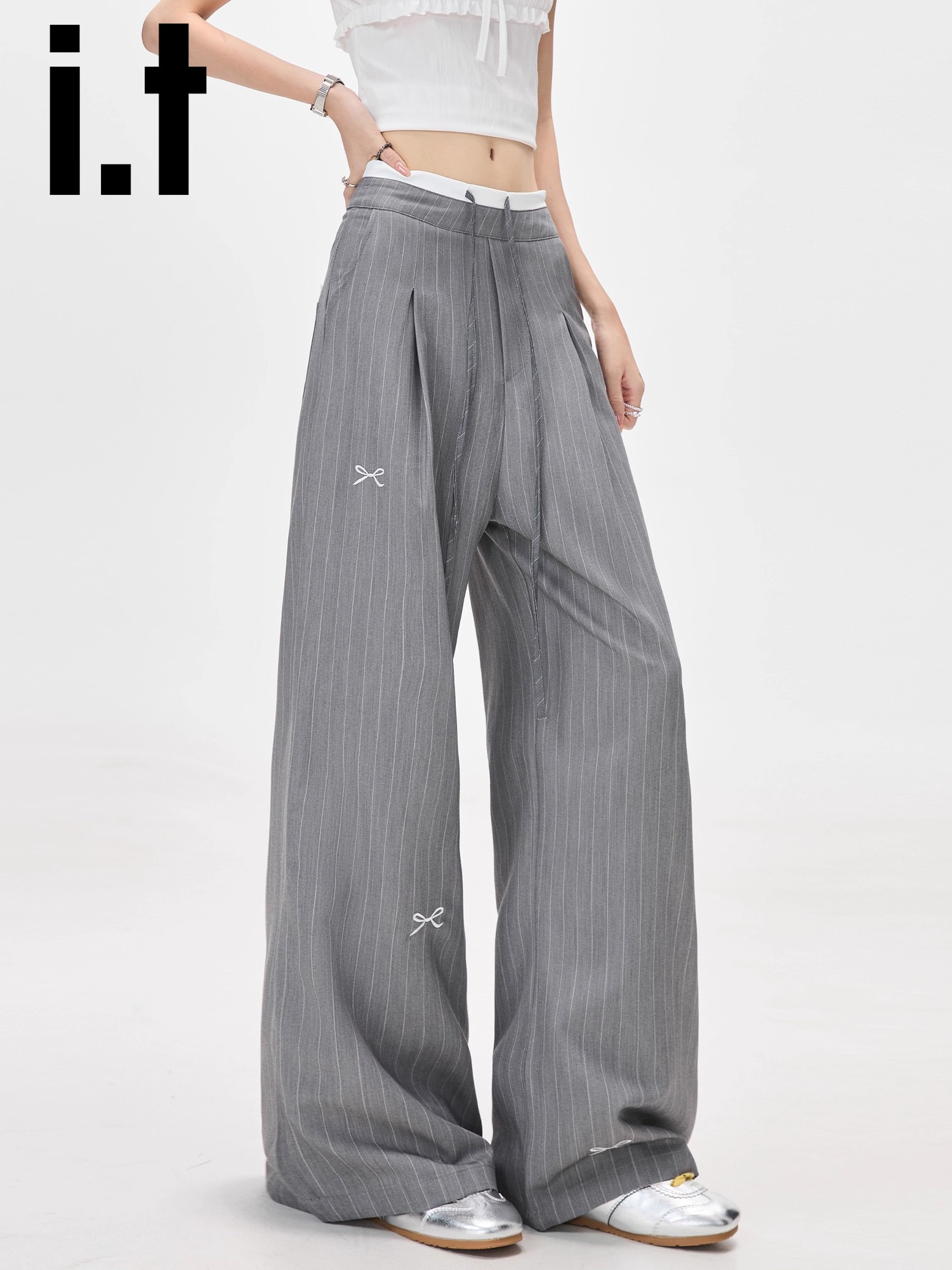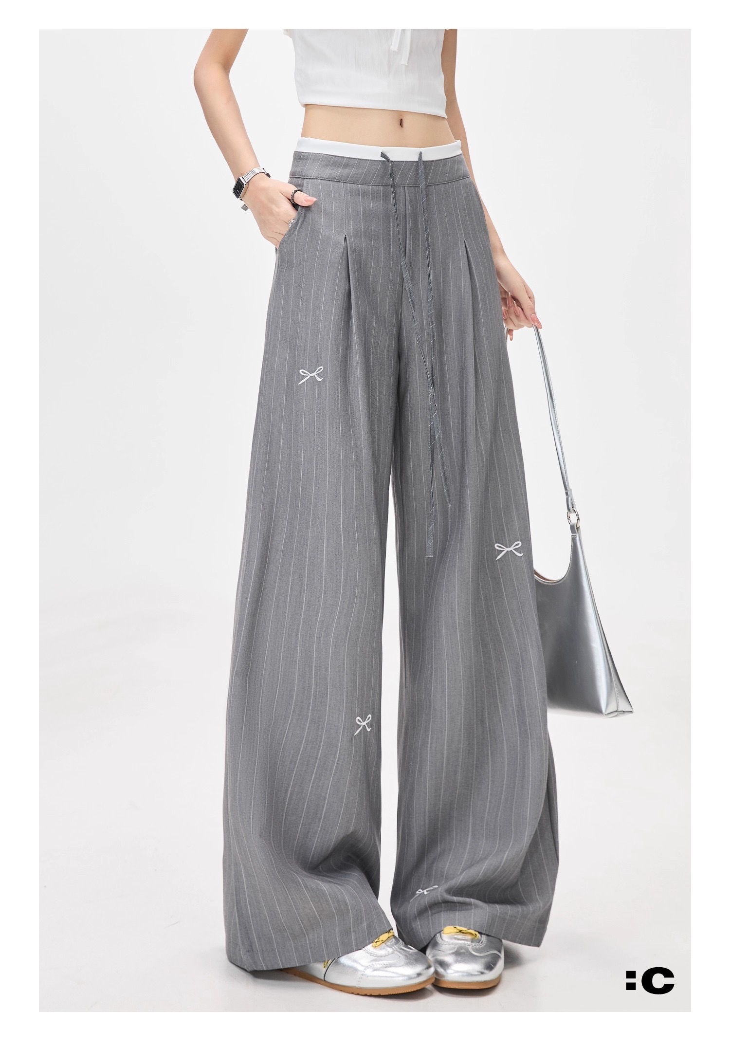 美式灰色条纹蝴蝶结西装裤高腰宽松阔腿休闲裤女