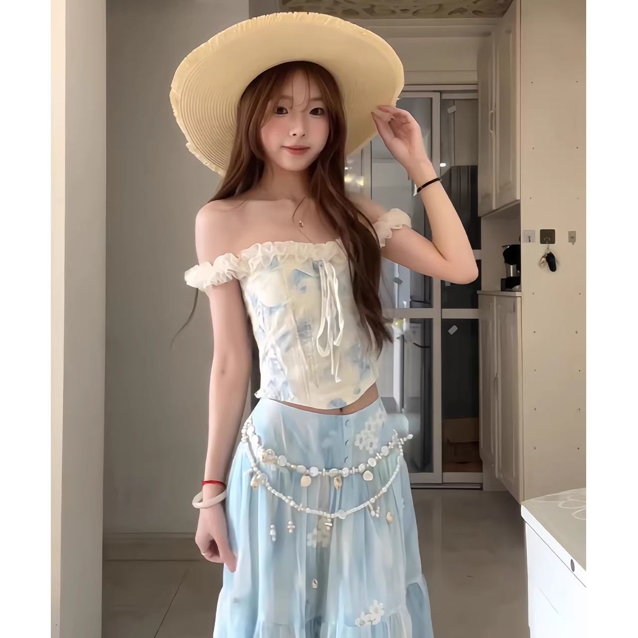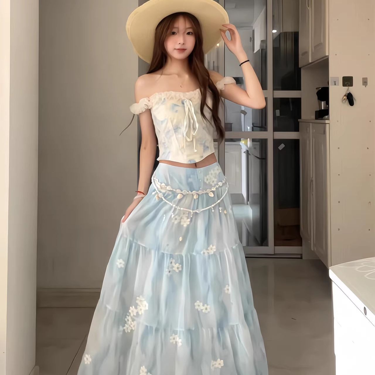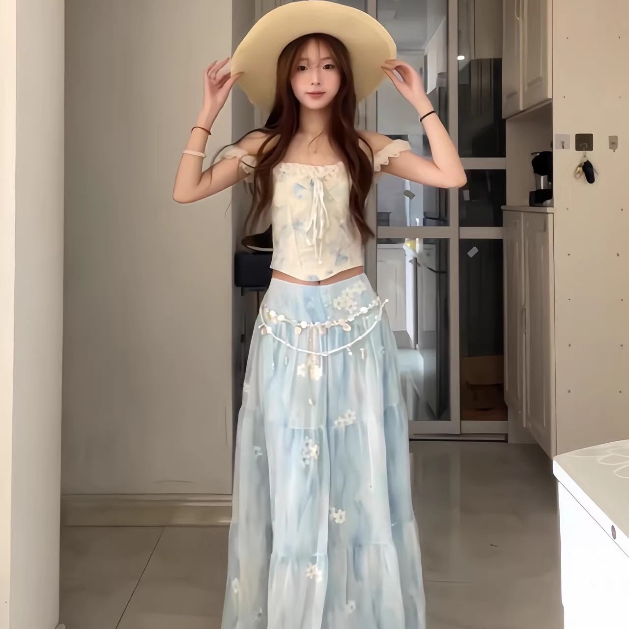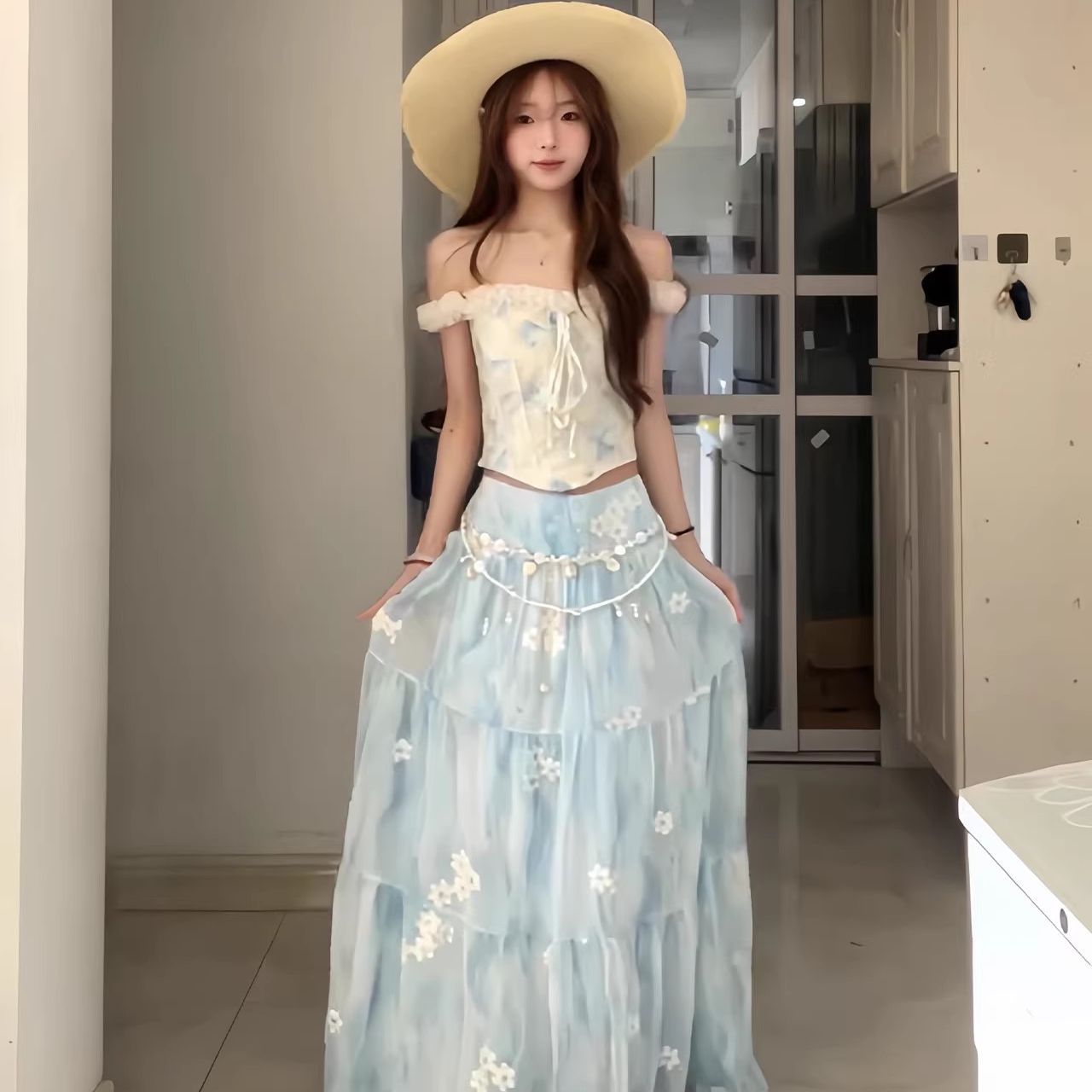 碎花蕾丝花边吊带背心蓝色花朵短款上衣外穿度假穿搭套装
