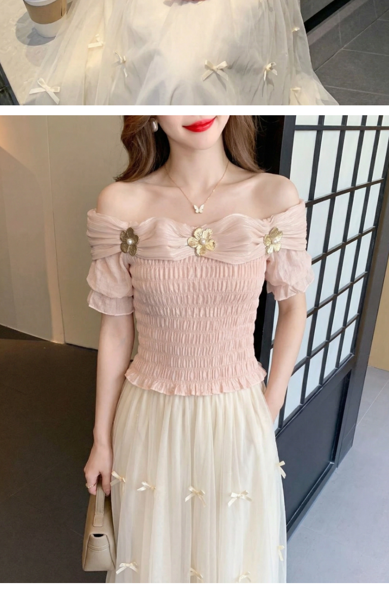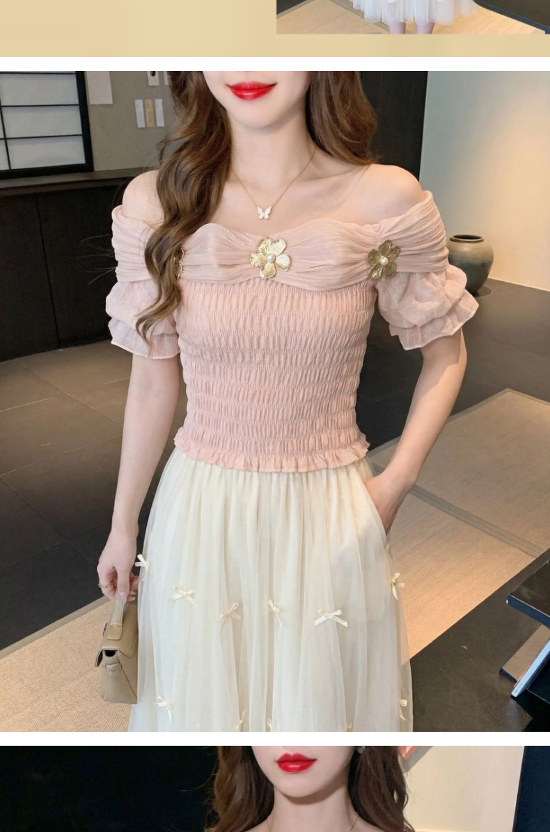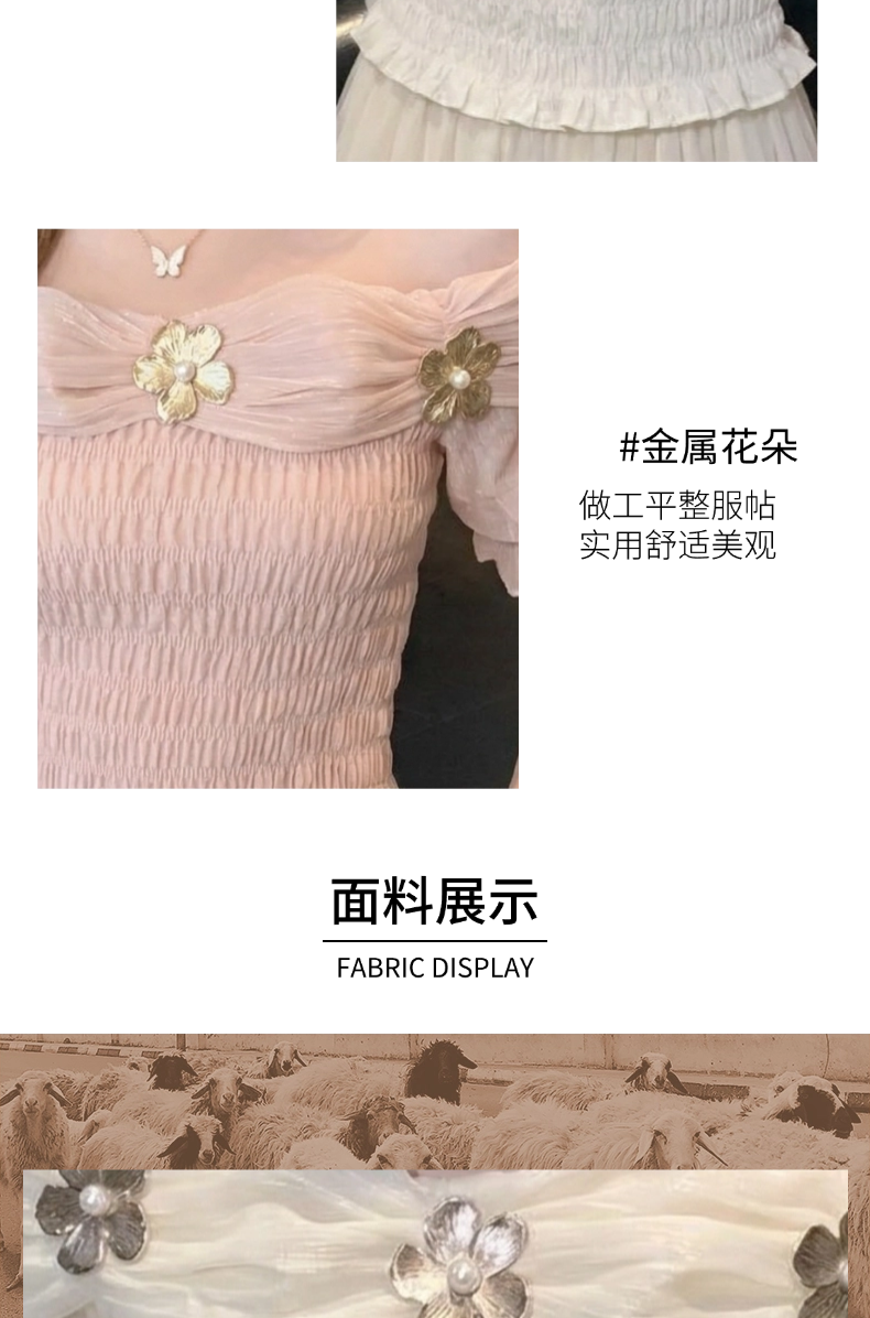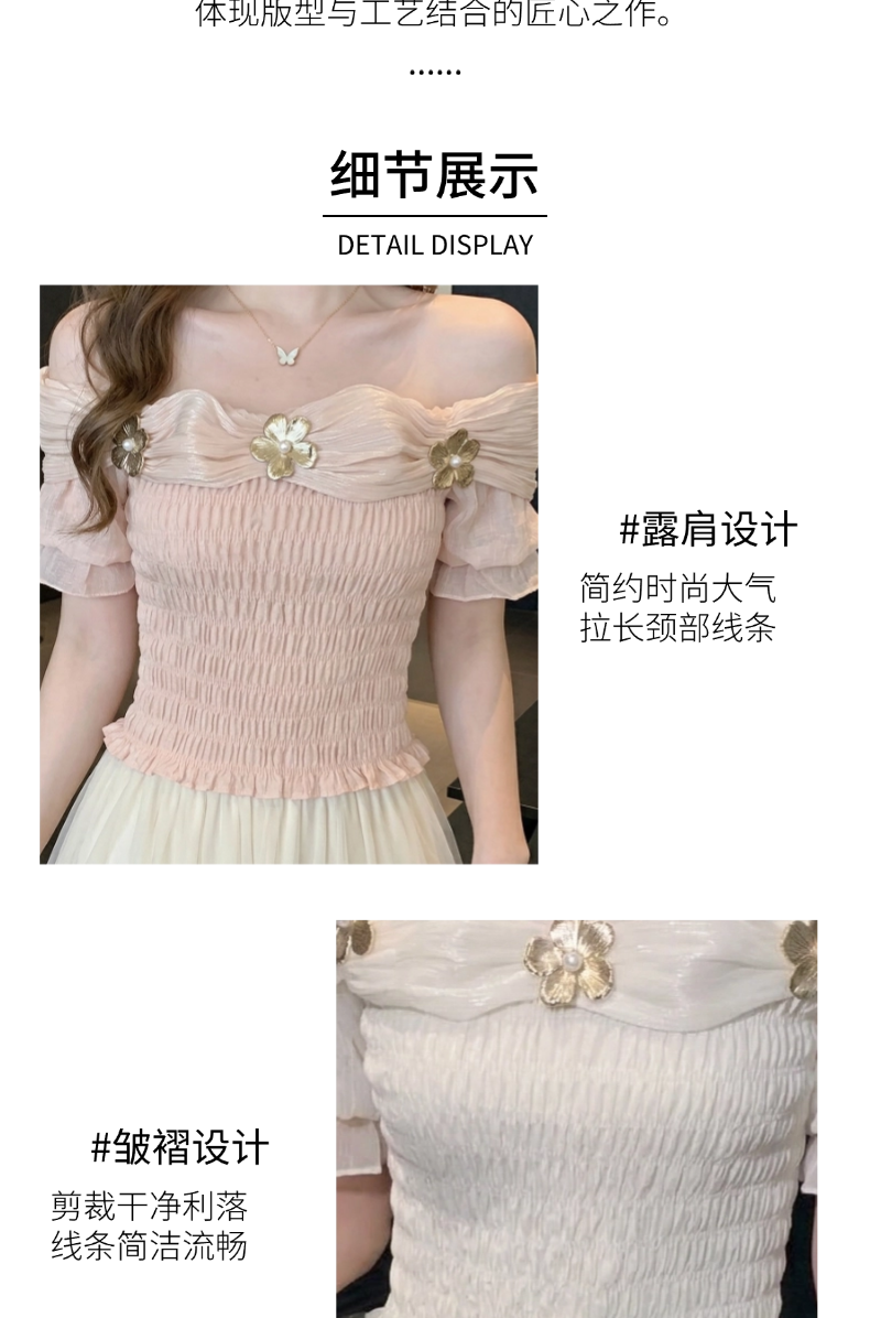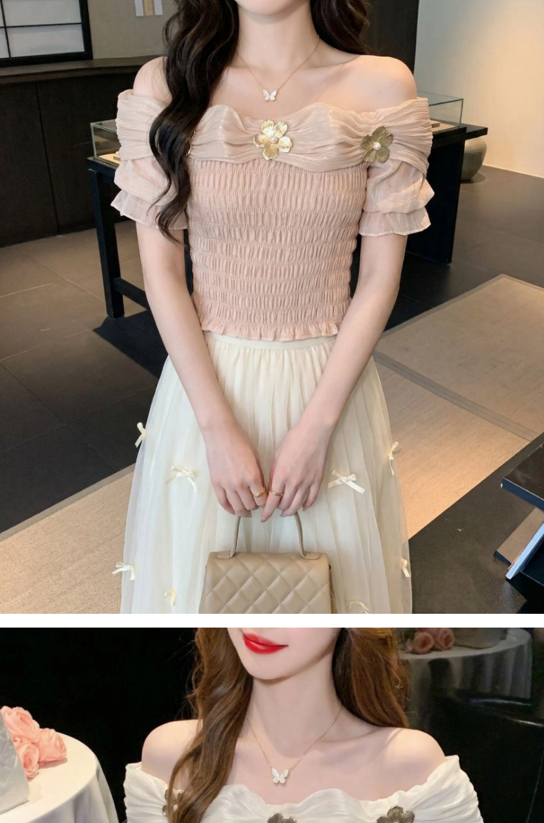 2026实拍夏季一字肩金属花朵雪纺衫女法式性感收腰显瘦别致上衣潮