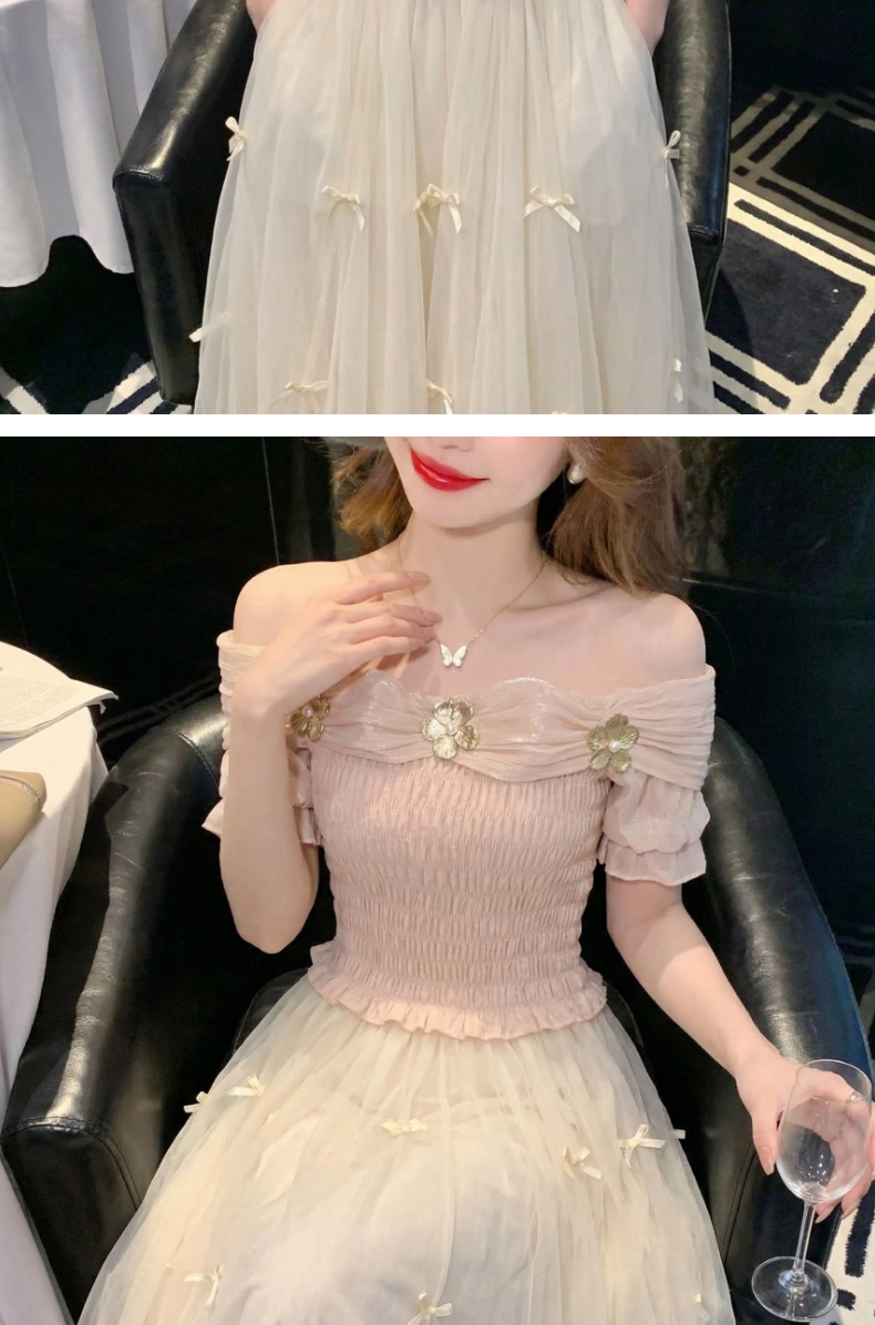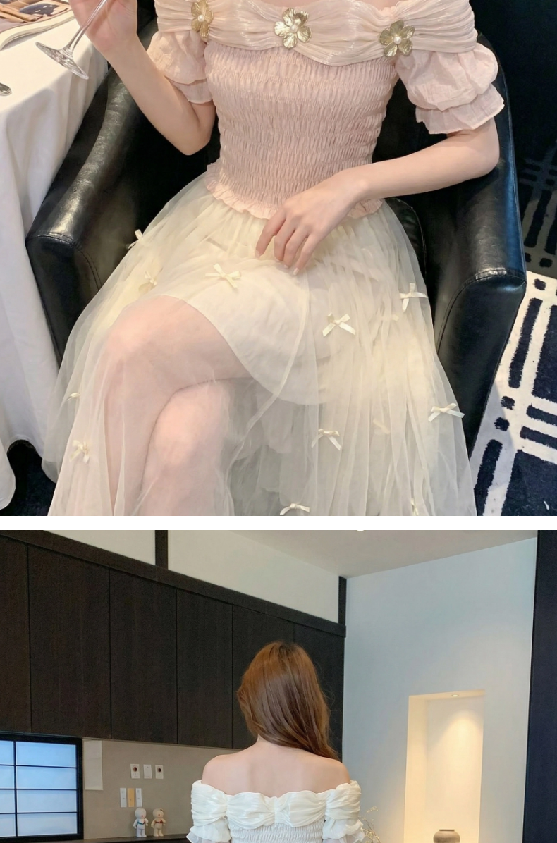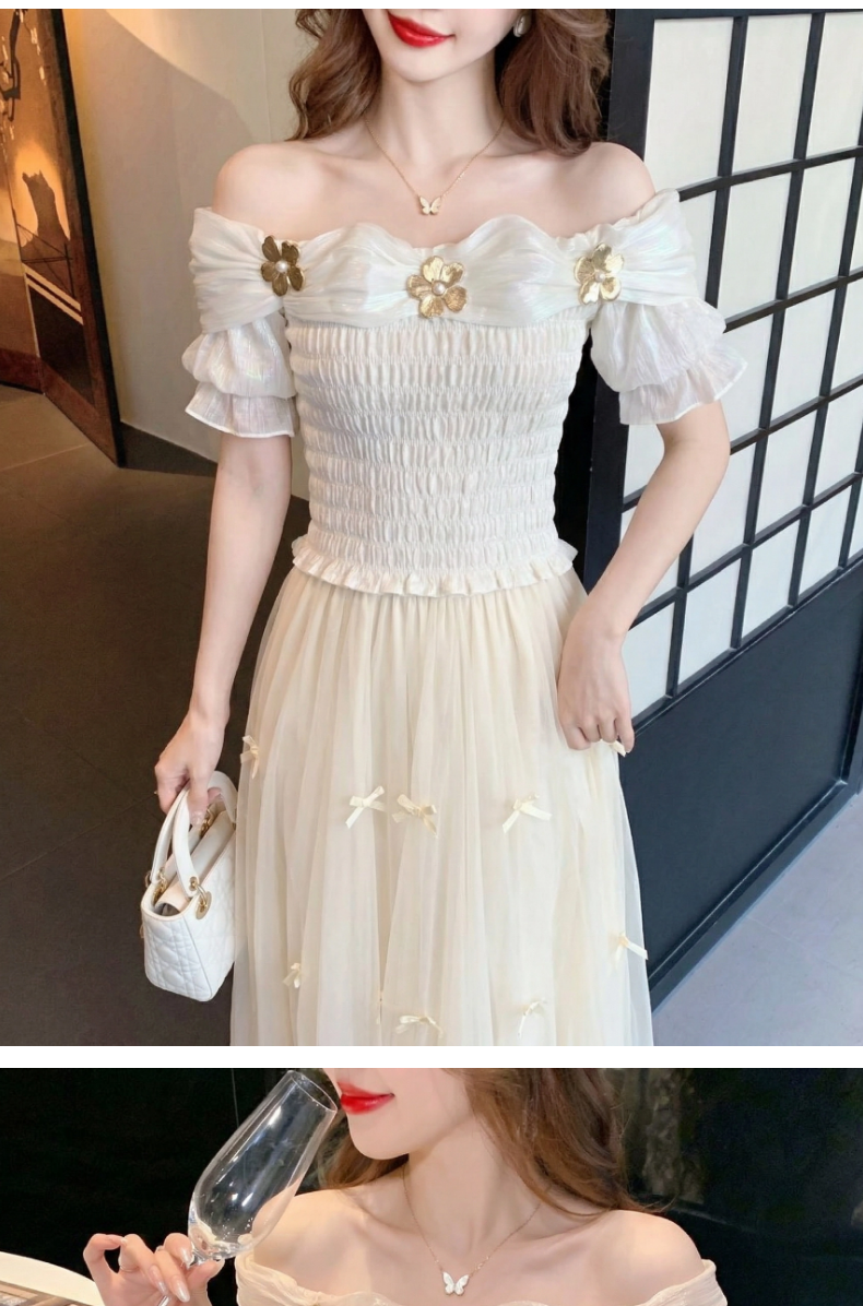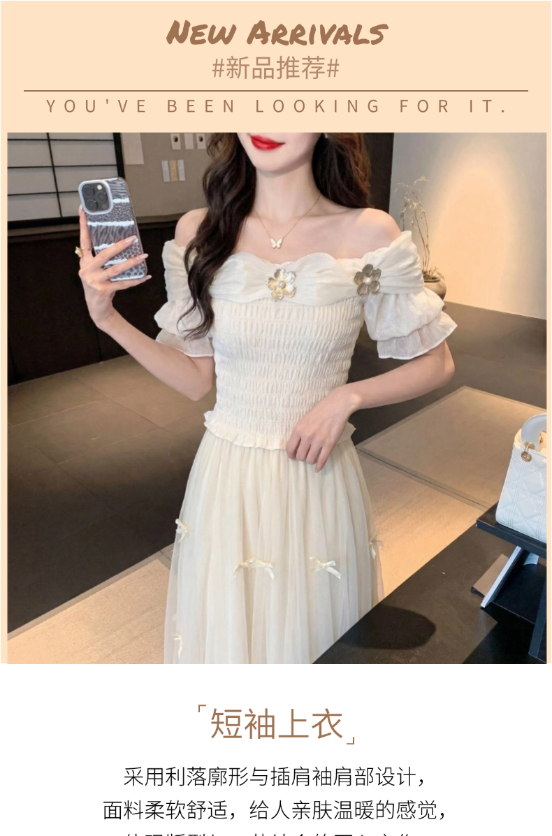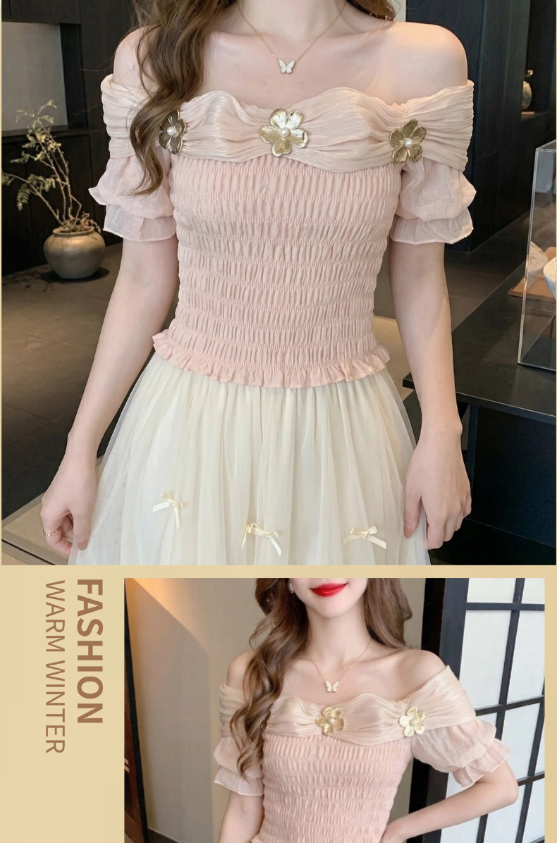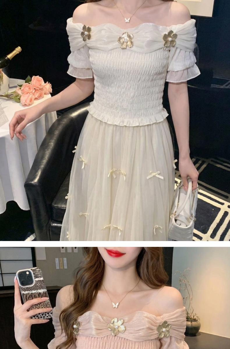 2026实拍夏季一字肩金属花朵雪纺衫女法式性感收腰显瘦别致上衣潮