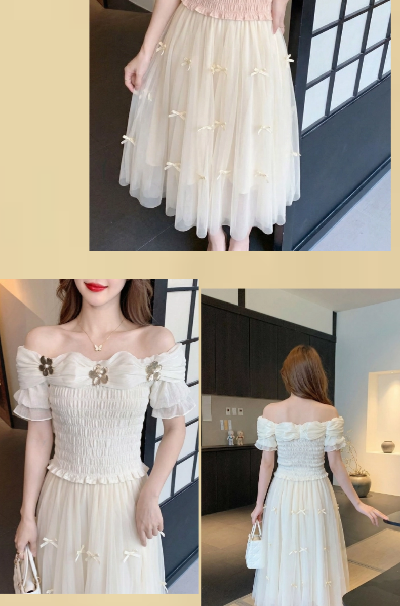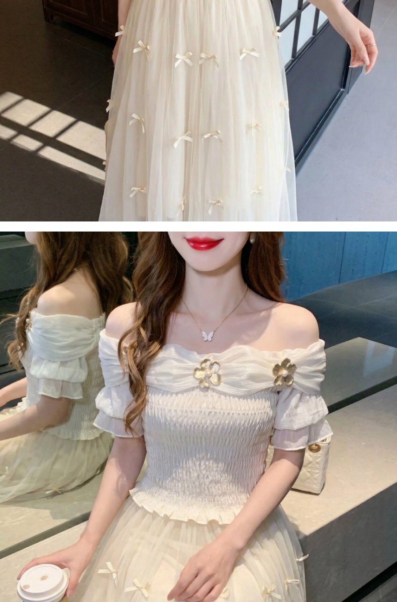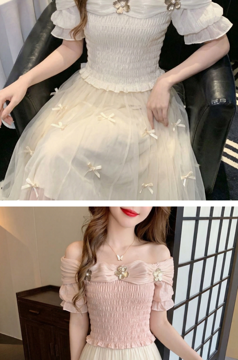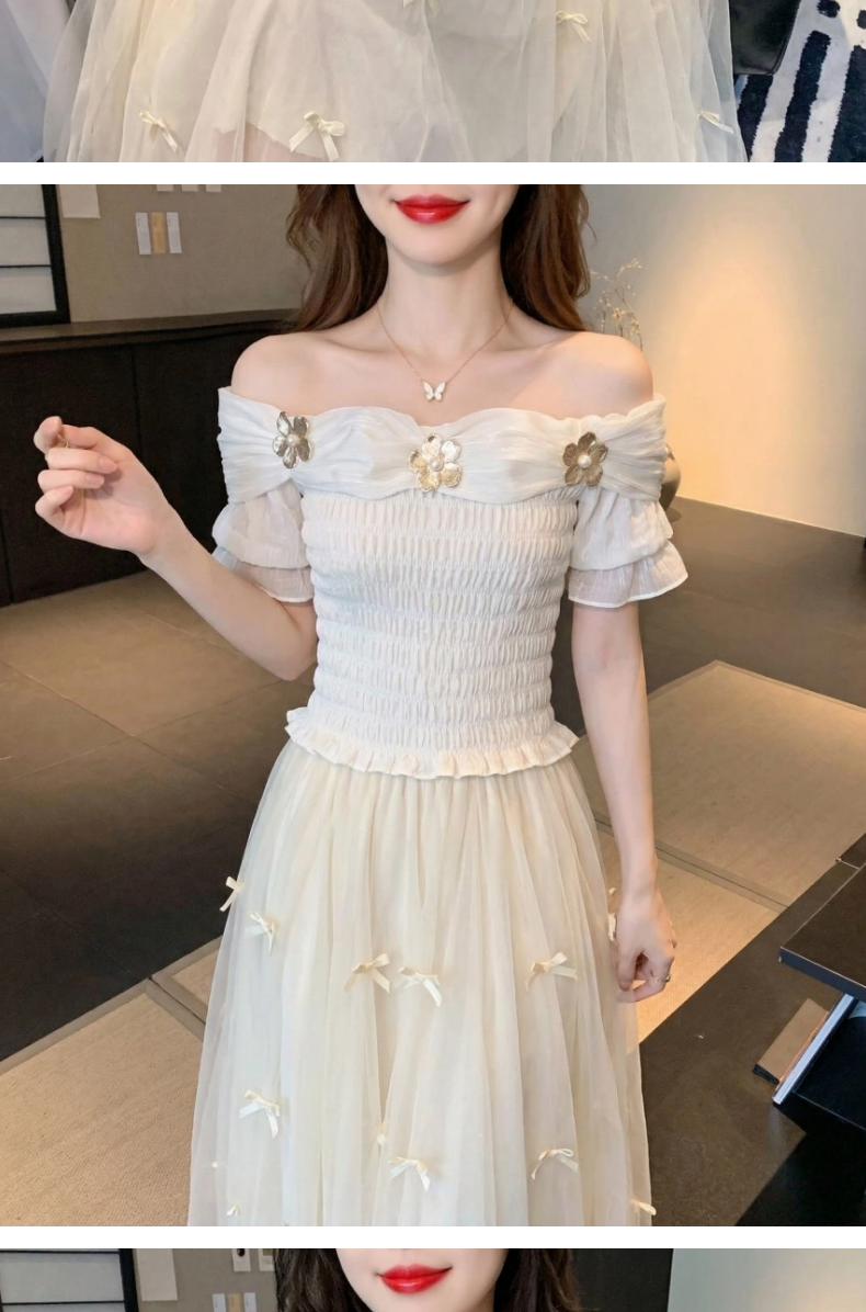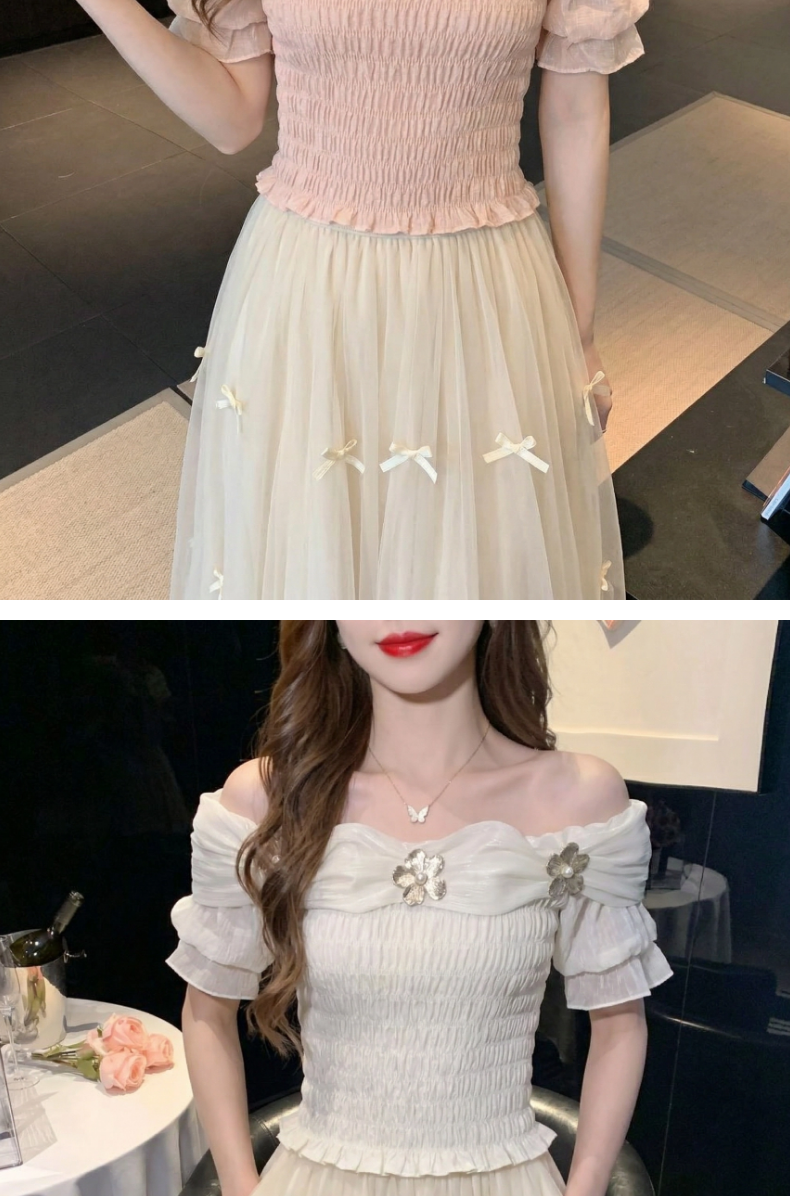 2026实拍夏季一字肩金属花朵雪纺衫女法式性感收腰显瘦别致上衣潮