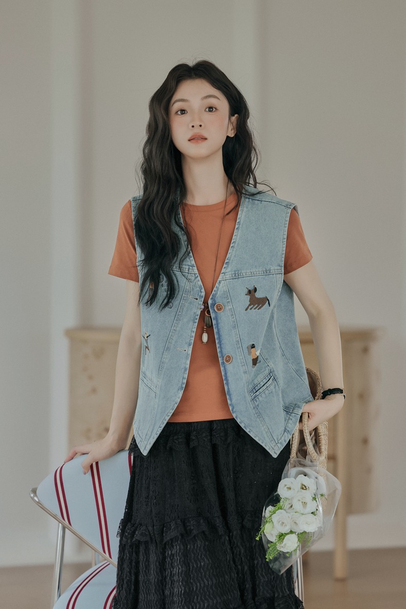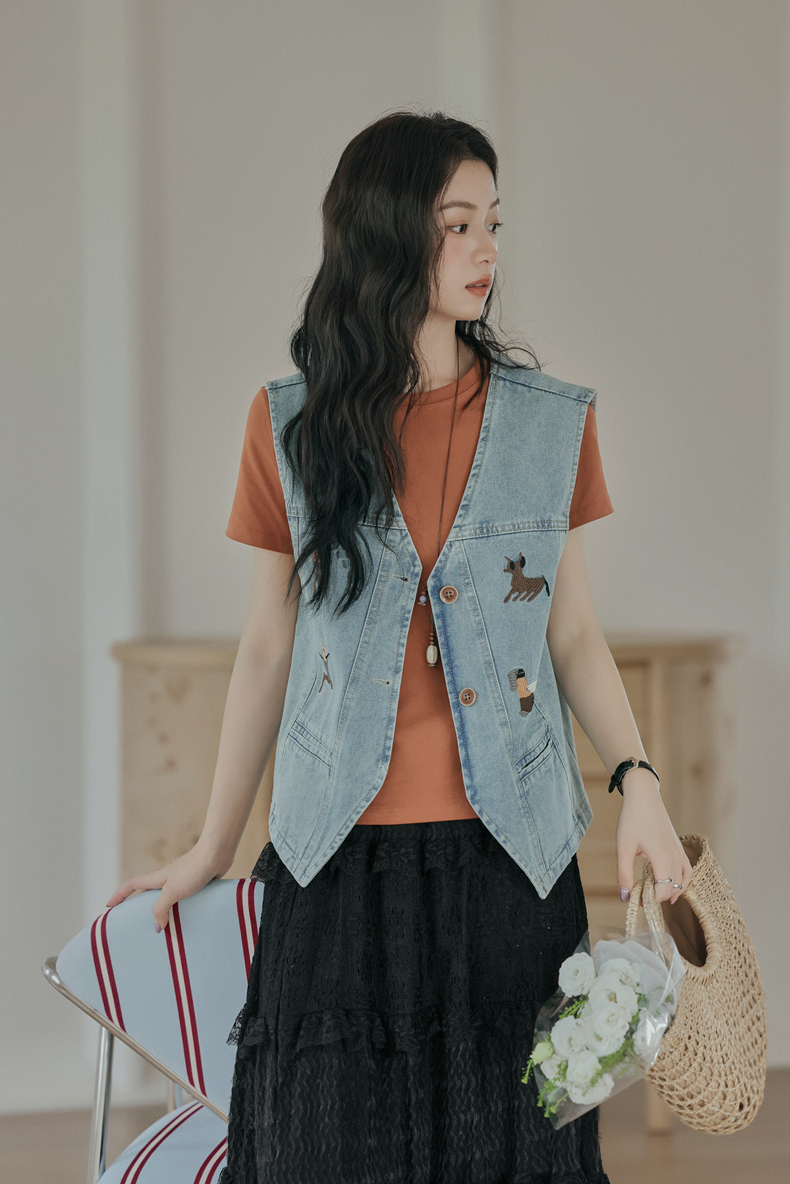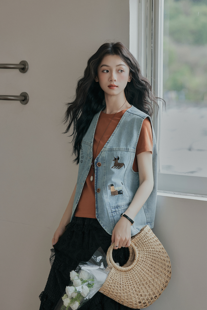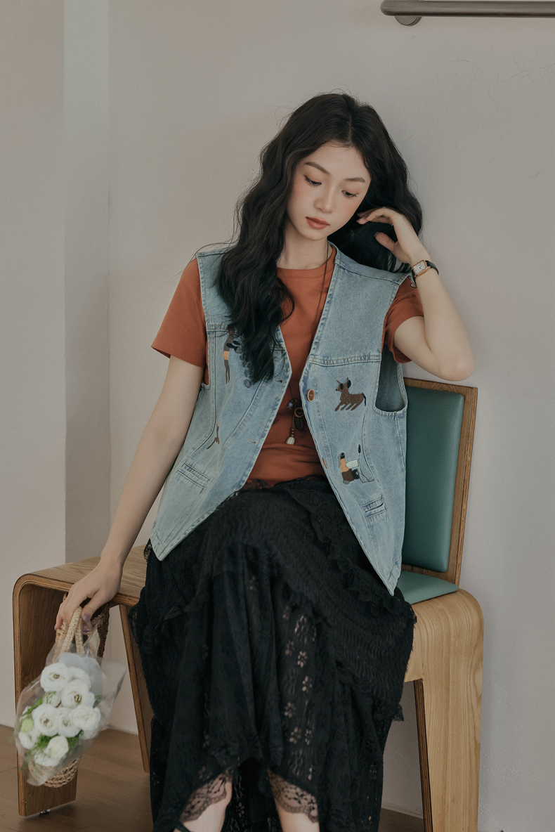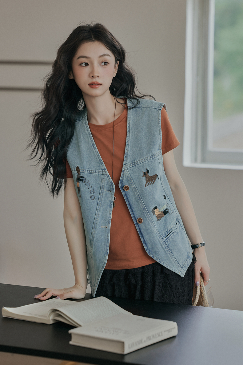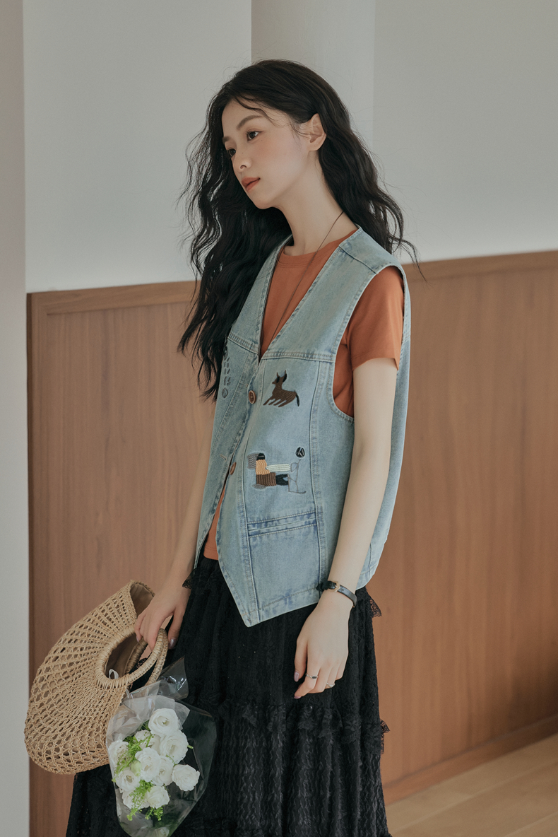 复古刺绣牛仔马甲女装无袖宽松坎肩背心外套设计感小个子春款新款