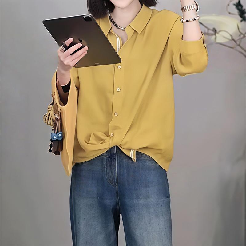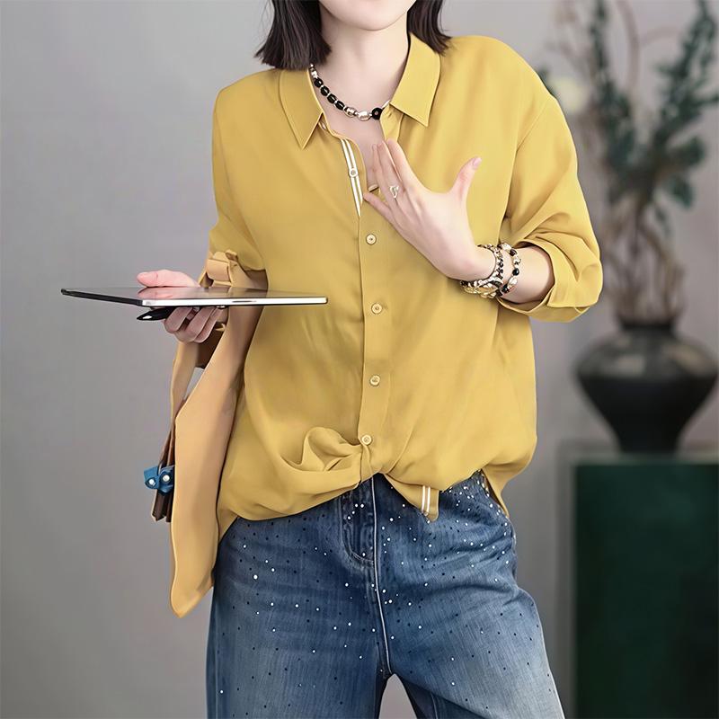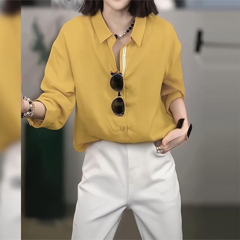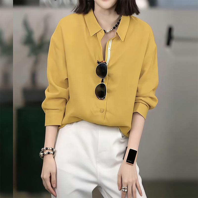 复古黄色polo领薄款长袖衬衫女2026新款春夏宽松显瘦休闲防晒上衣