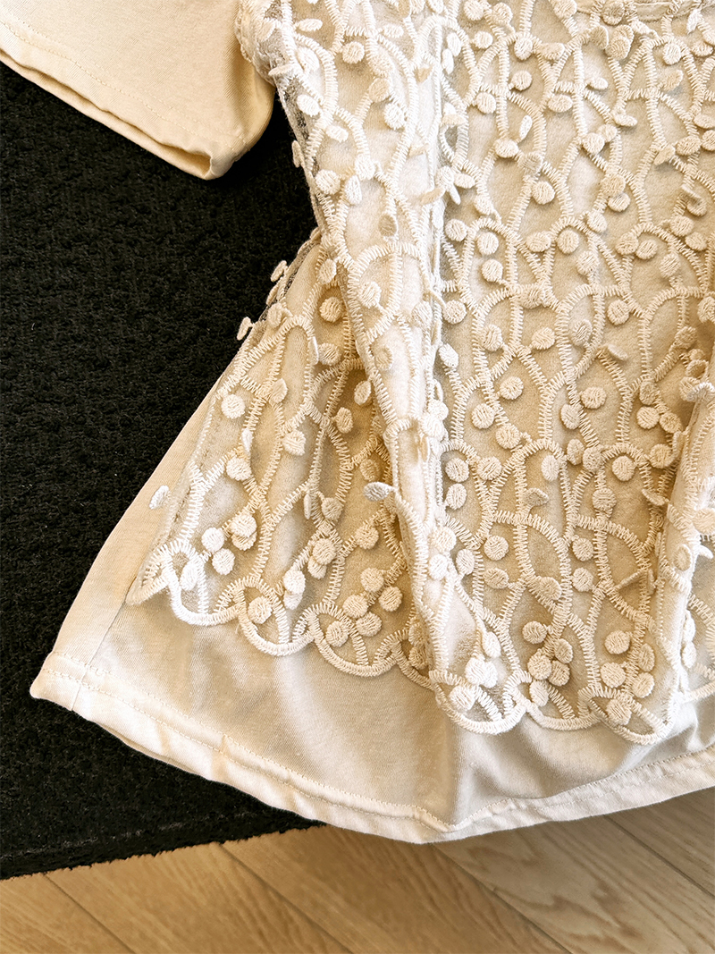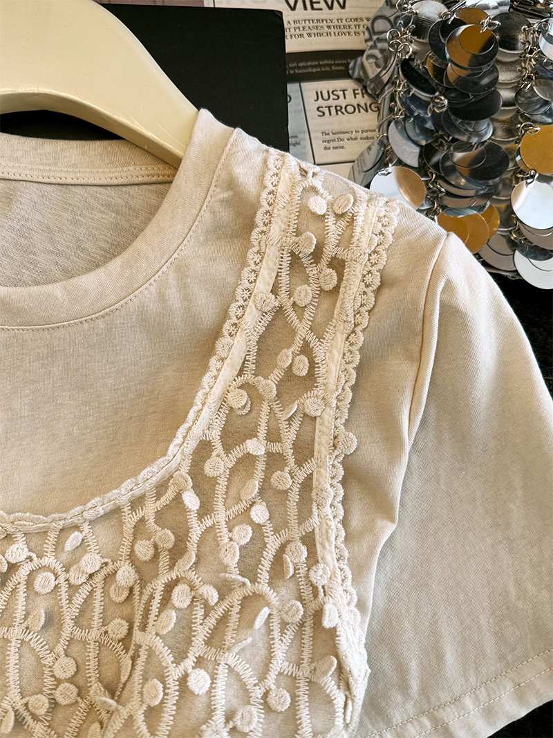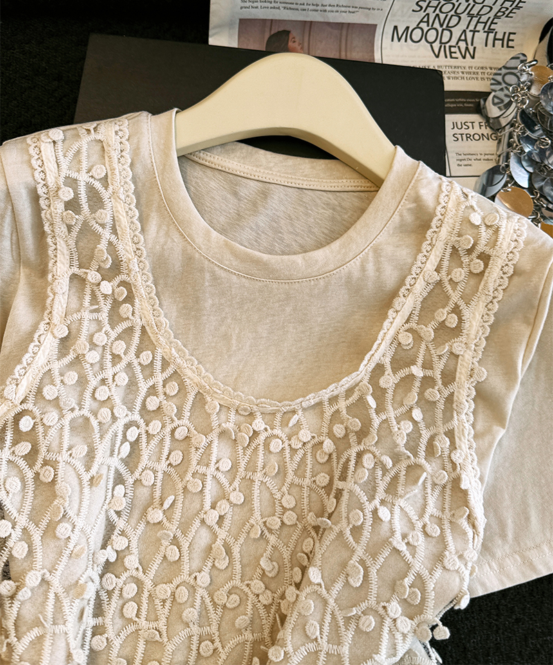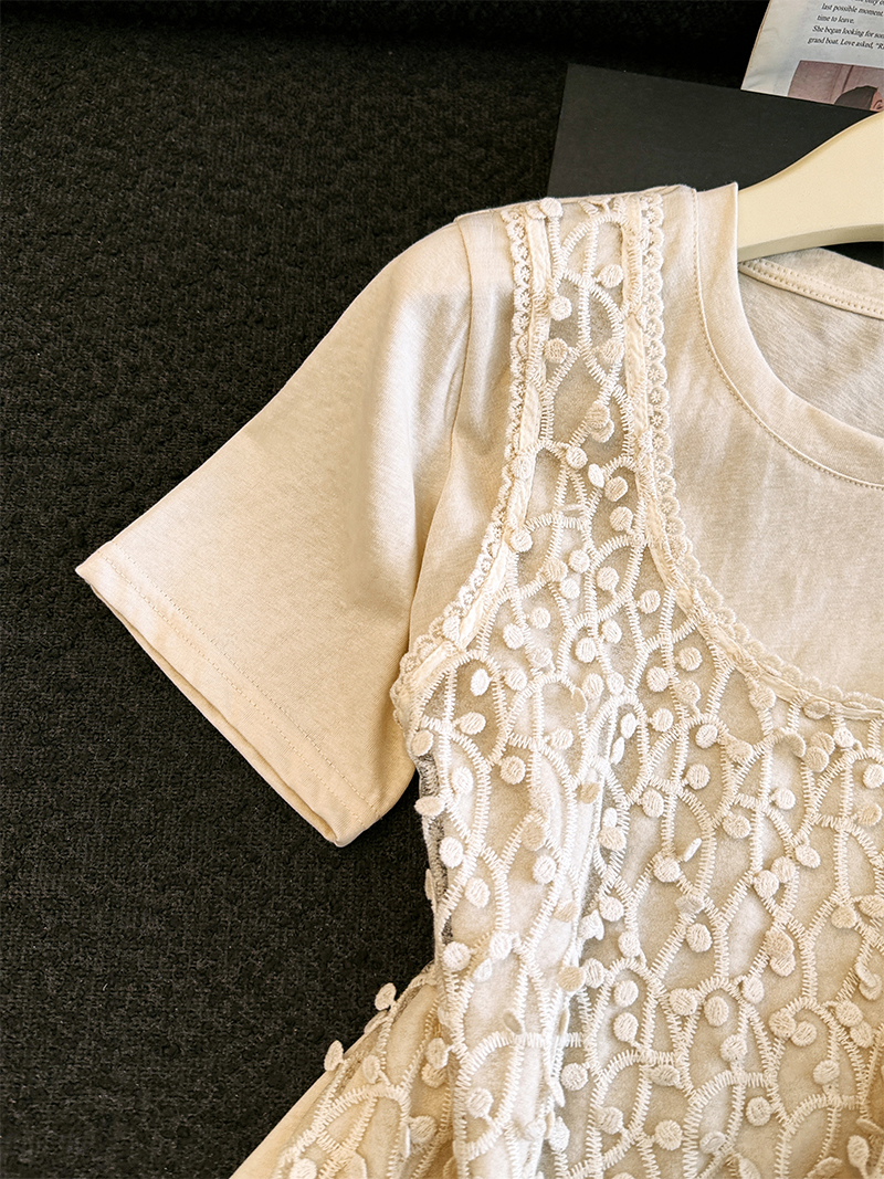 杏色圆领短袖t恤女夏季韩系宽松设计感叠穿蕾丝背心假两件上衣