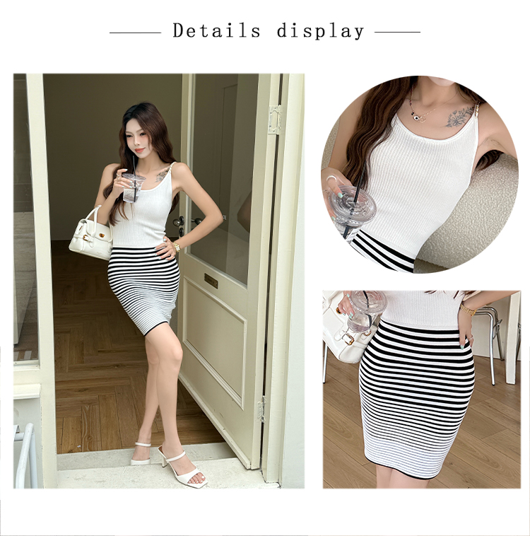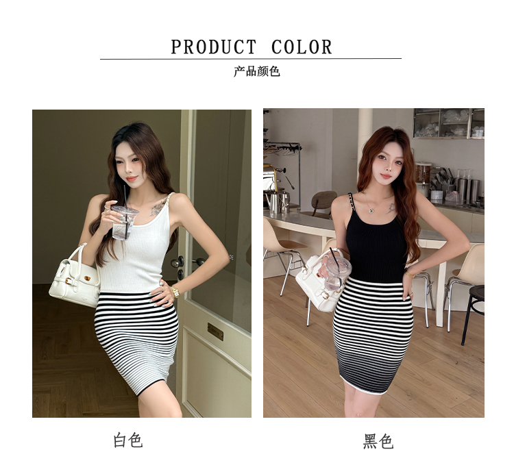 纯欲针织黑白条纹链条吊带连衣裙性感风修身收腰包臀短裙