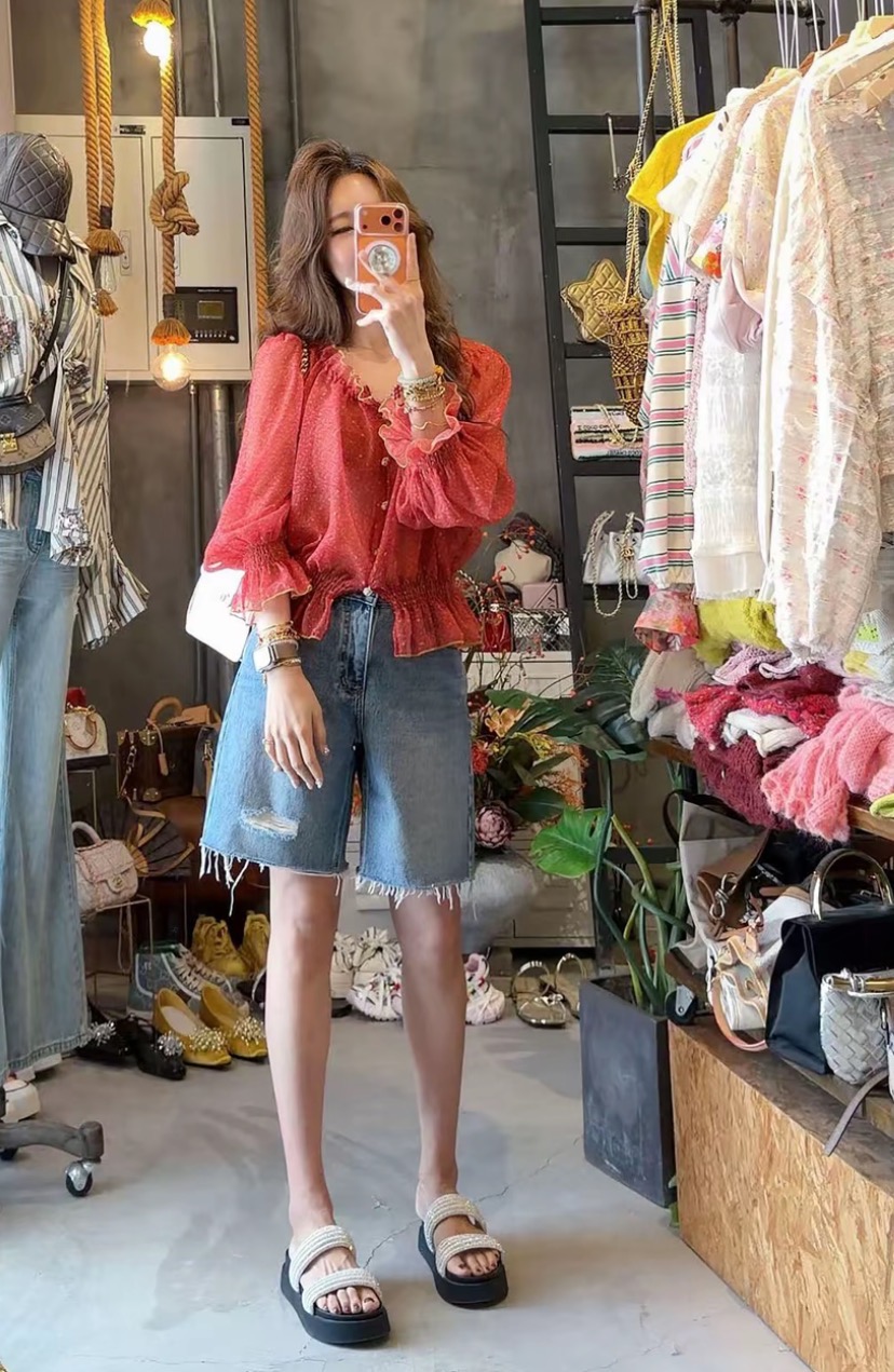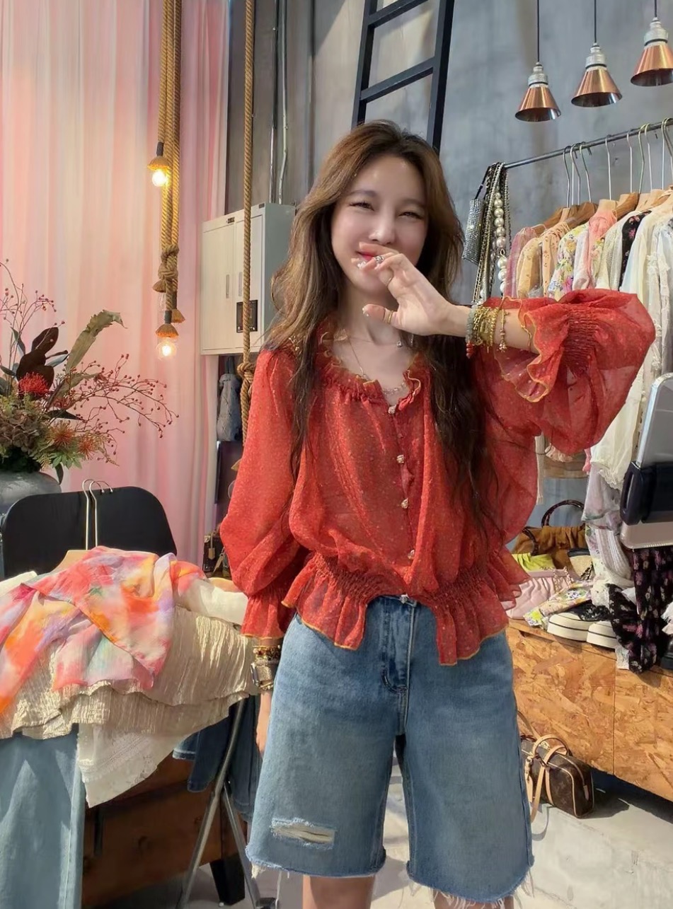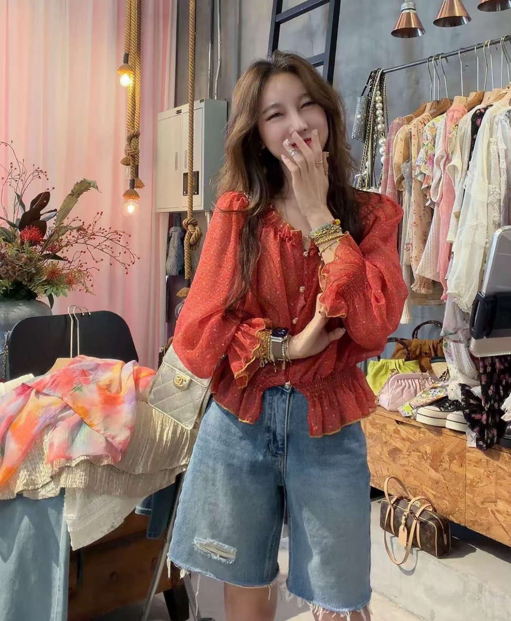 素拉欧尼穿搭韩系复古气质设计碎花泡泡袖显瘦防晒衬衫