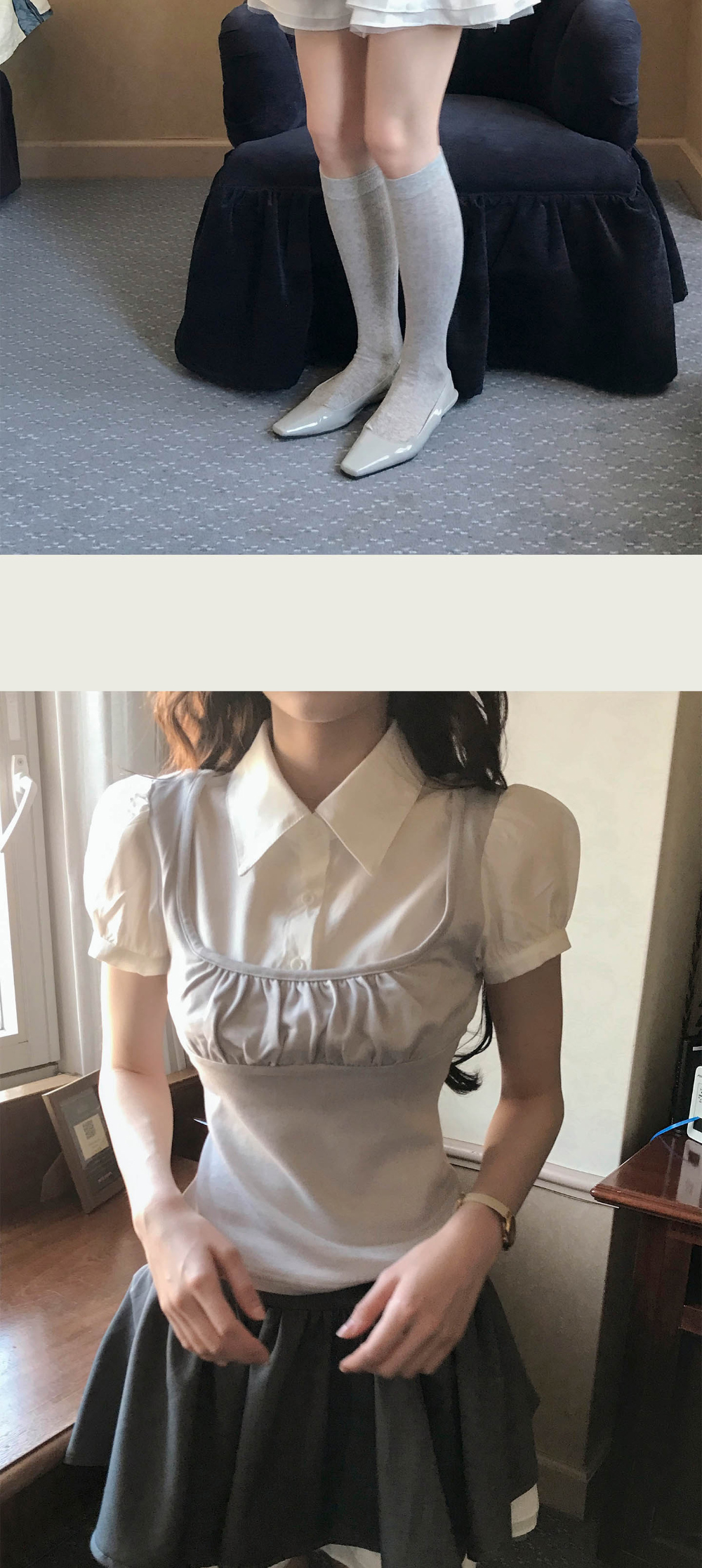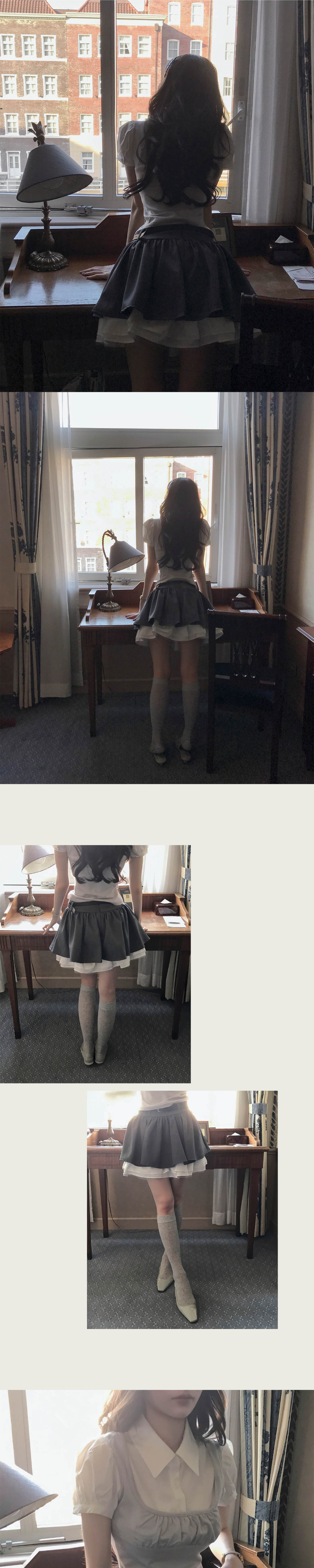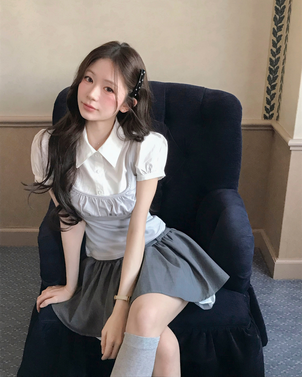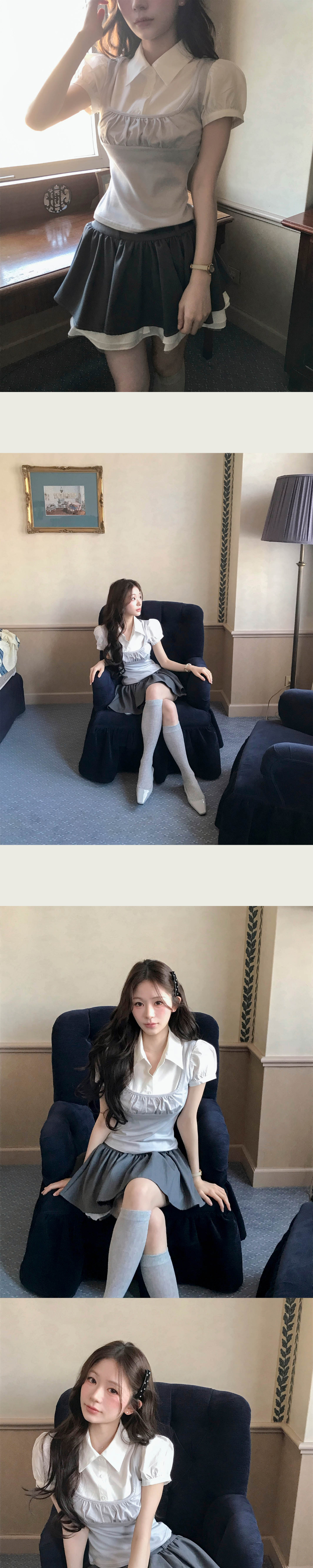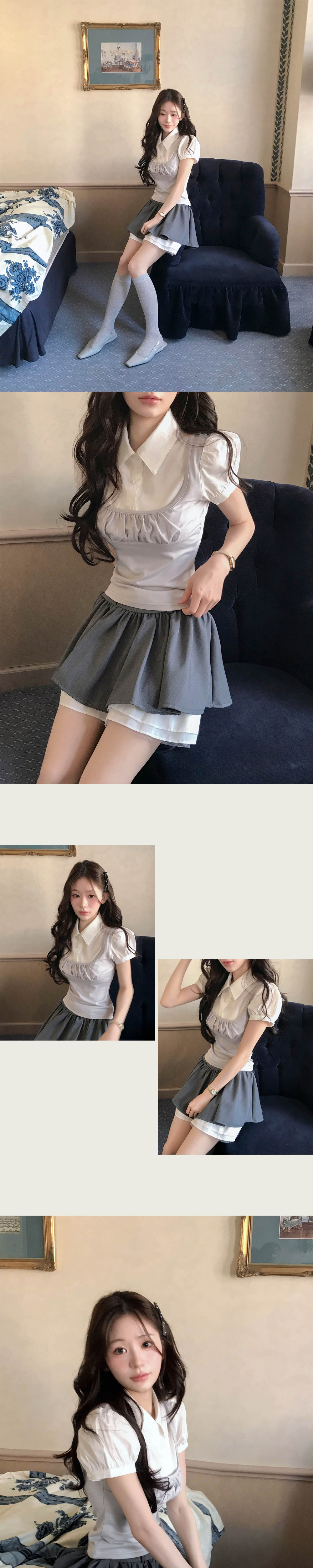 韩系 学院风假两件拼接上衣+假两件半身裙 女 套装