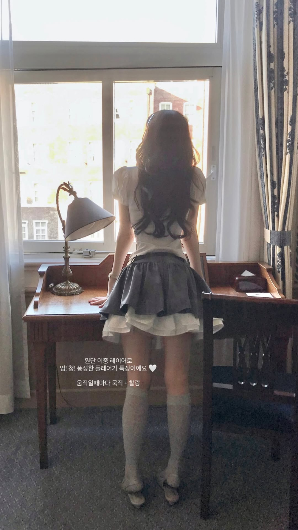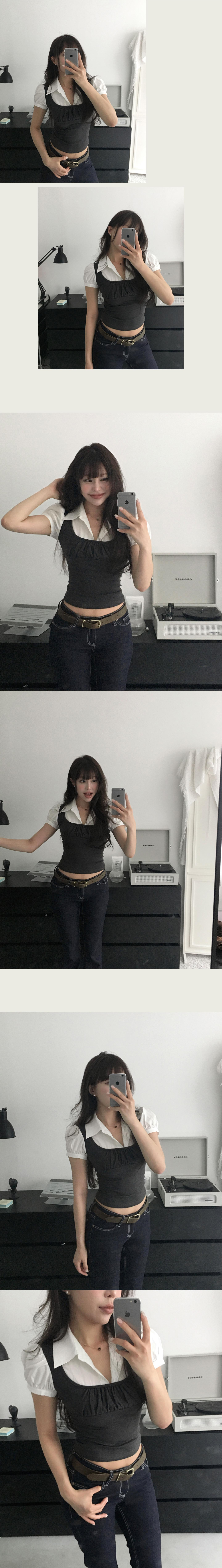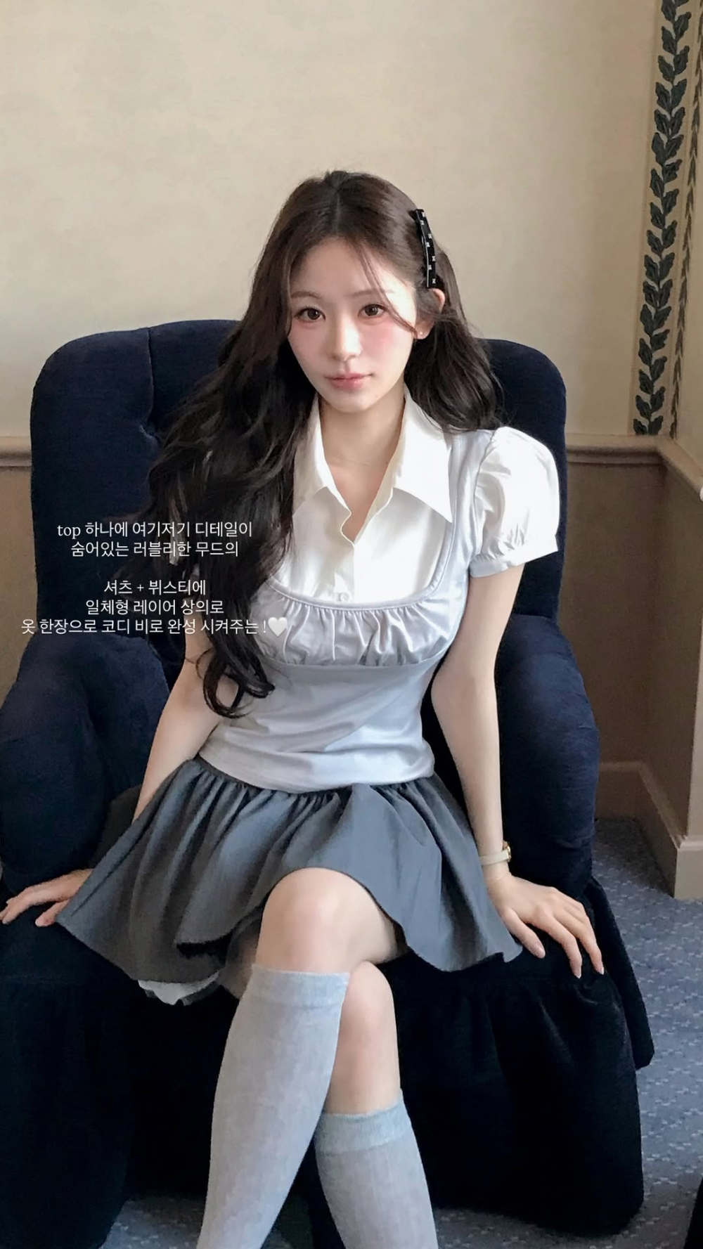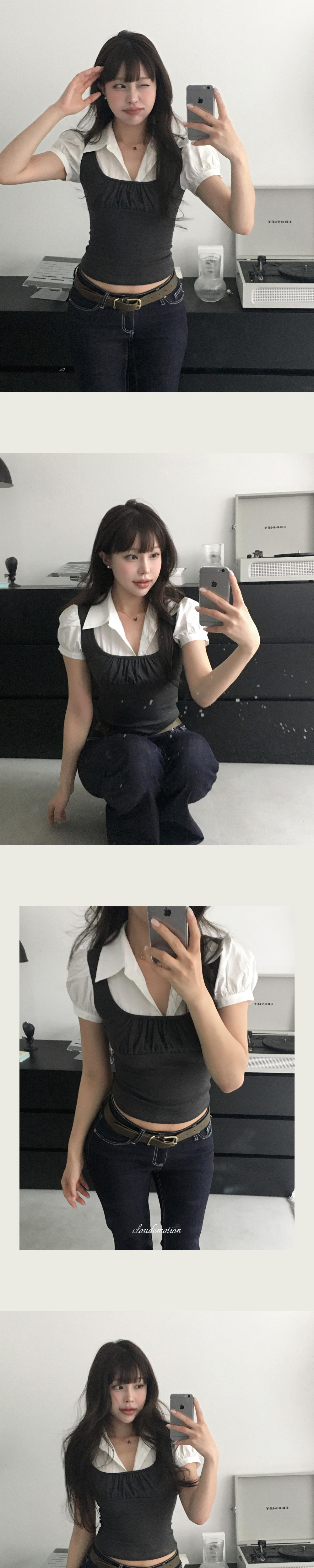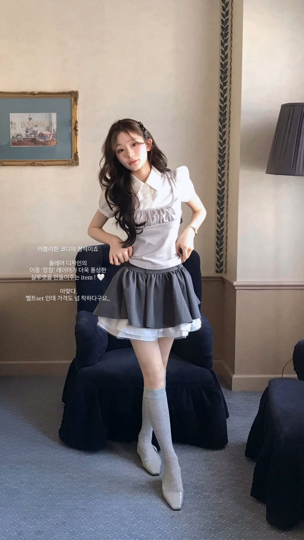 韩系 学院风假两件拼接上衣+假两件半身裙 女 套装