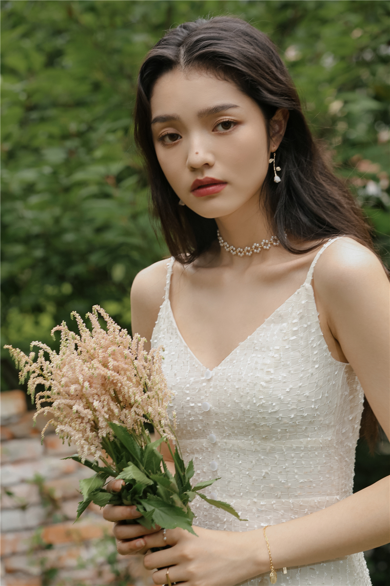 Note: With lining, side zipper, adjustable straps, the fabric is jacquard embroidery with sequins, please be careful not to snag while washing