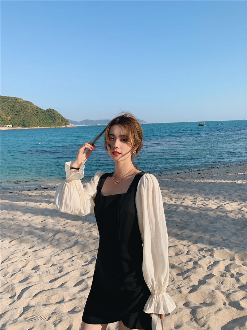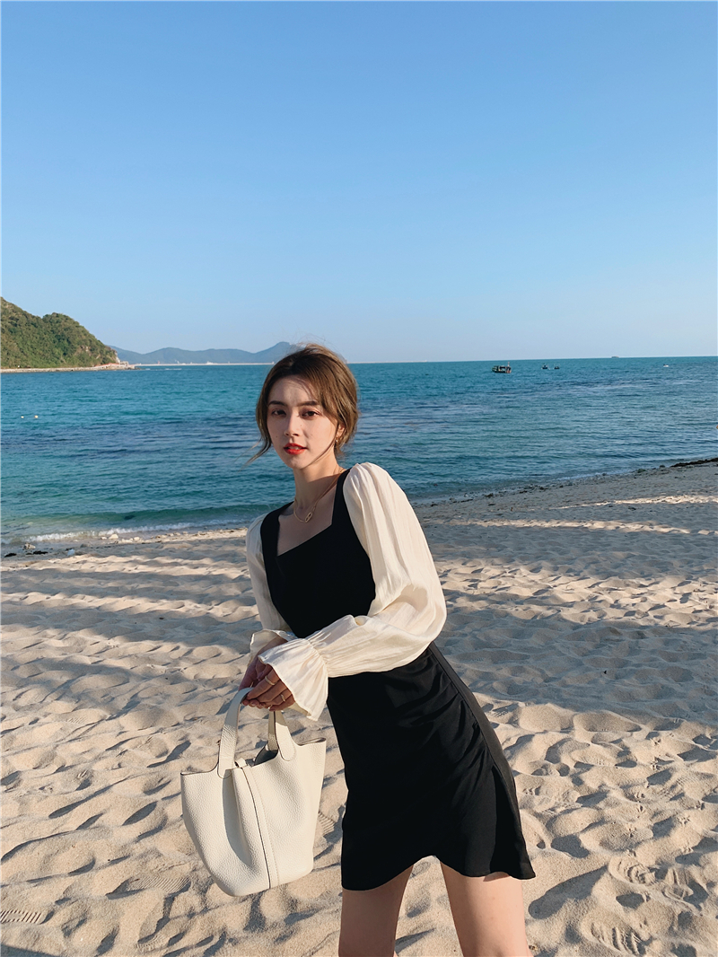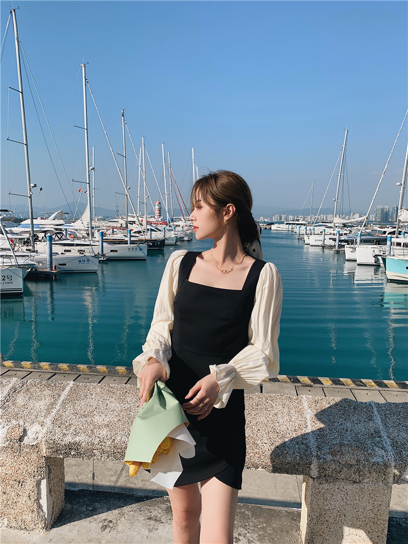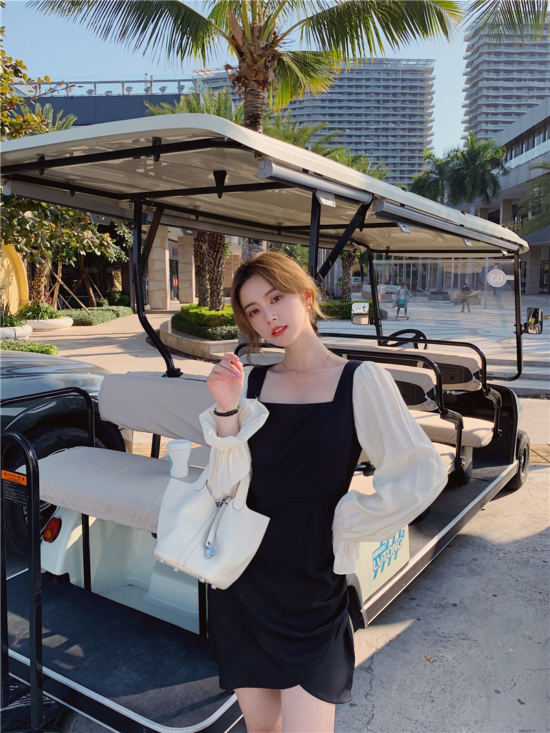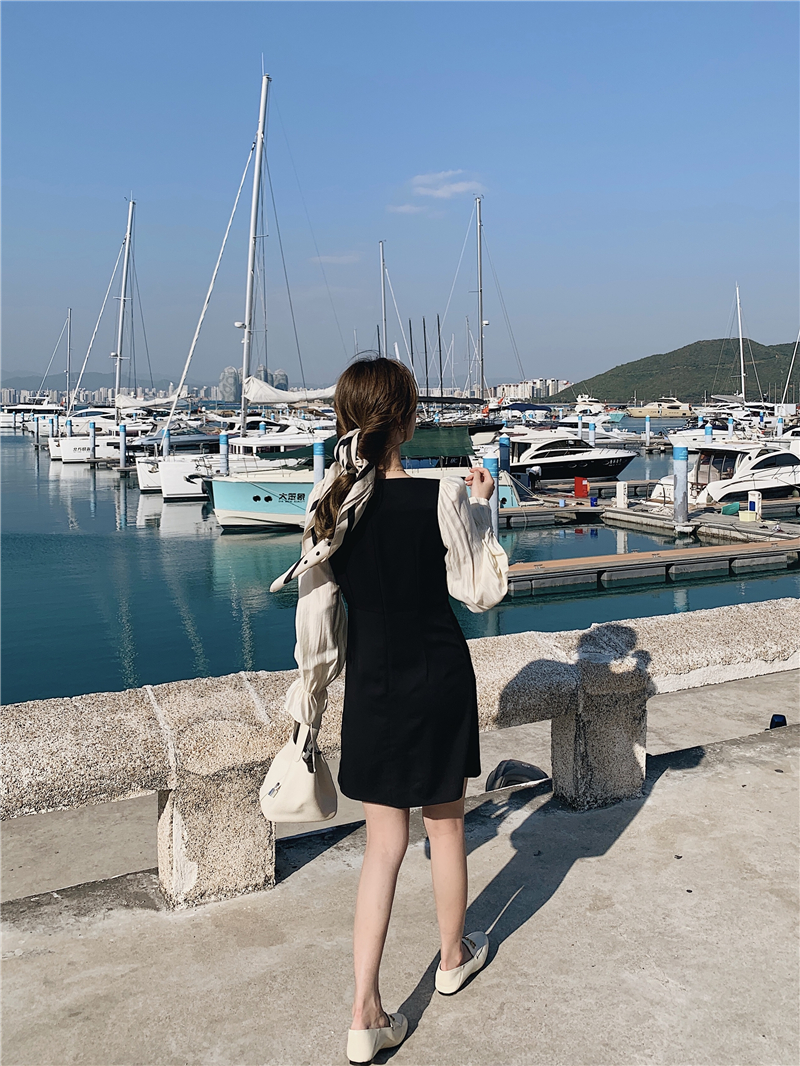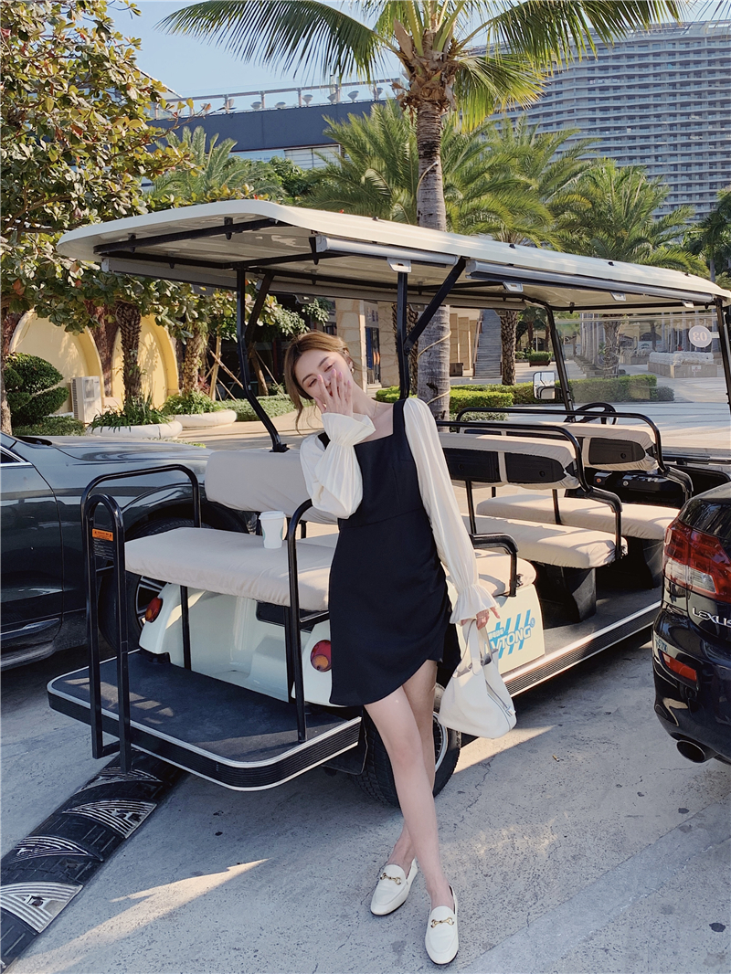 2025 New Spring and Summer Black Slim Dress Spliced Sleeve Short Small Skirt